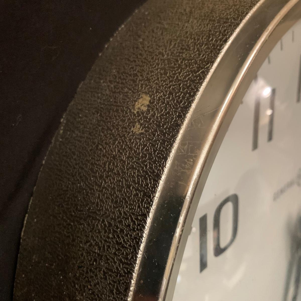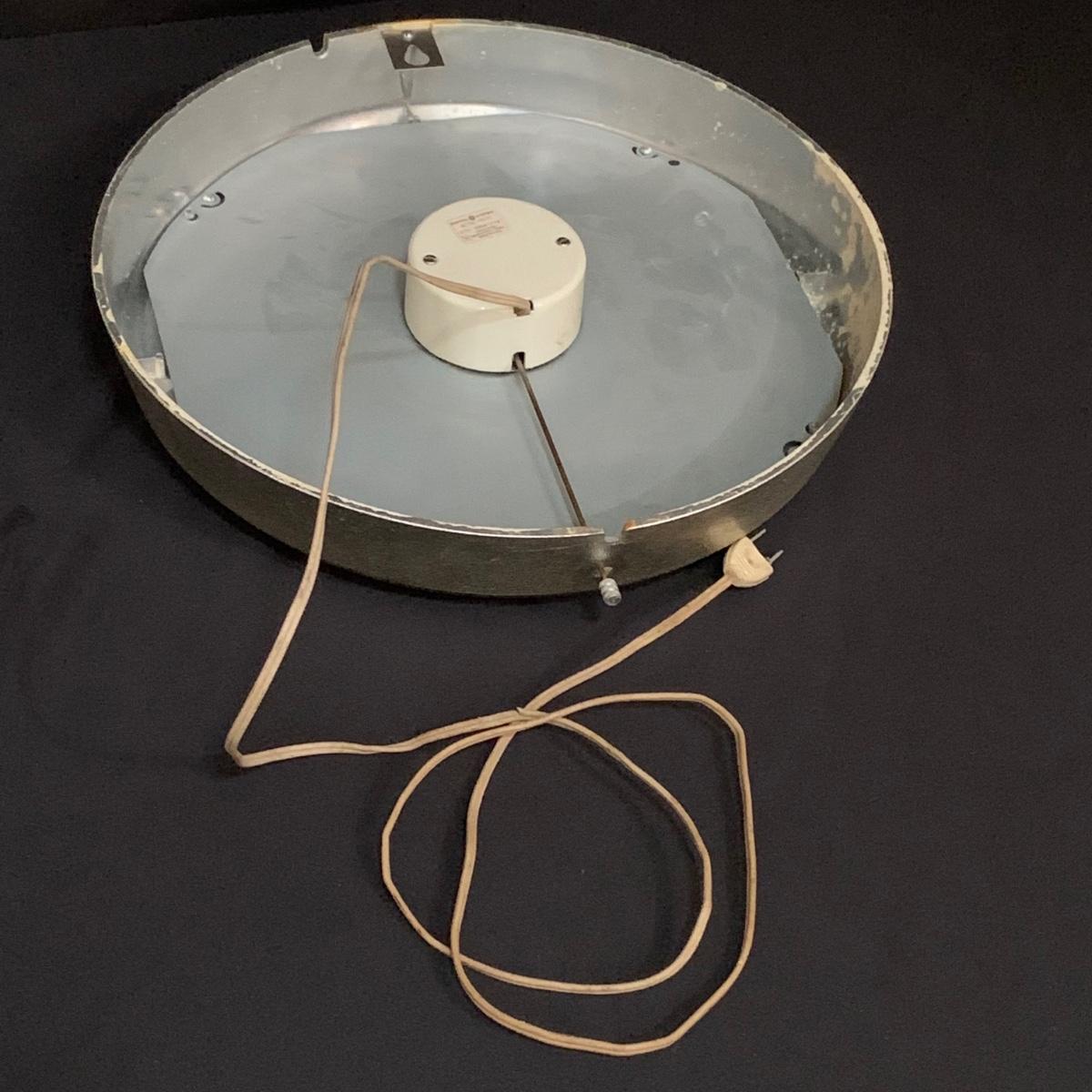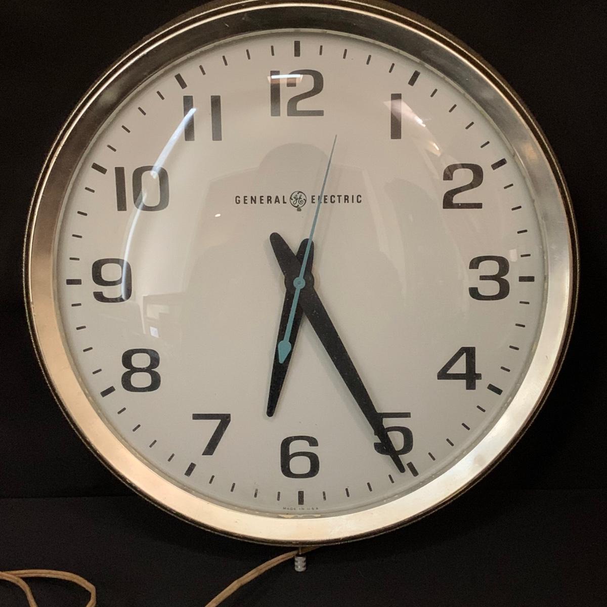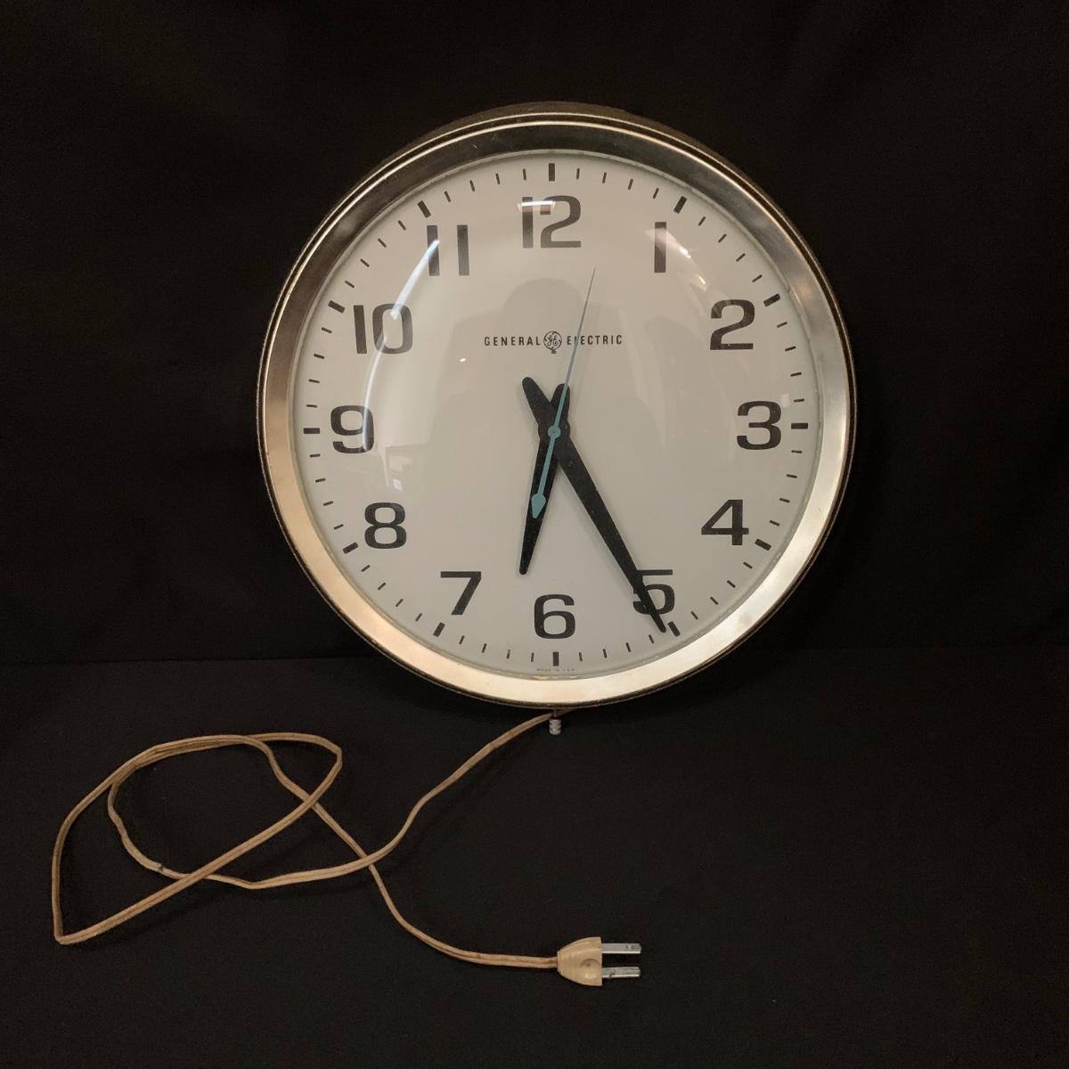Vintage General Electric brand wall cock, Model 2012. Clock has a convex glass front dome with a silver colored plastic frame and a metal back. The frame shows a little wear with some slight chipping of the silver color. Electrical cord has a two-pronged plug. When plugged in, clock functions with blue second hand moving smoothly. Clock measures 14.25”d x 3” deep. Shipping available.
