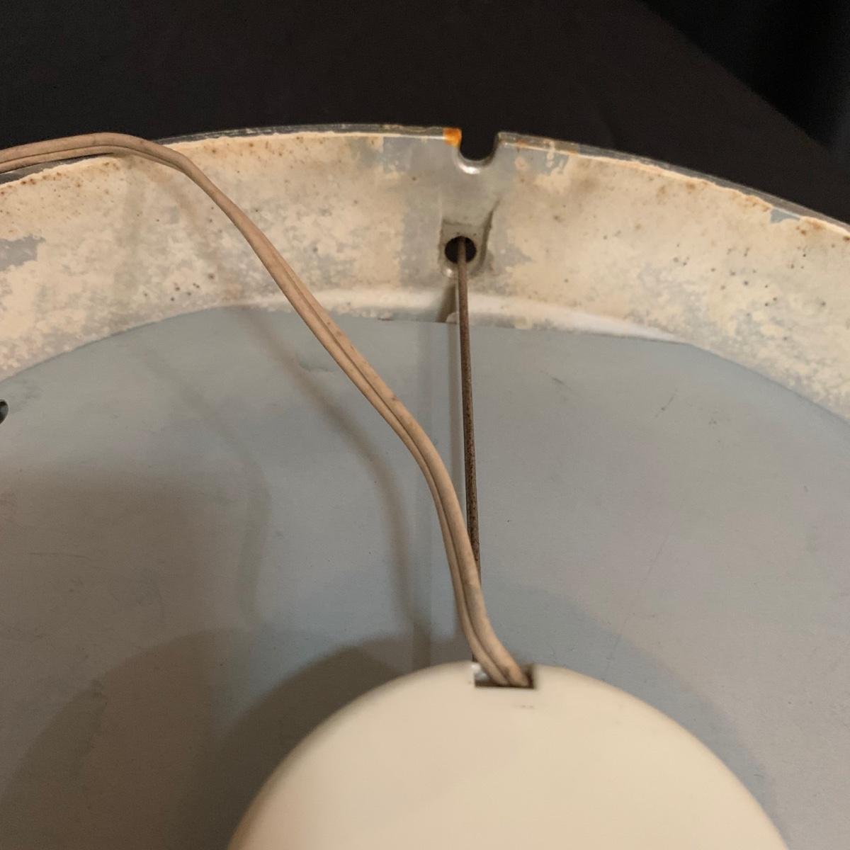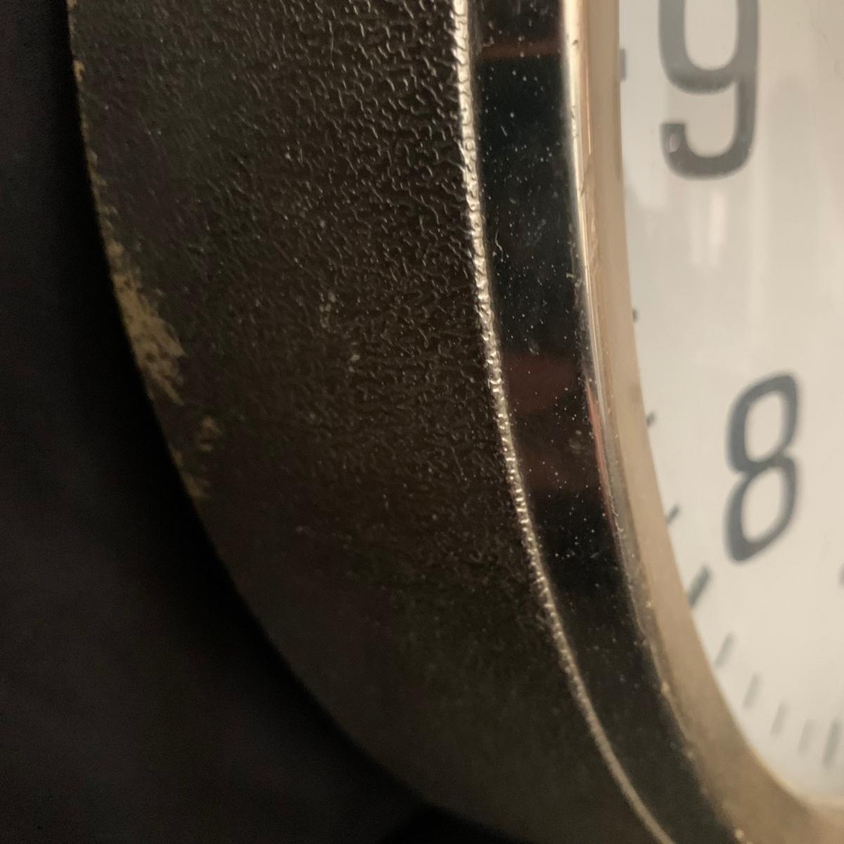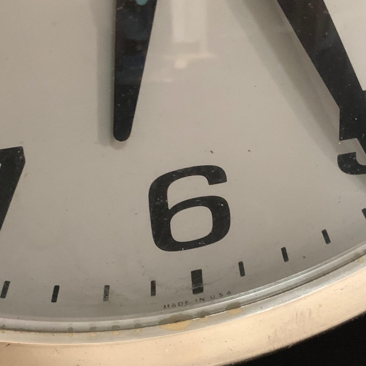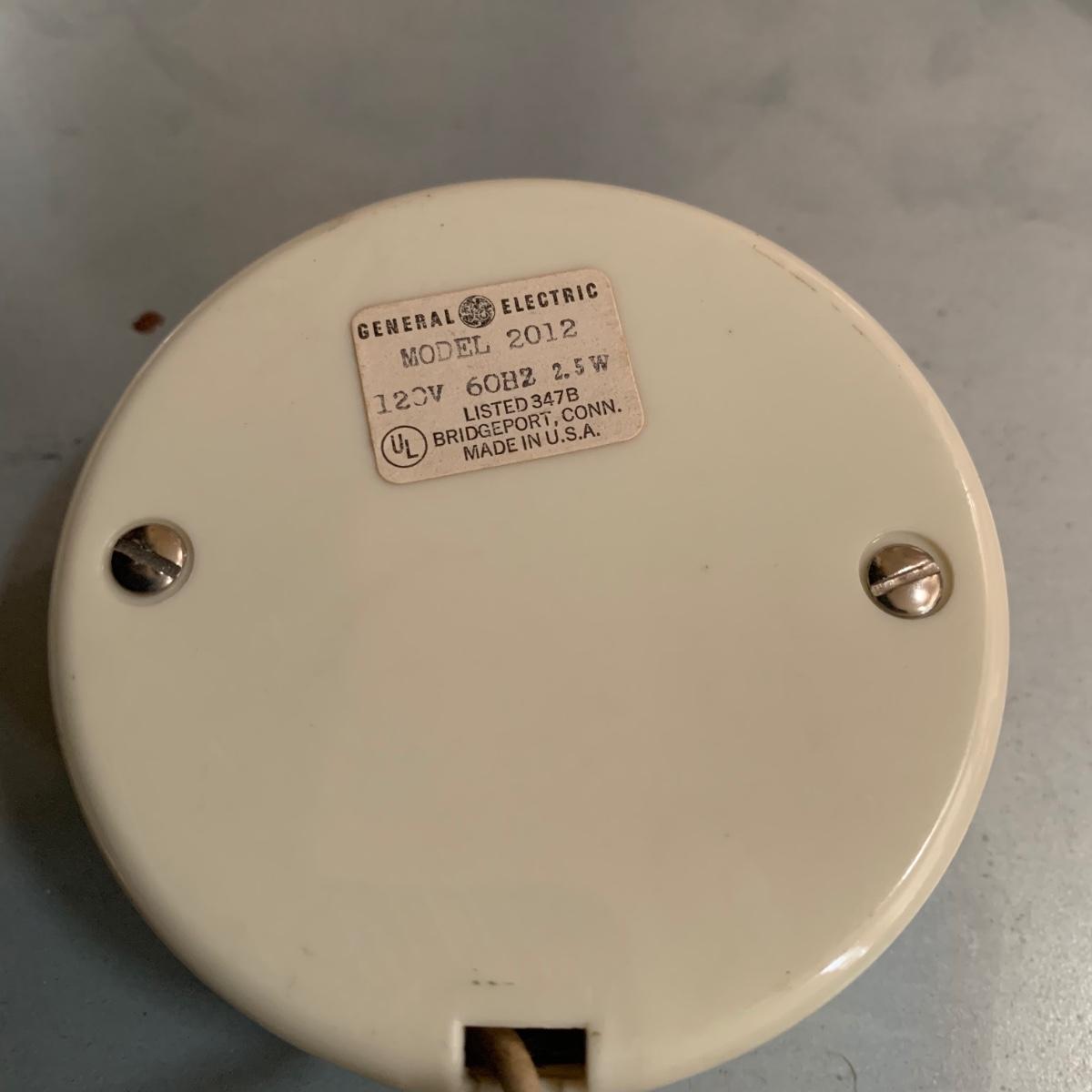 Vintage General Electric brand wall cock, Model 2012. Clock has a convex glass front dome with a silver colored plastic frame and a metal back. The frame shows a little wear with some slight chipping of the silver color. Electrical cord has a two-pronged plug. When plugged in, clock functions with blue second hand moving smoothly. Clock measures 14.25”d x 3” deep. Shipping available.