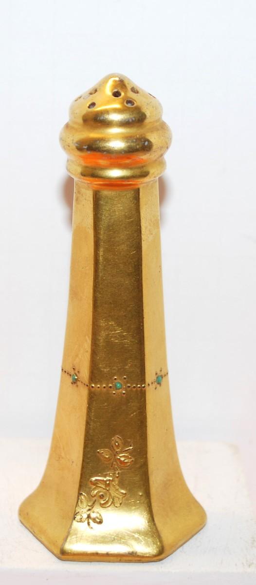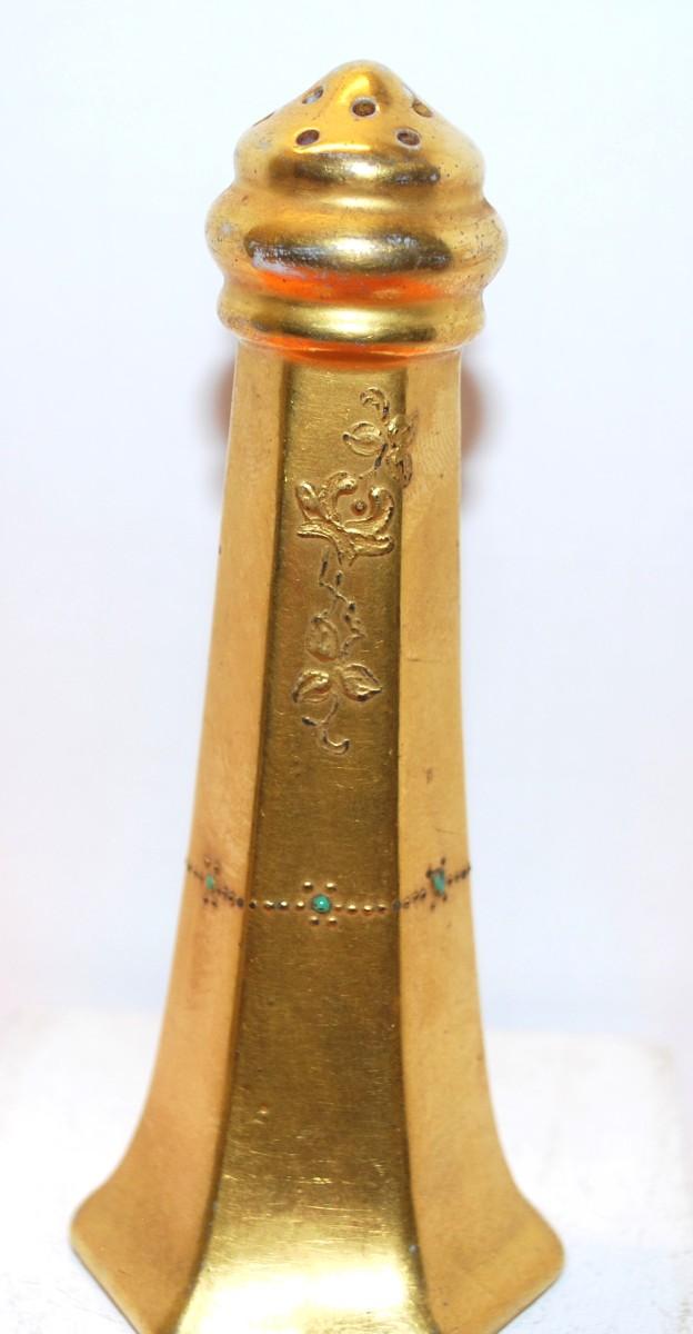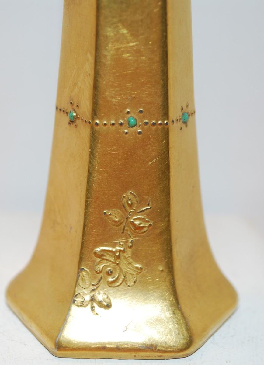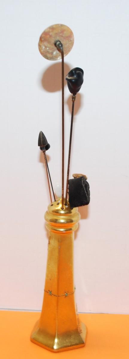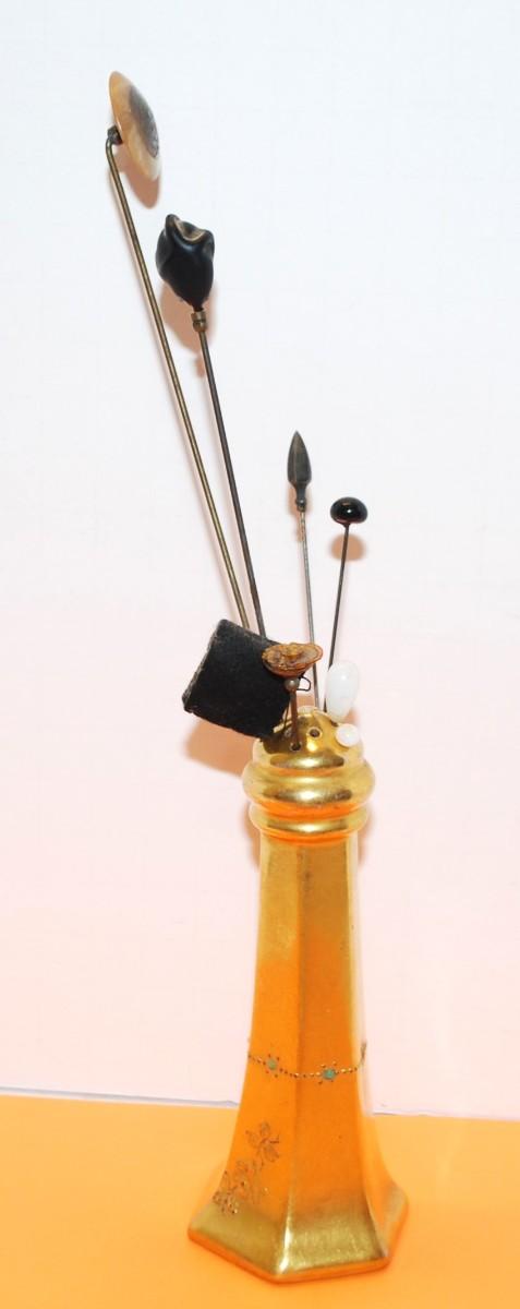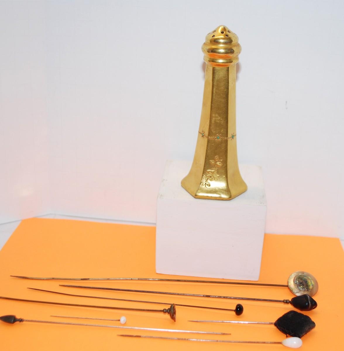 Vintage Gently Embossed Hatpin Holder (5" H) with Jade-Like Accent Stones and 8 Hat Pins 2"-9 " L