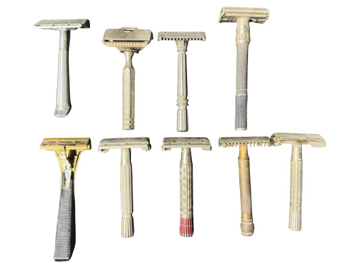 Includes five straight razors, and nine safety razors. Makers include Gillette, and many others. Age related wear. [KD]