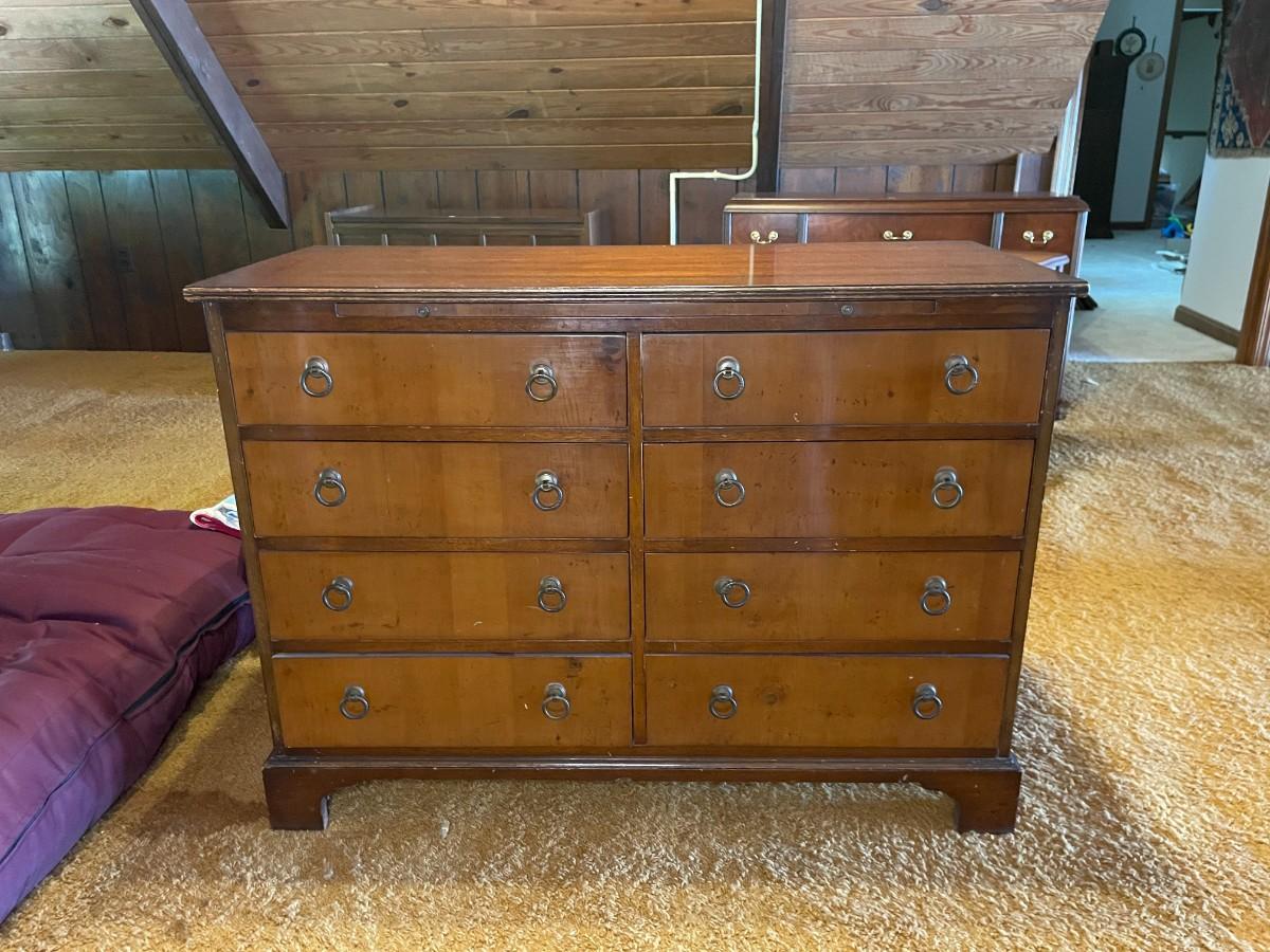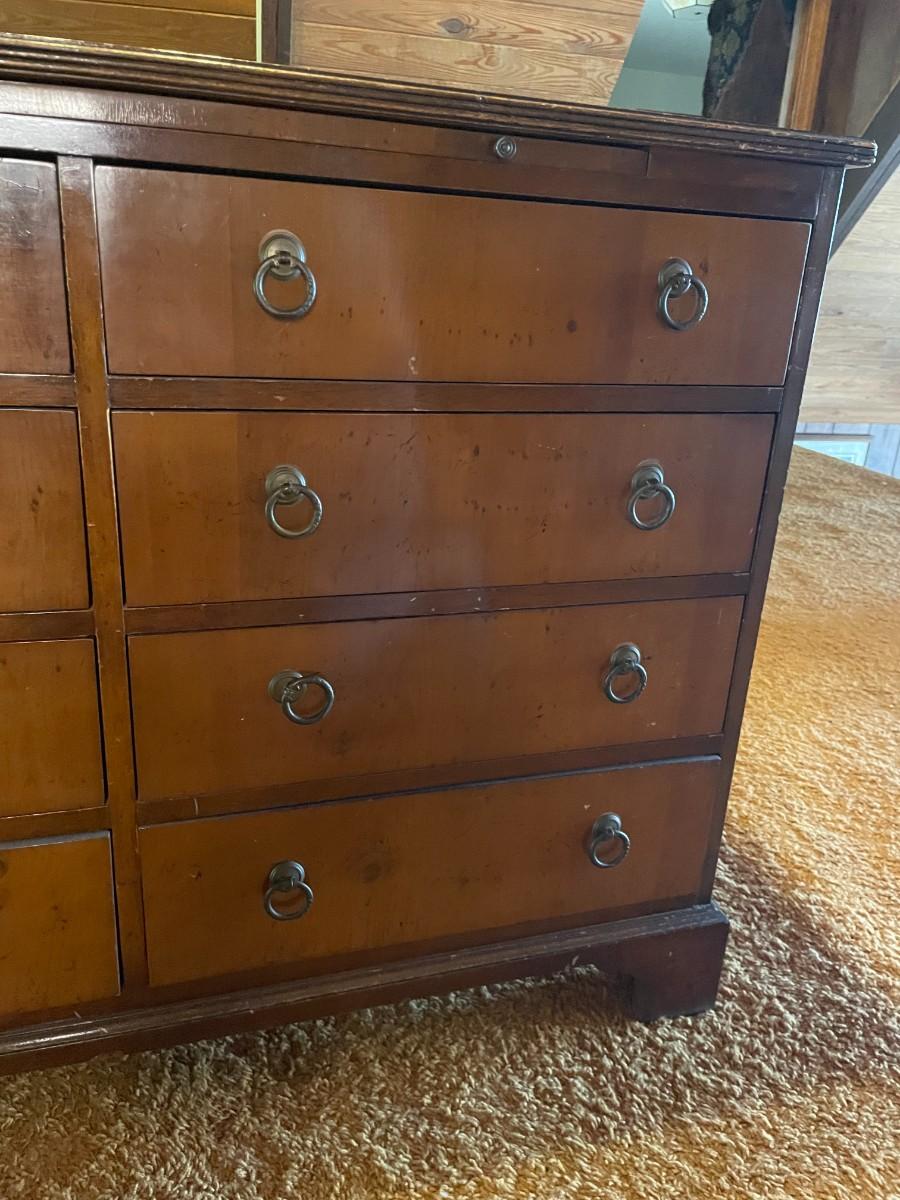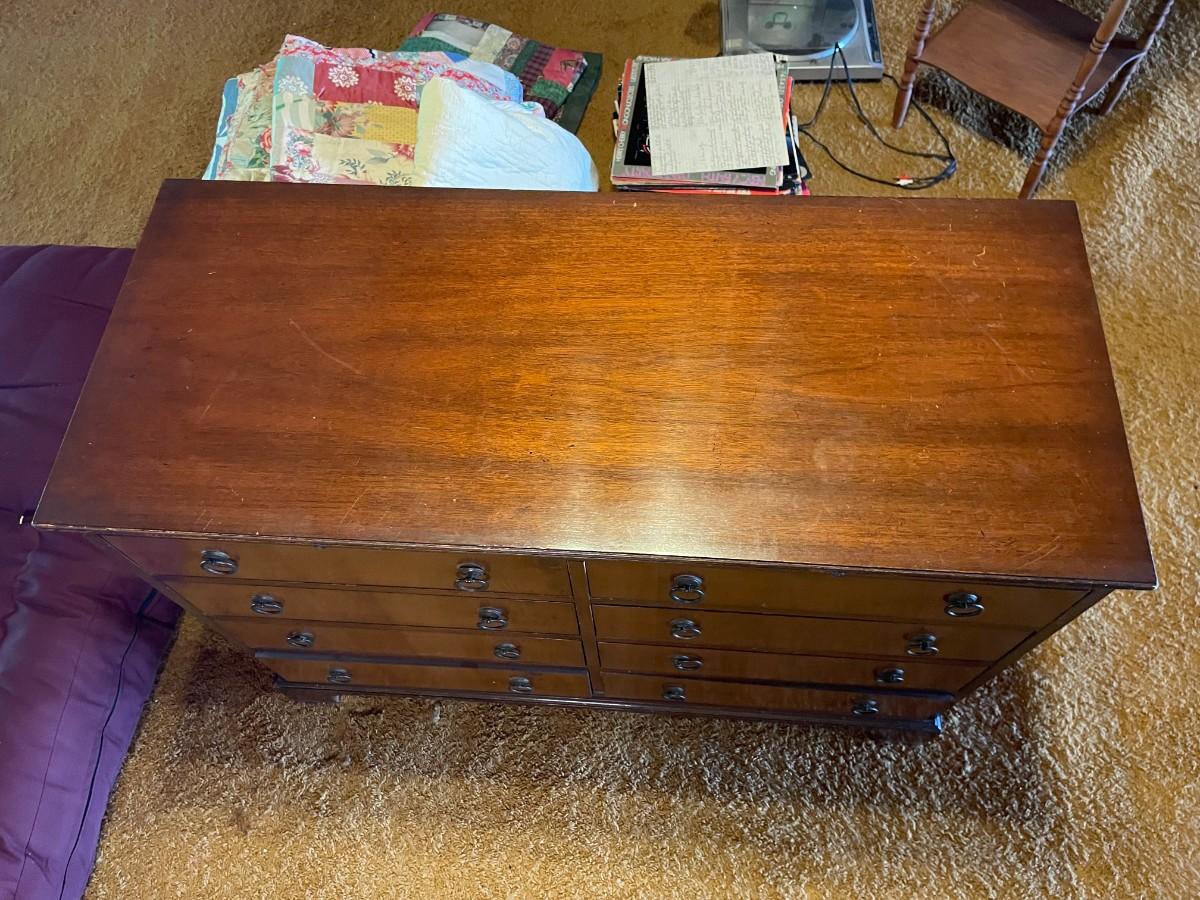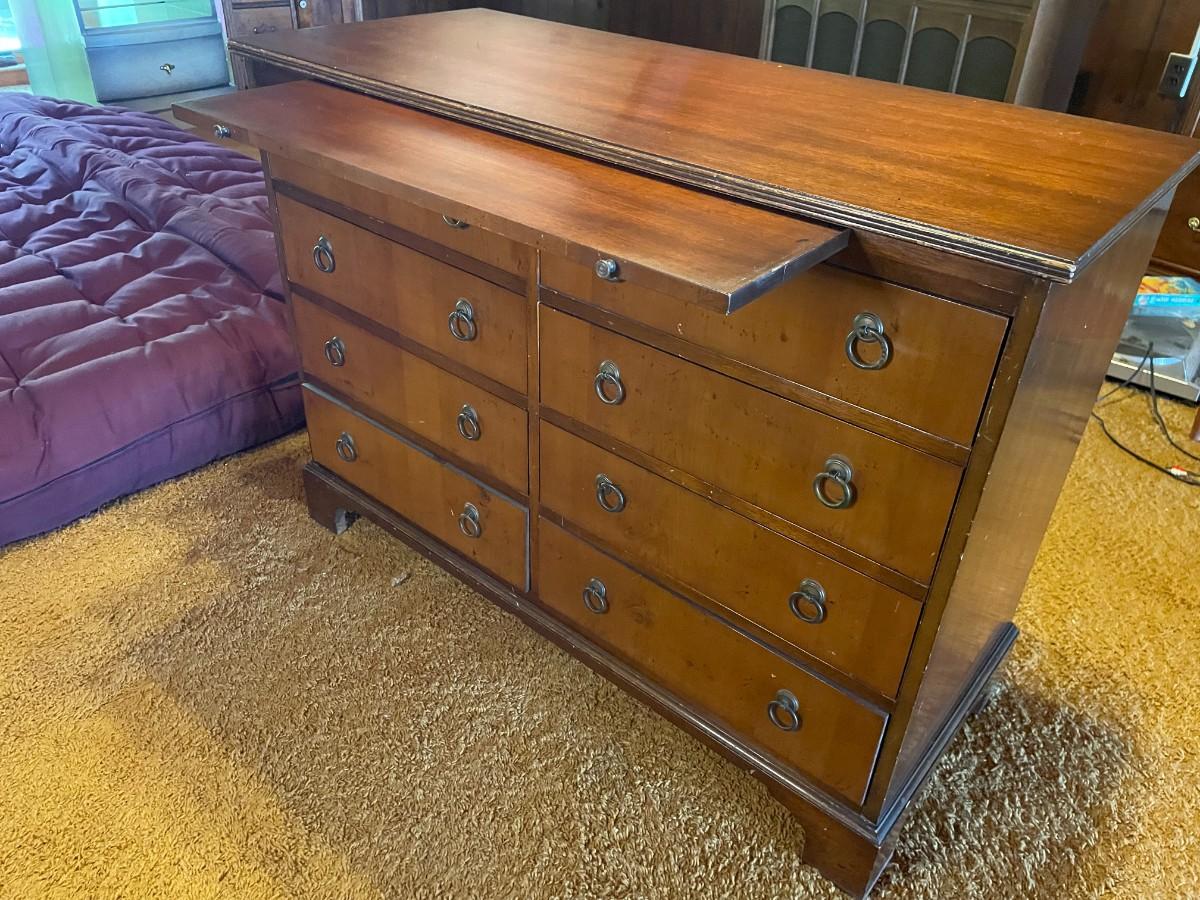 This beautiful piece has 8 drawers and a pull-out shelf. It is "Genuine Mahogany from Mahogany Associate INC." See photo for official Label. 40L x 17W x 29 1/2H.