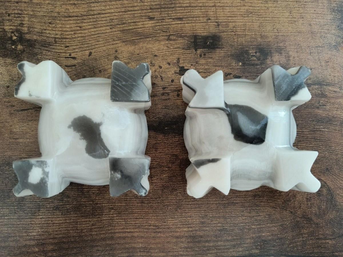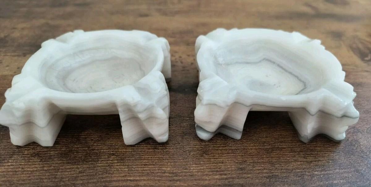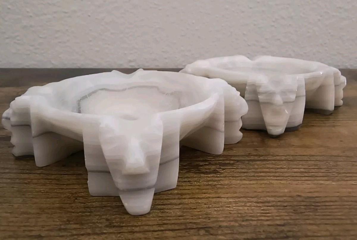 Vintage alabaster onyx stone ashtray etched tribal Mexican Aztec geometric, set of 2