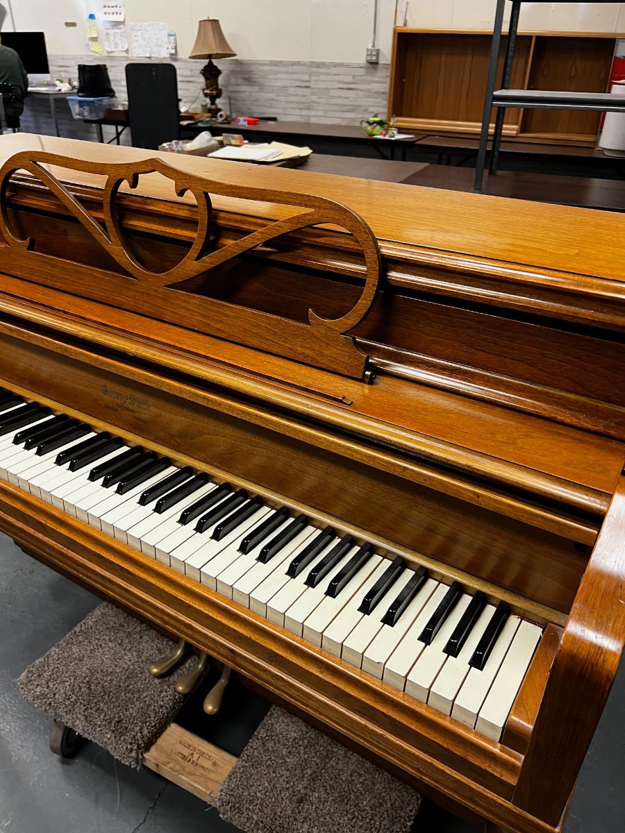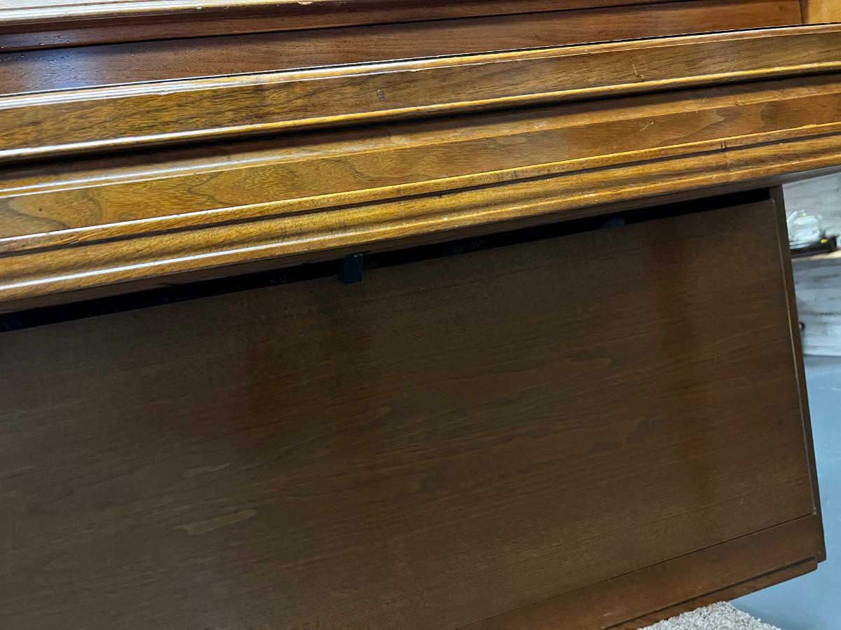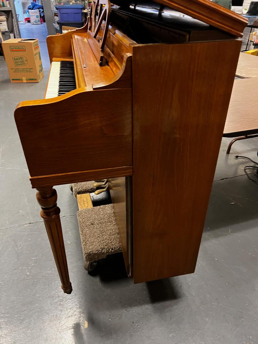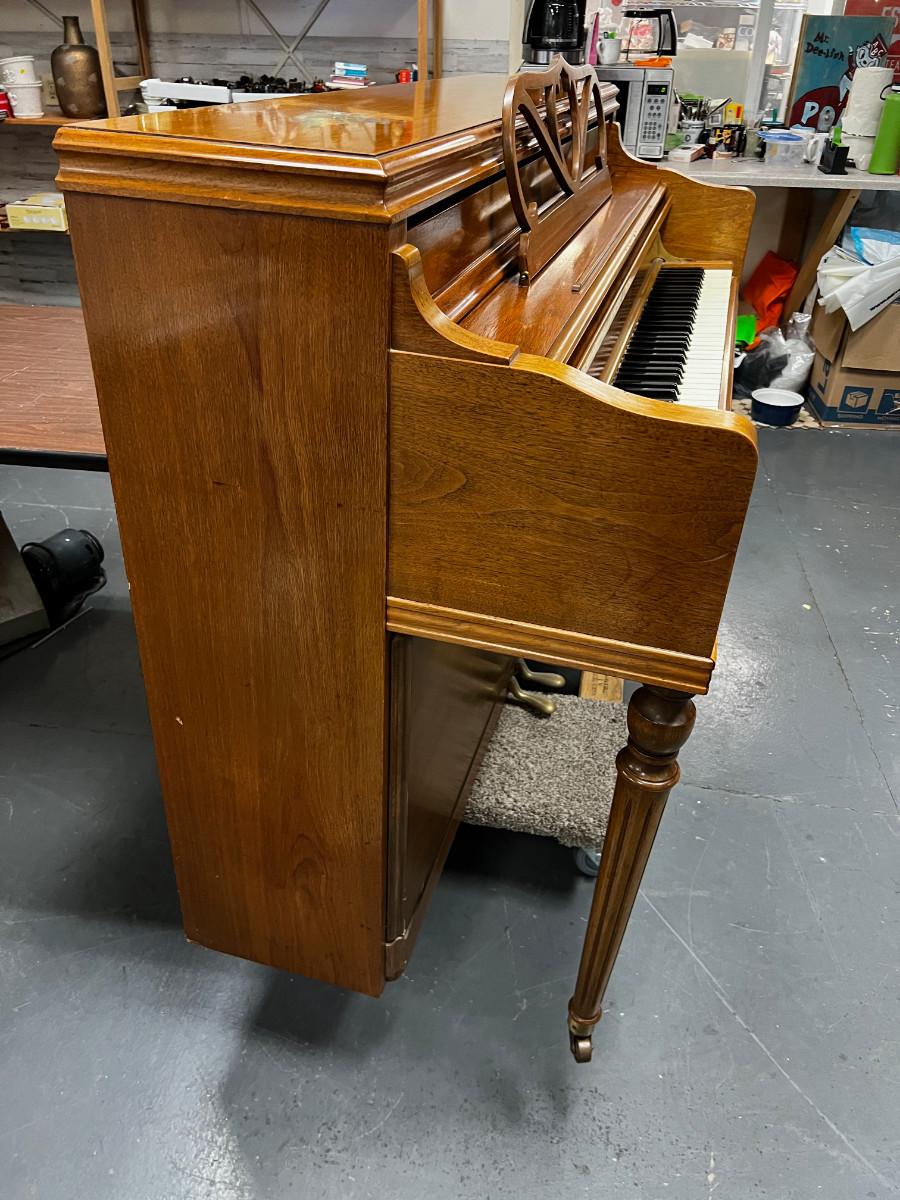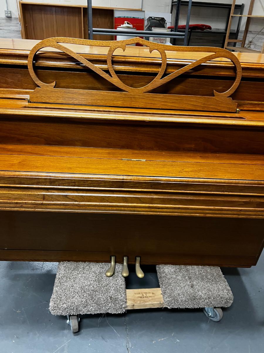 Piano is in good condition. wood has a couple of dings and some fading from time. Always inside a home, never stored in a garage or storage unit. Has good sound but I am sure it will need a tune. Piano is sitting on a skateboard dolly, easy to roll but you will need loading help. I would suggest a lift gate truck.
