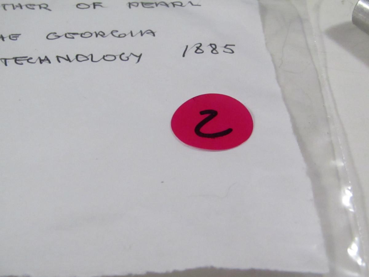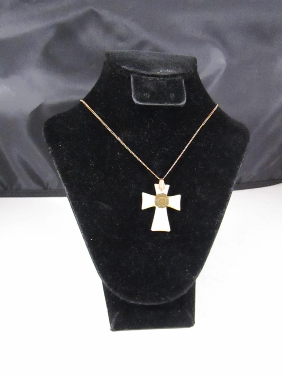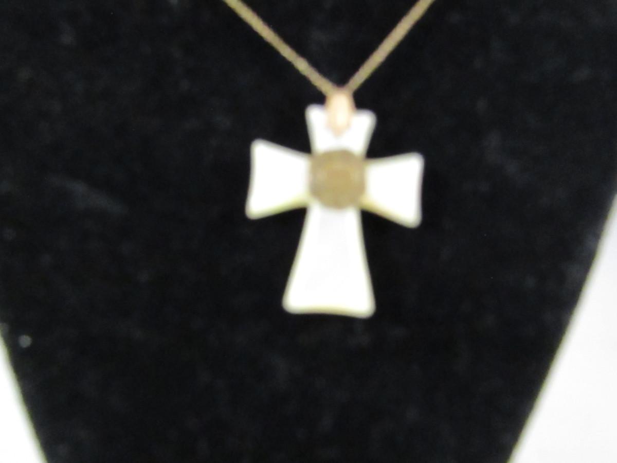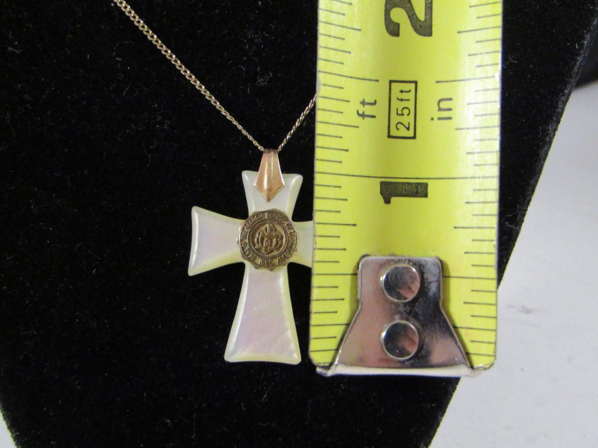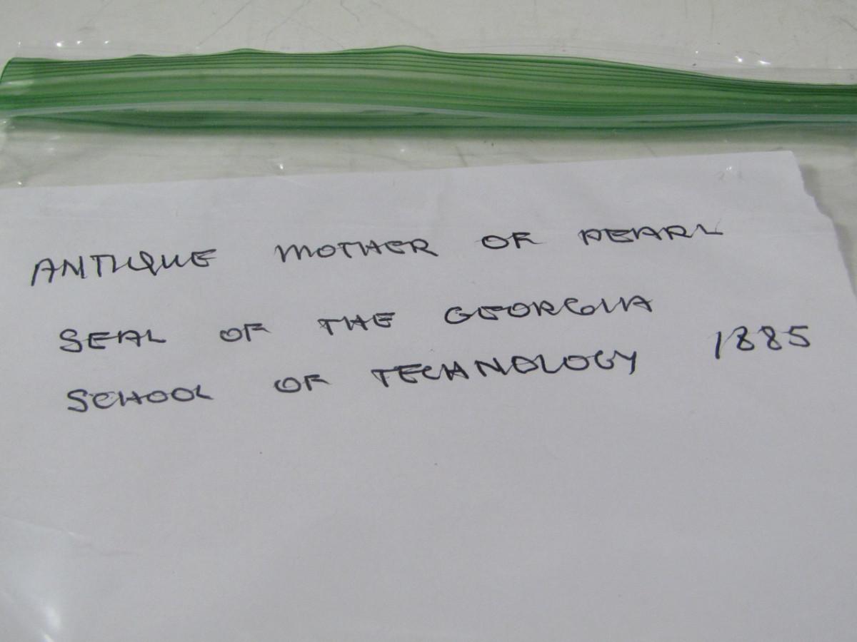 Vintage Georgia School of Technology Necklace- School Seal on Mother of Pearl Cross. Pendant is on an approx 20" base metal chain.