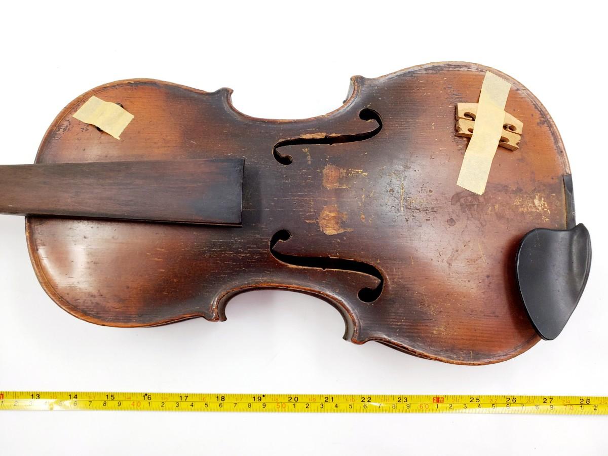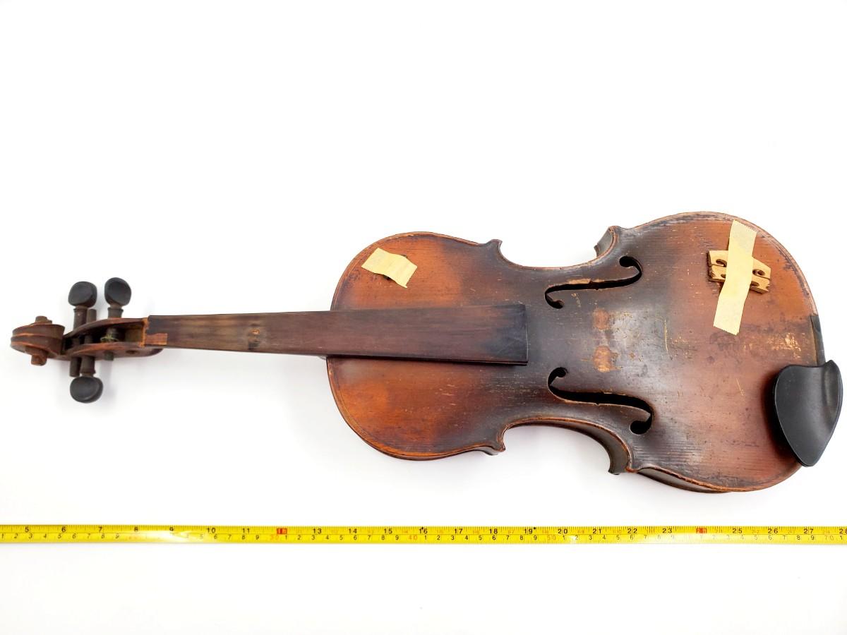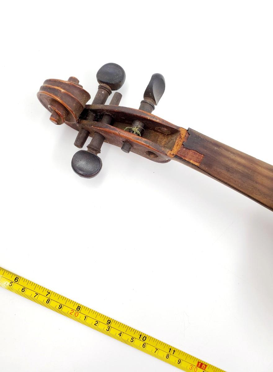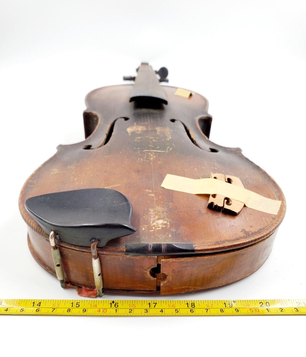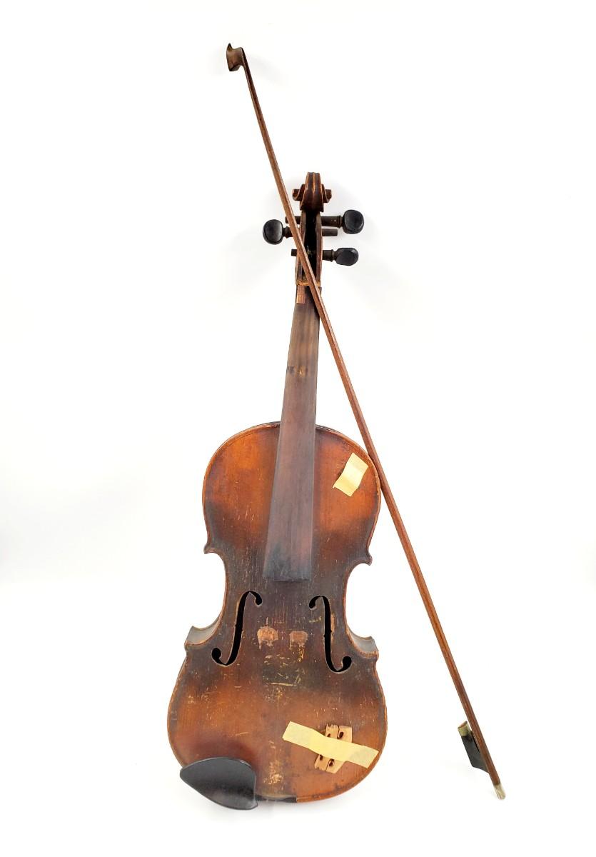 Some pieces may be missing and there are a couple of parts taped to the violin, I did not remove them as I did not want to damage the piece any further. Please see photos for condition. Bow seems to have a mother of pearl piece, see photo.