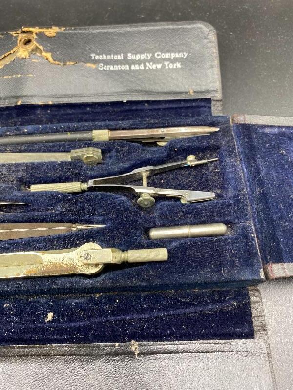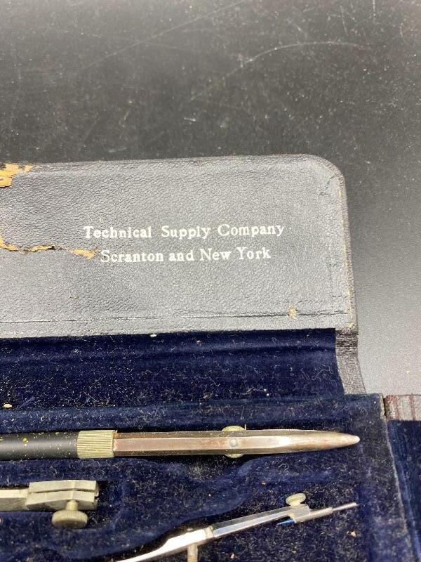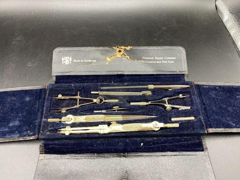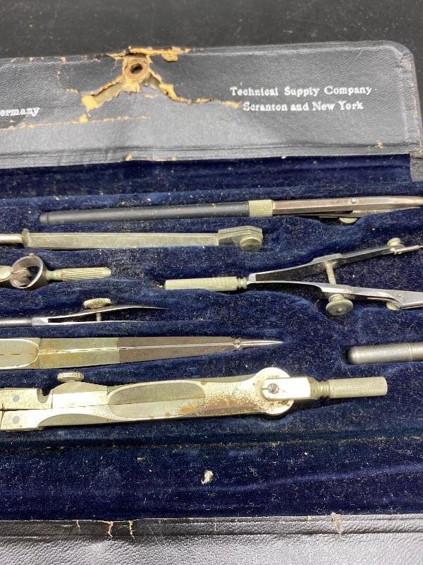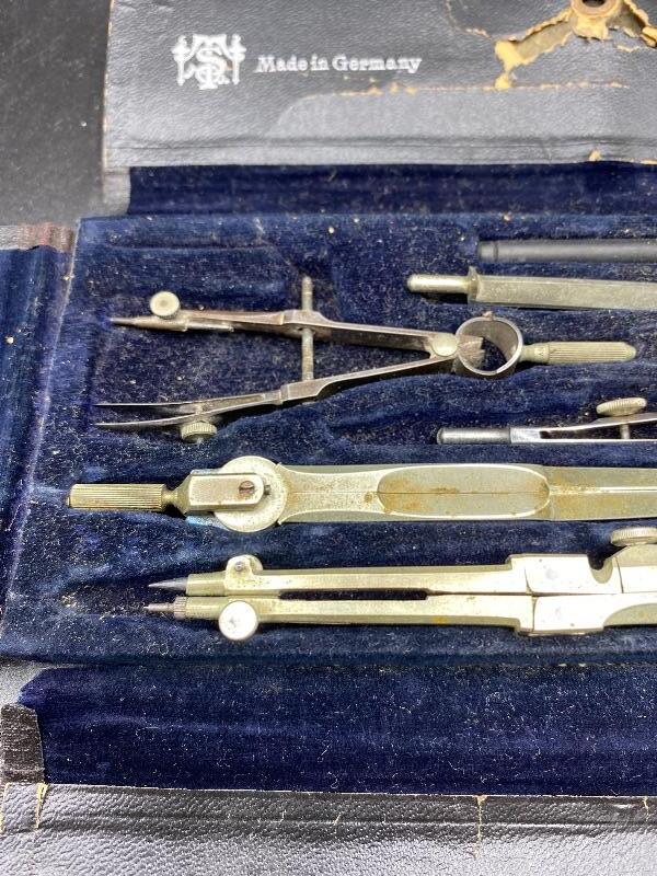 Vintage drafting protractor compass set. Made in Germany. Case has some wear from age.