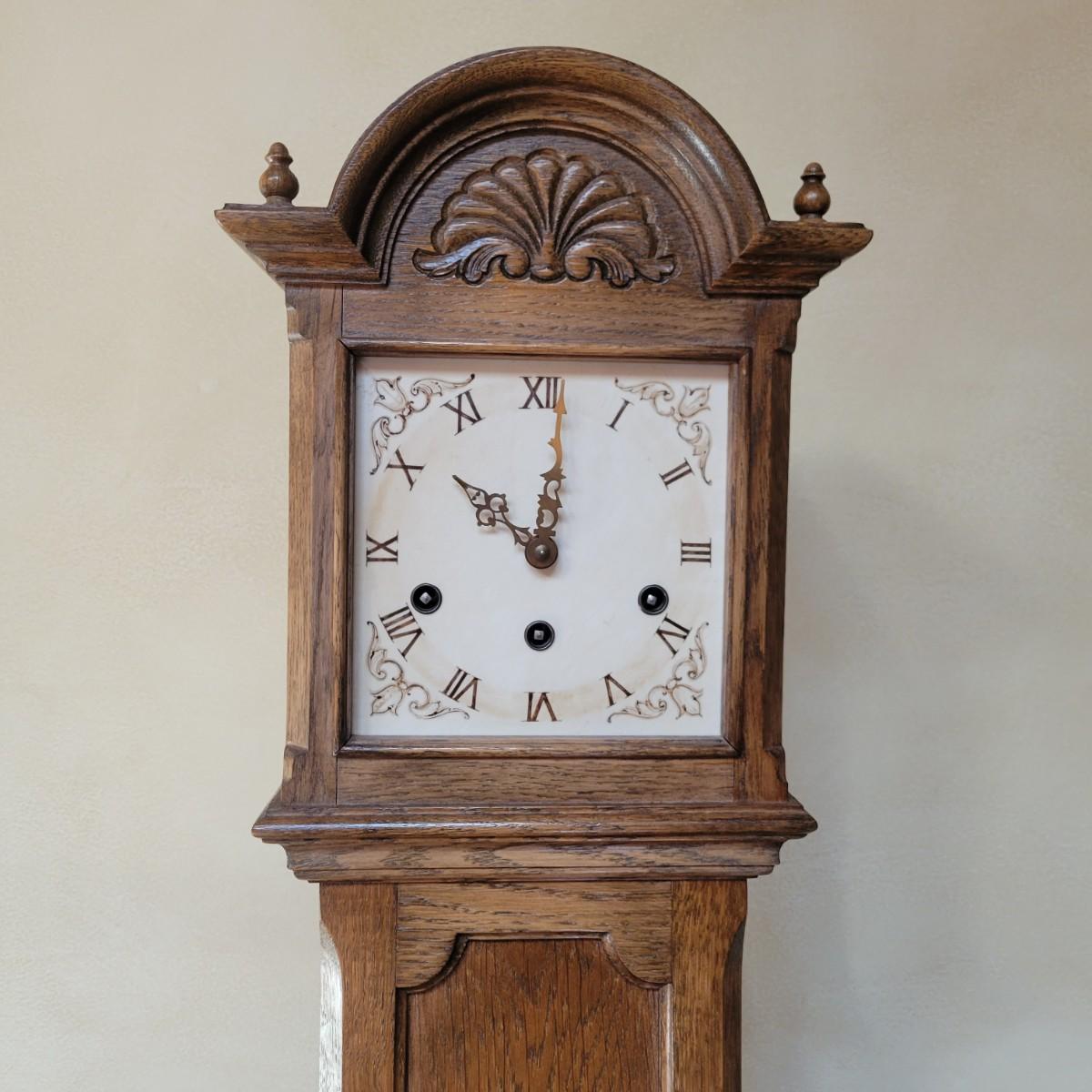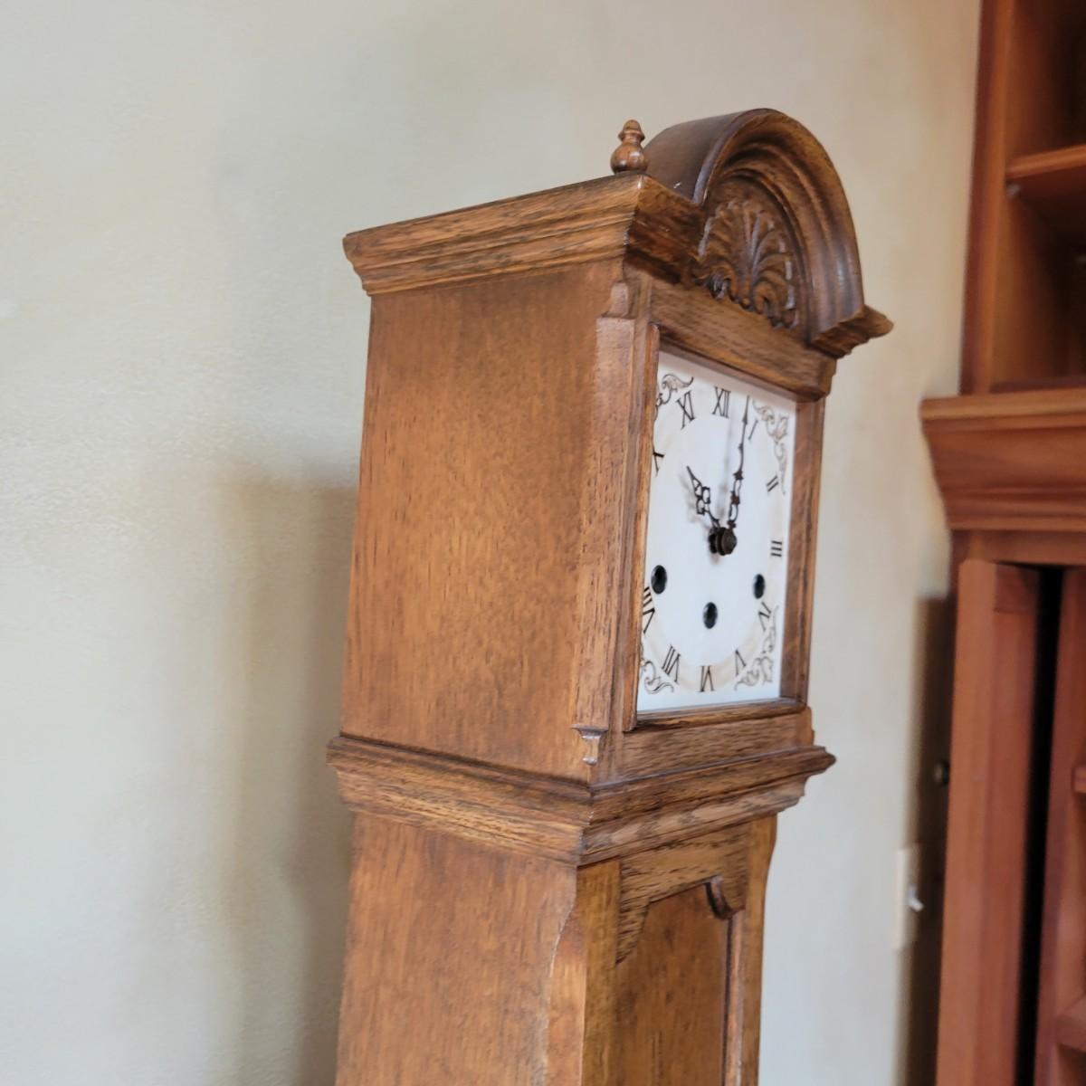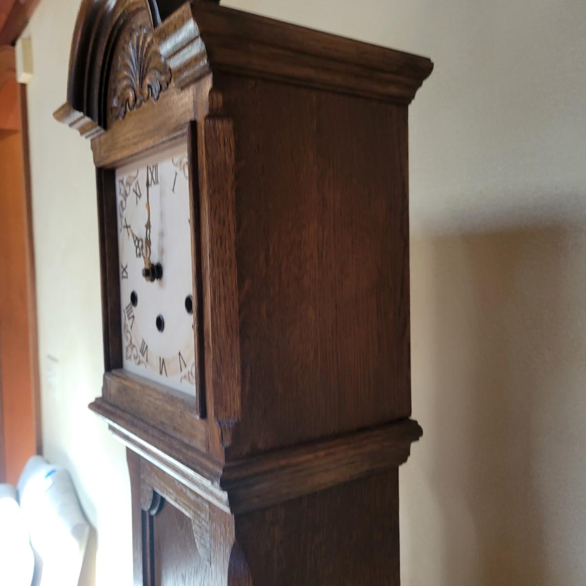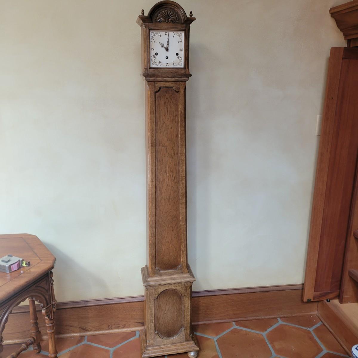 A vintage German made tall floor clock that appears to be made of oak. It includes a key and the clock and chime mechanisms still work. It measures approximately 12.5" x 7" x 70.5". Local pickup only