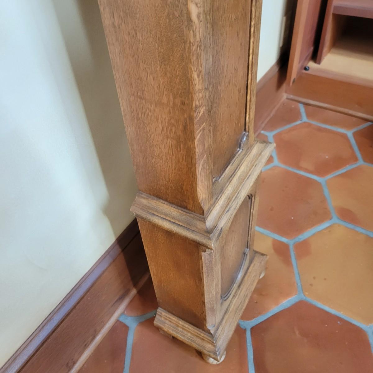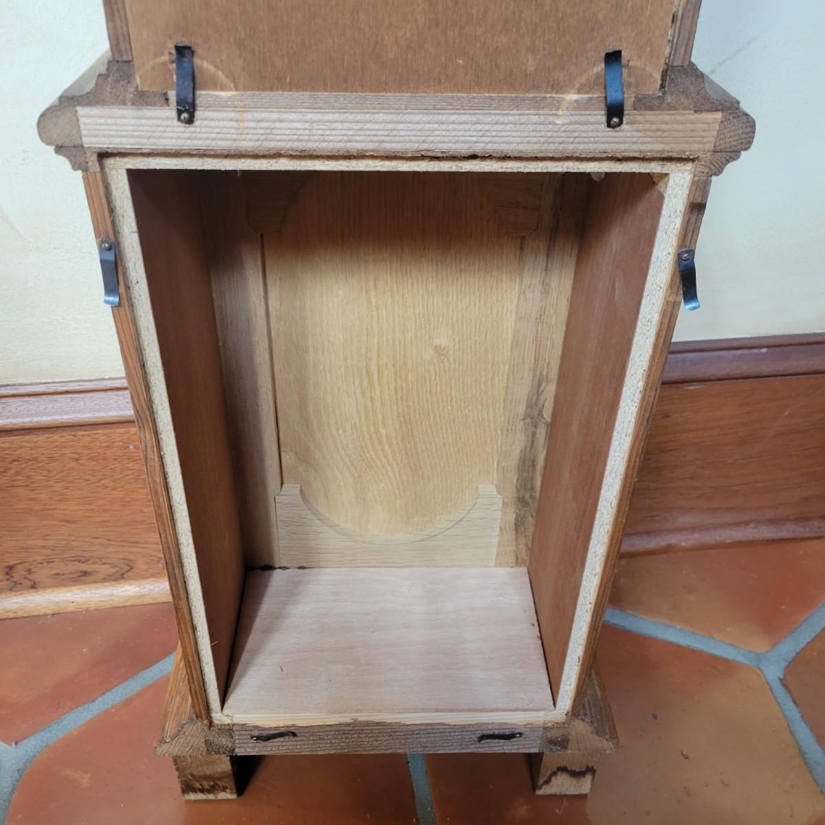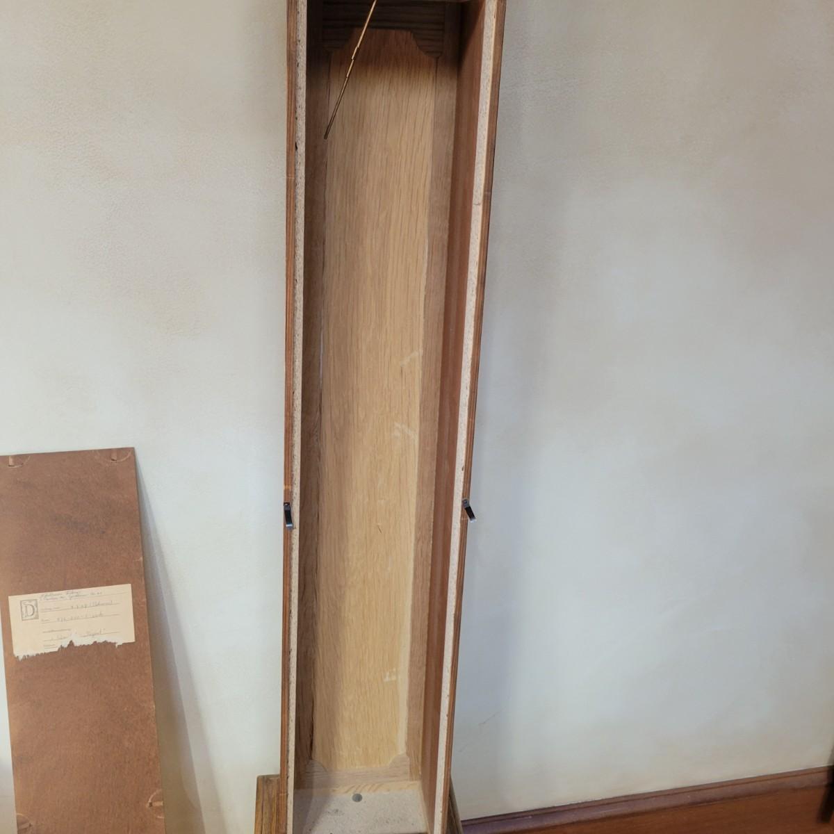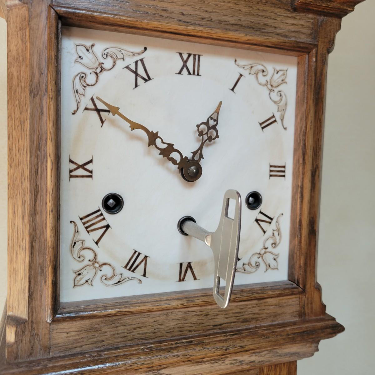 A vintage German made tall floor clock that appears to be made of oak. It includes a key and the clock and chime mechanisms still work. It measures approximately 12.5" x 7" x 70.5". Local pickup only