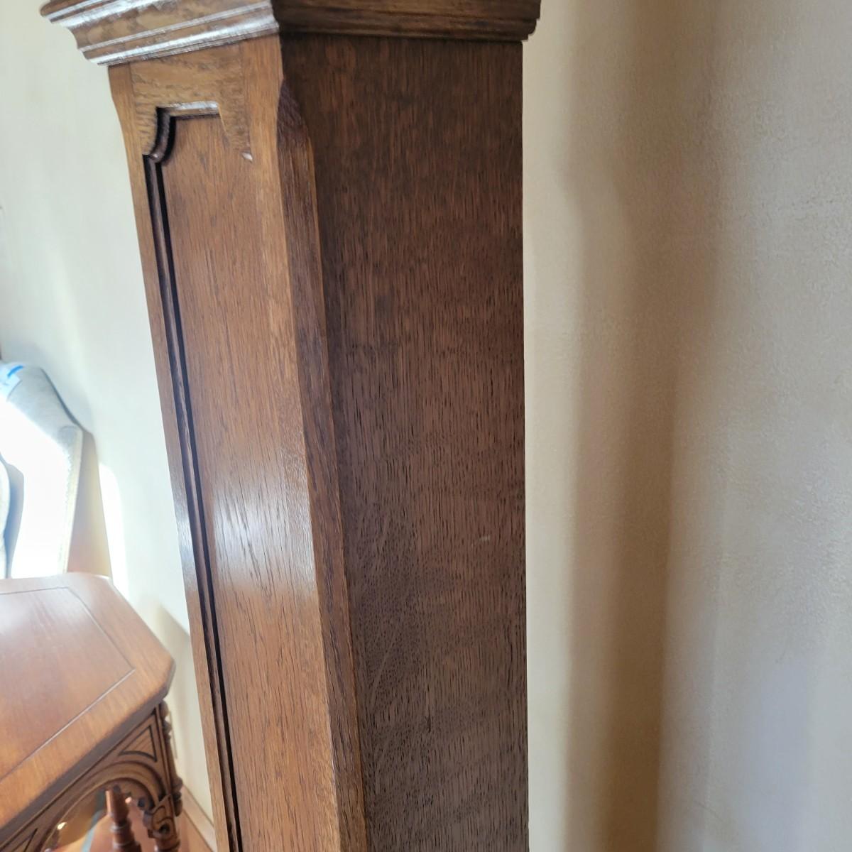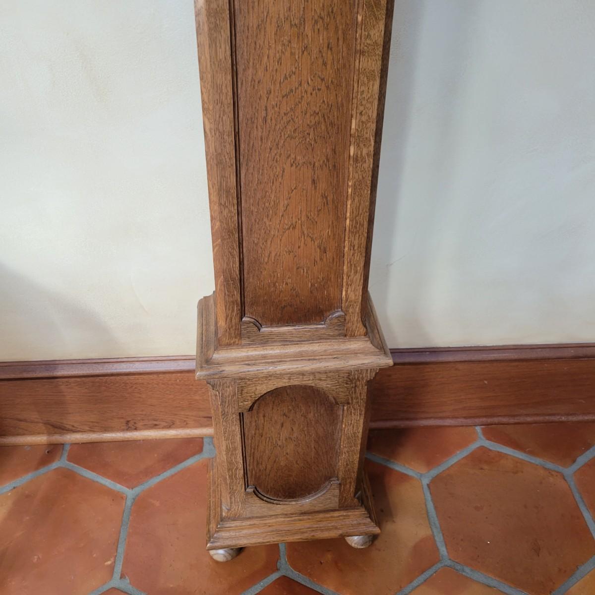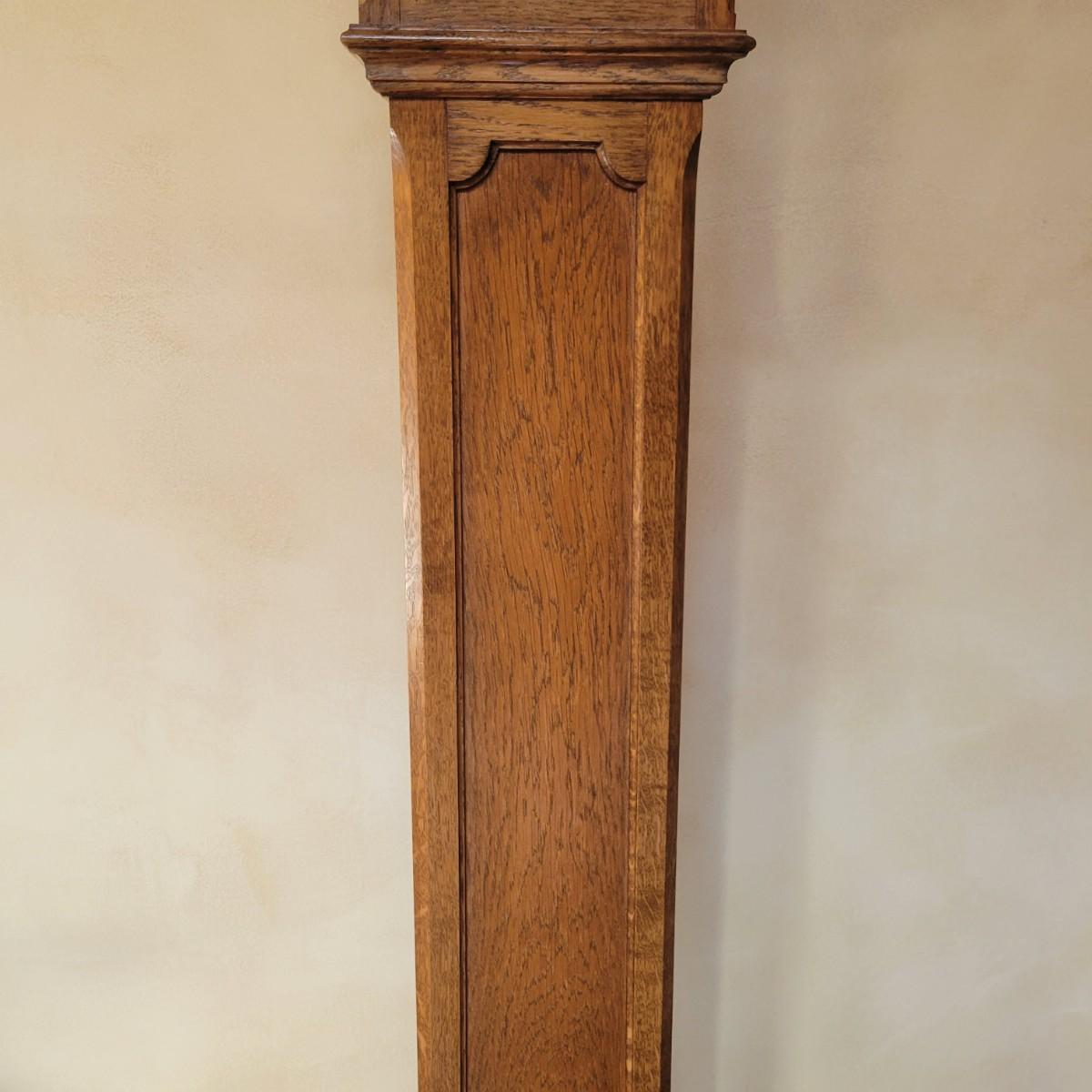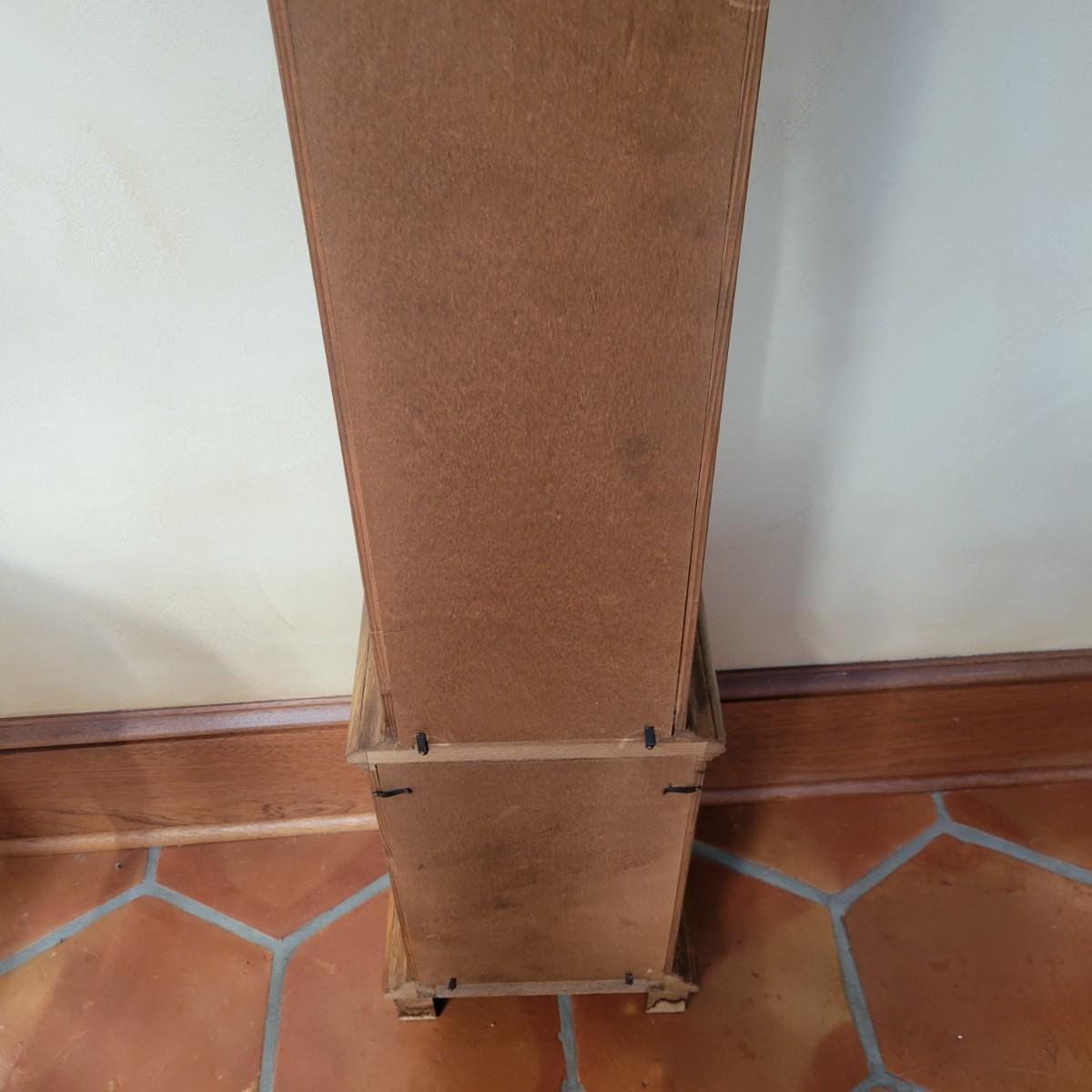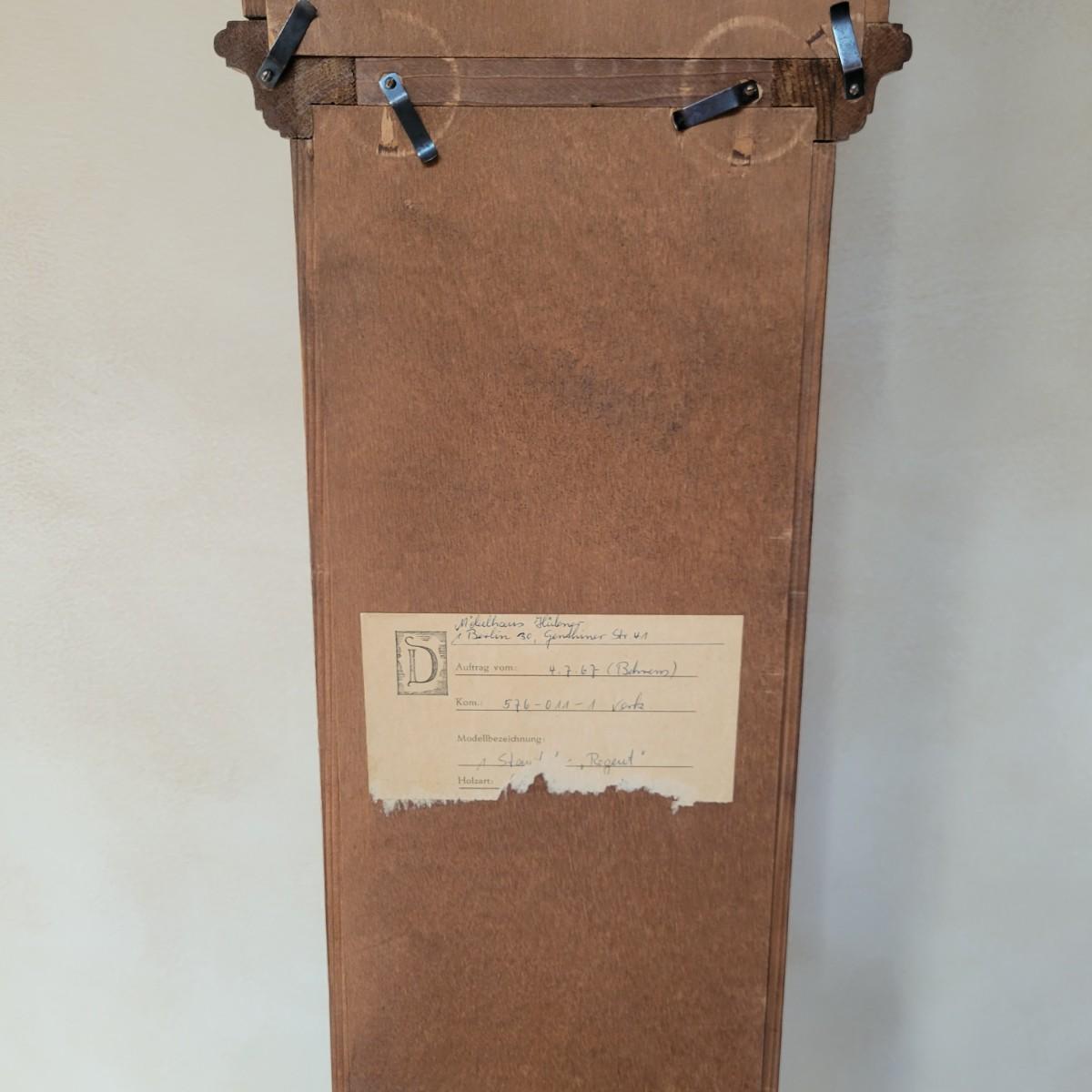 A vintage German made tall floor clock that appears to be made of oak. It includes a key and the clock and chime mechanisms still work. It measures approximately 12.5" x 7" x 70.5". Local pickup only