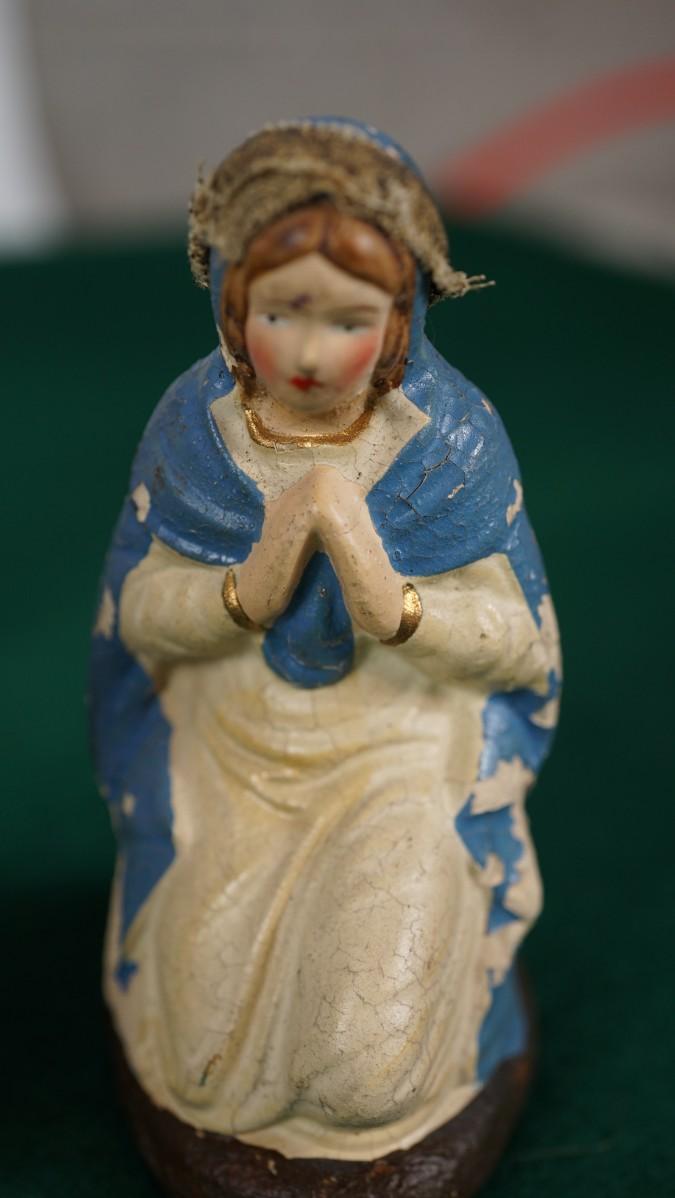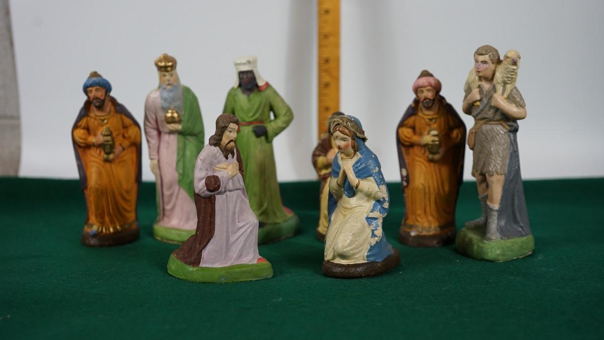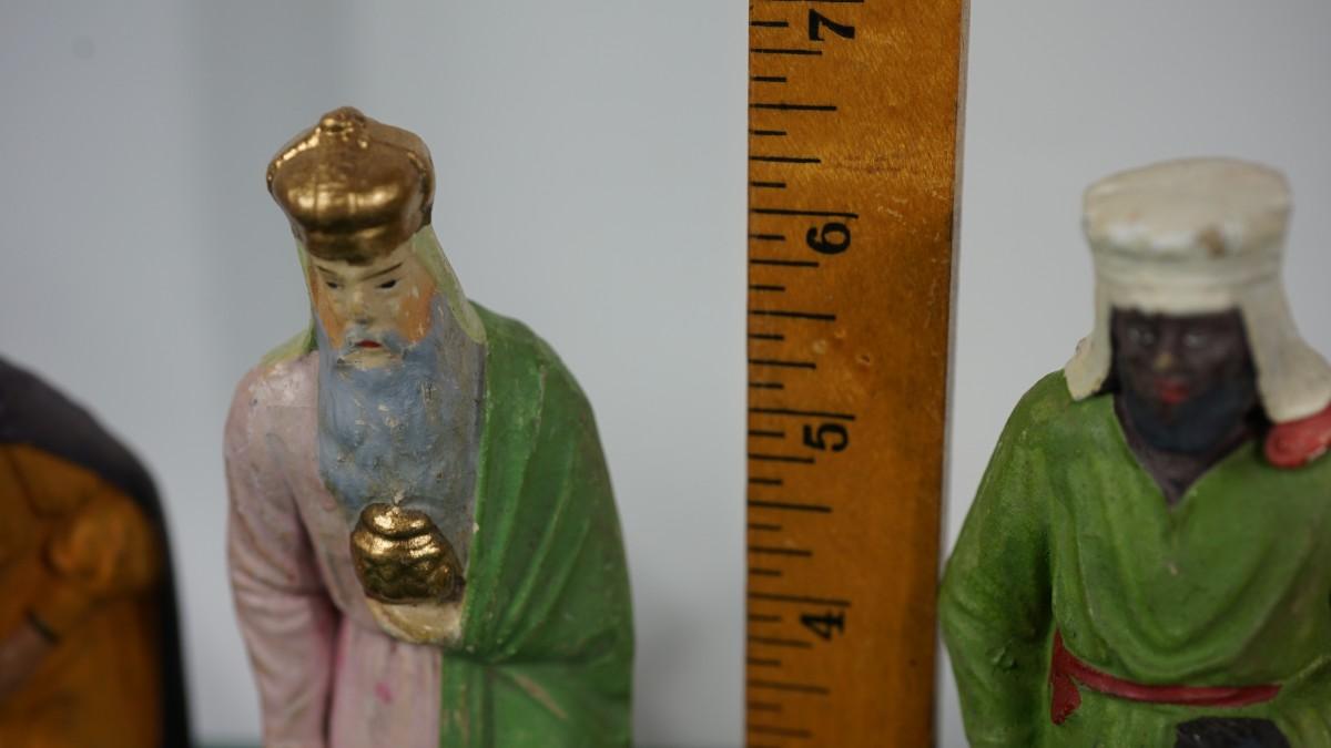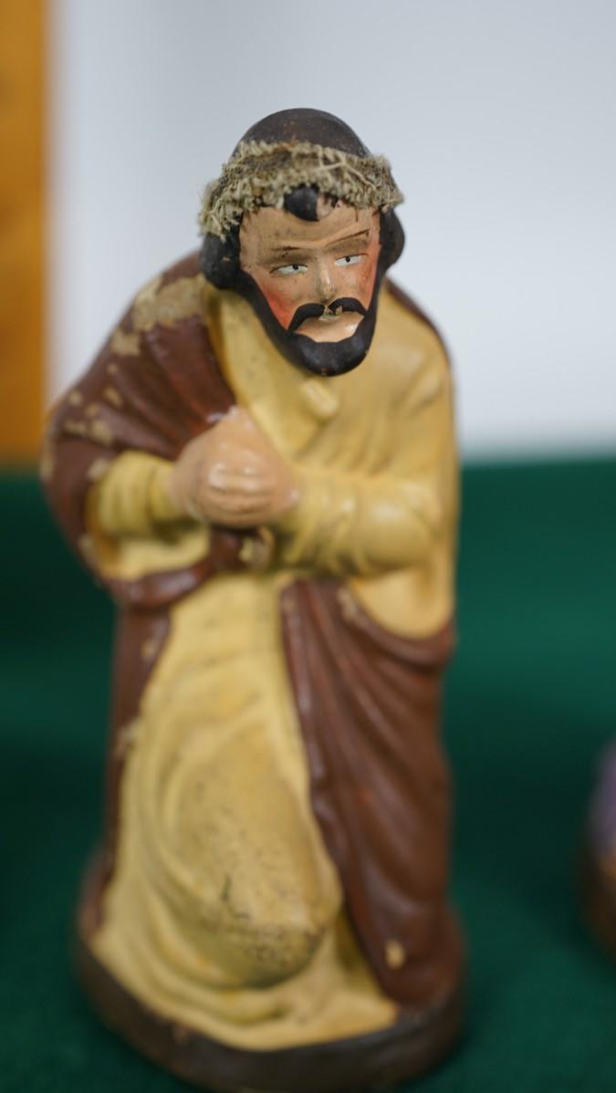 VINTAGE GERMAN PAPER MACHIE NATIVITY SCENE FIGURINES. 6 1/2" HAND PAINTED