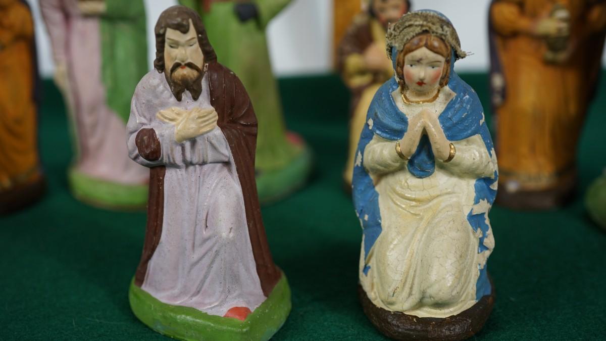 The three kings, two shepherds, Mary and Joseph. There is not a baby Jesus (I have a recent ceramic one I can give you until you find one to match this set.) They are a hollow formed paper mâché and hand painted.