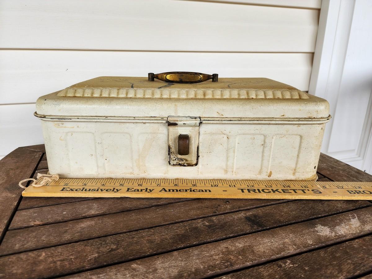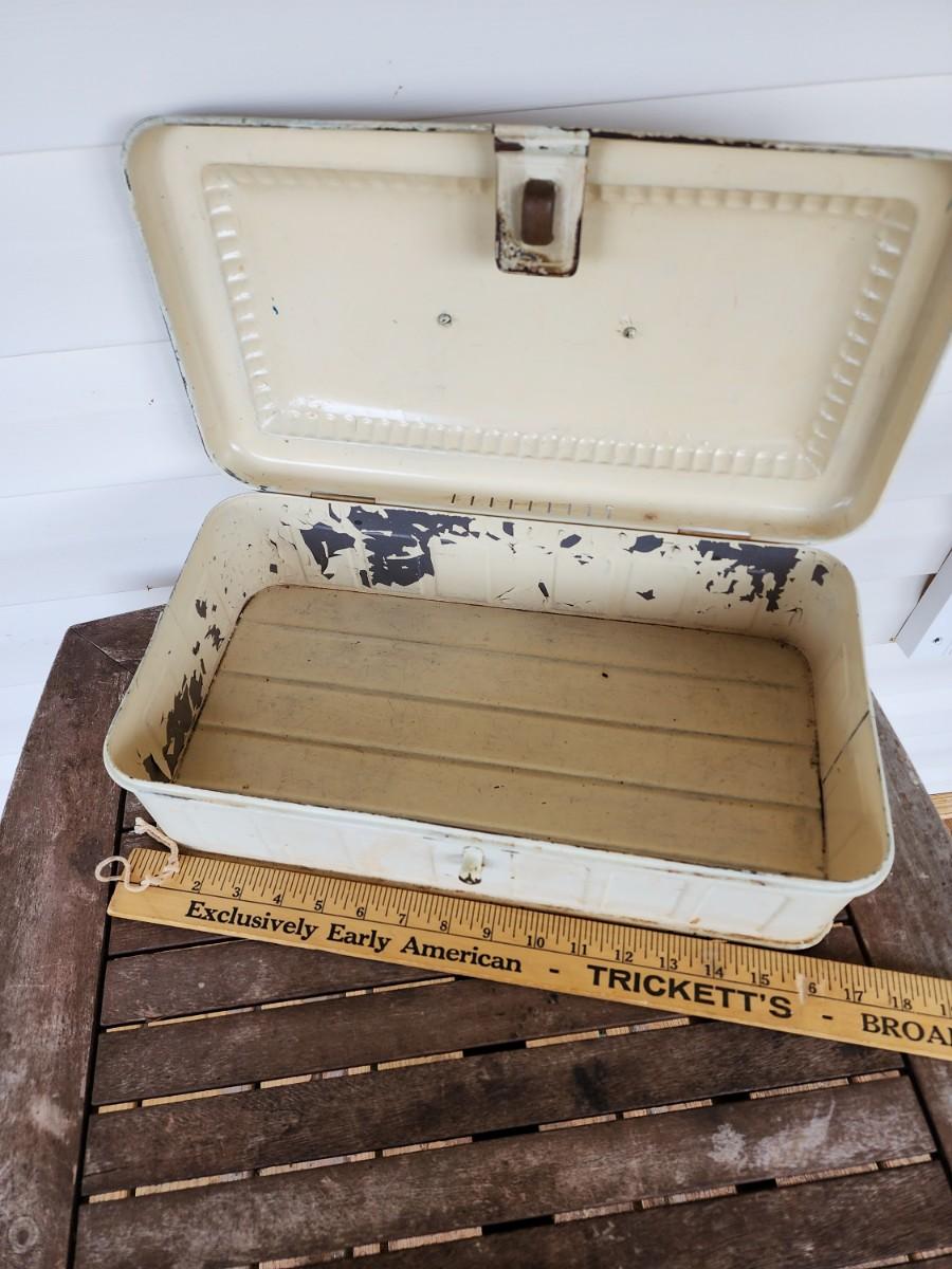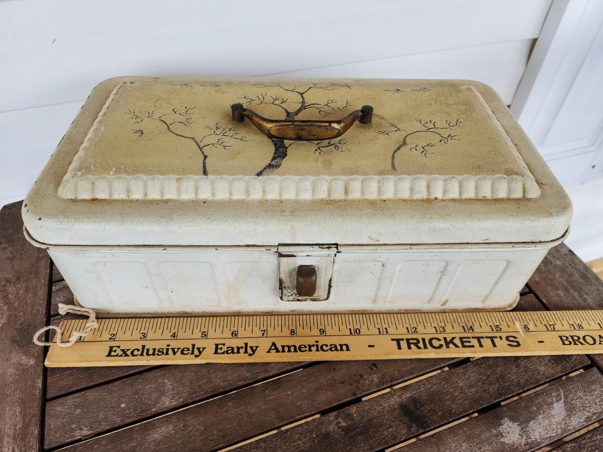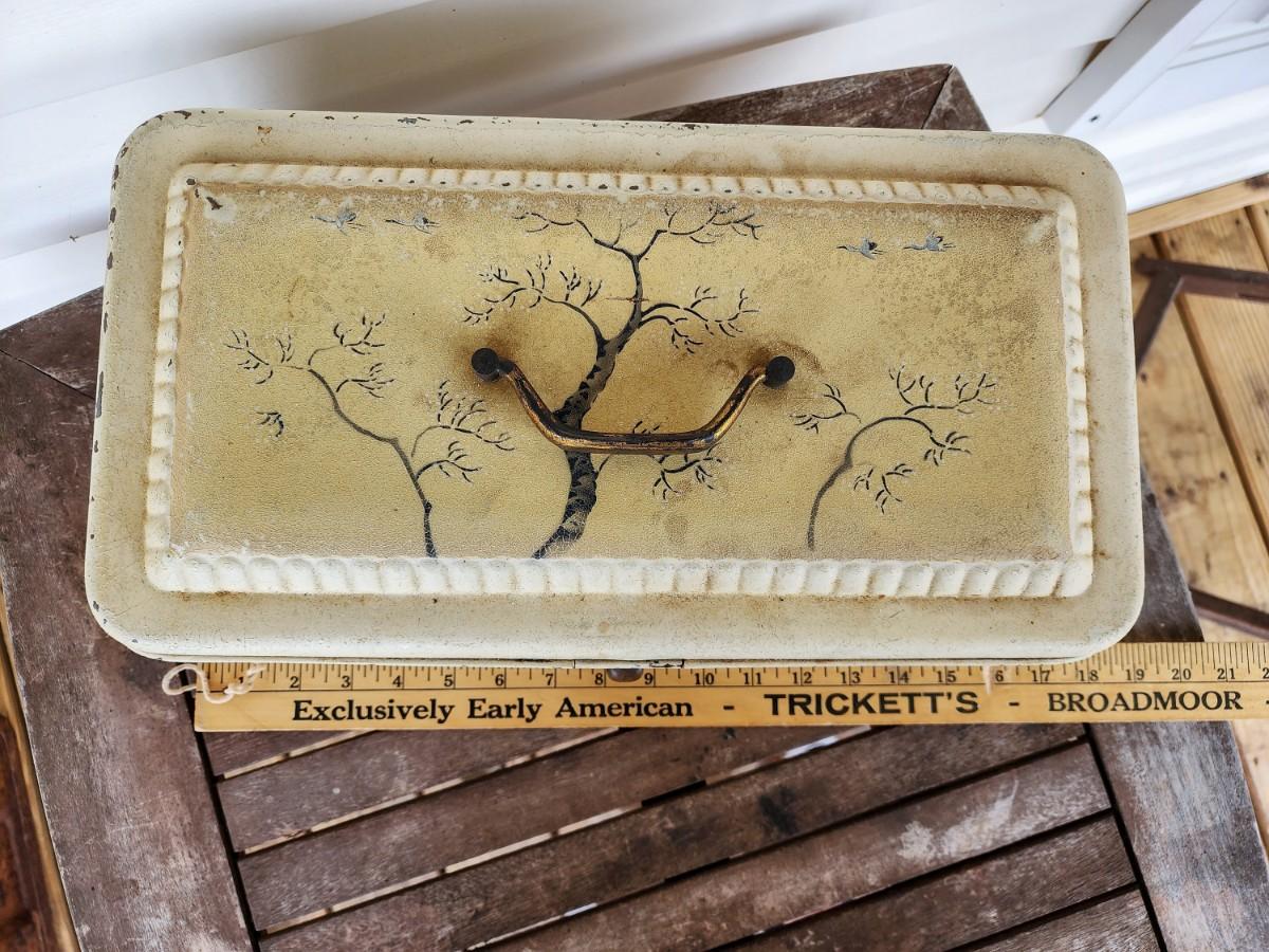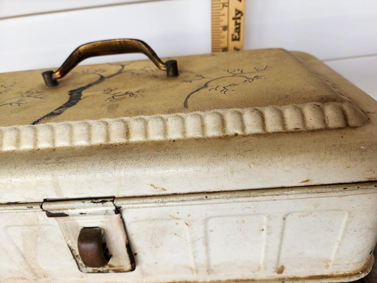 Item shows wear to enamel, especially on the inside. Hinges, hasp, and handle all function well. The lid is decorated with a budding tree.