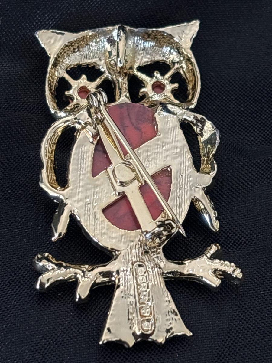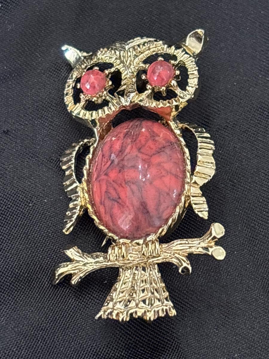 Vintage Gerry's Rose Pink Stones Owl Goldtone Brooche Pin