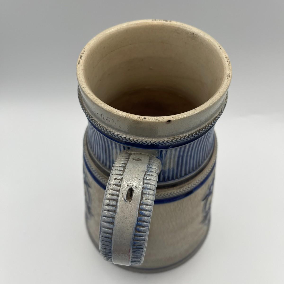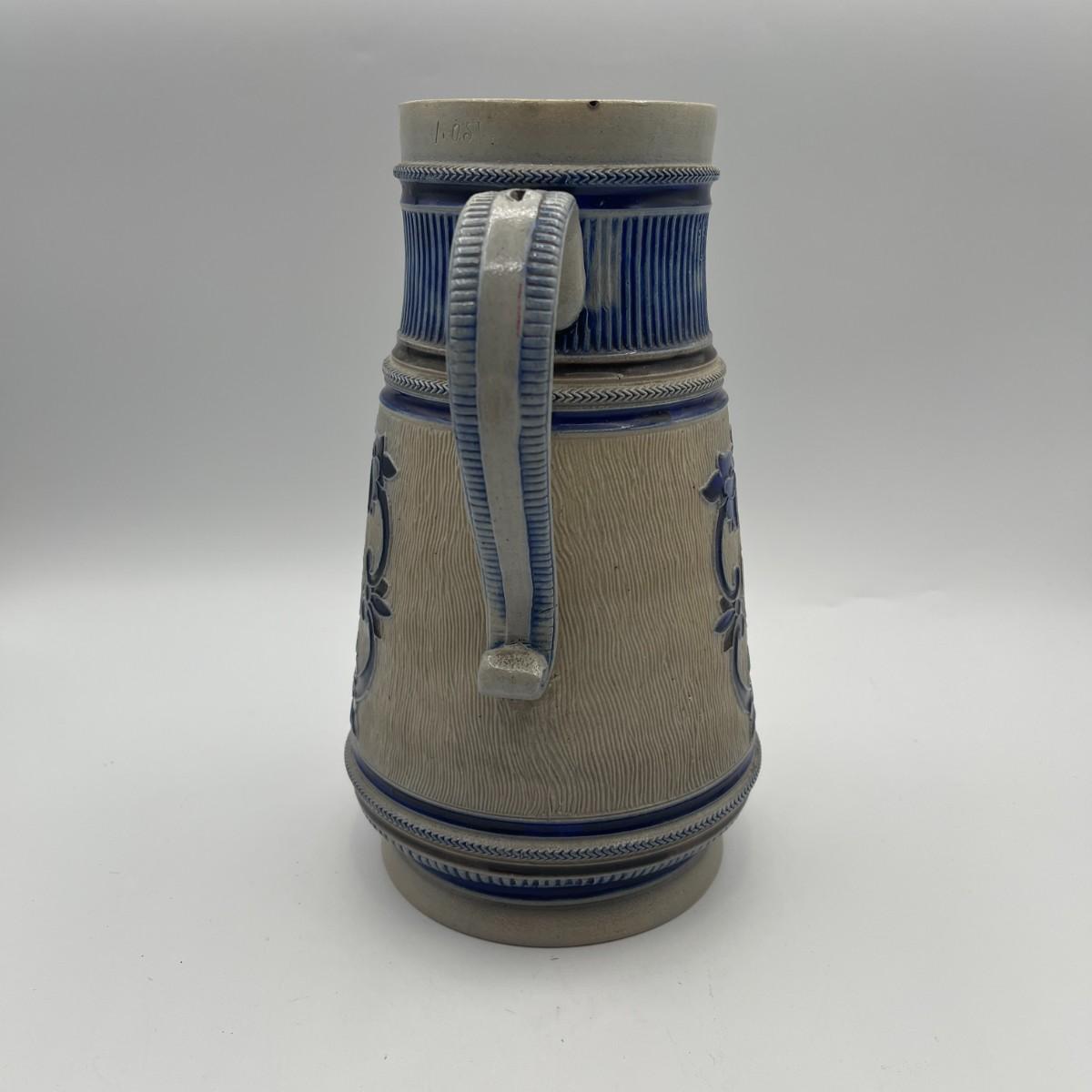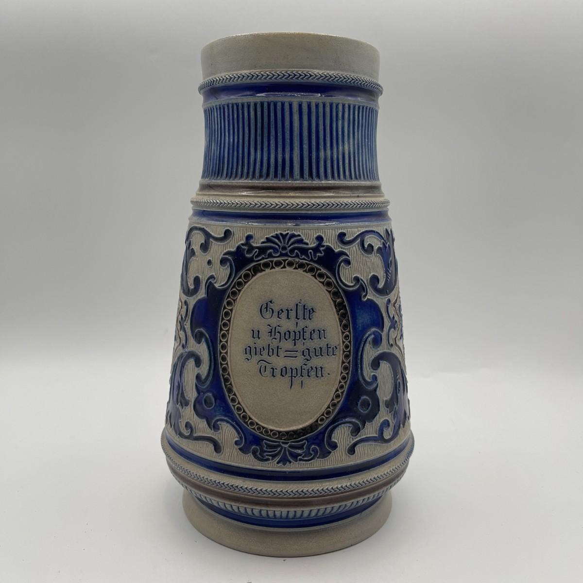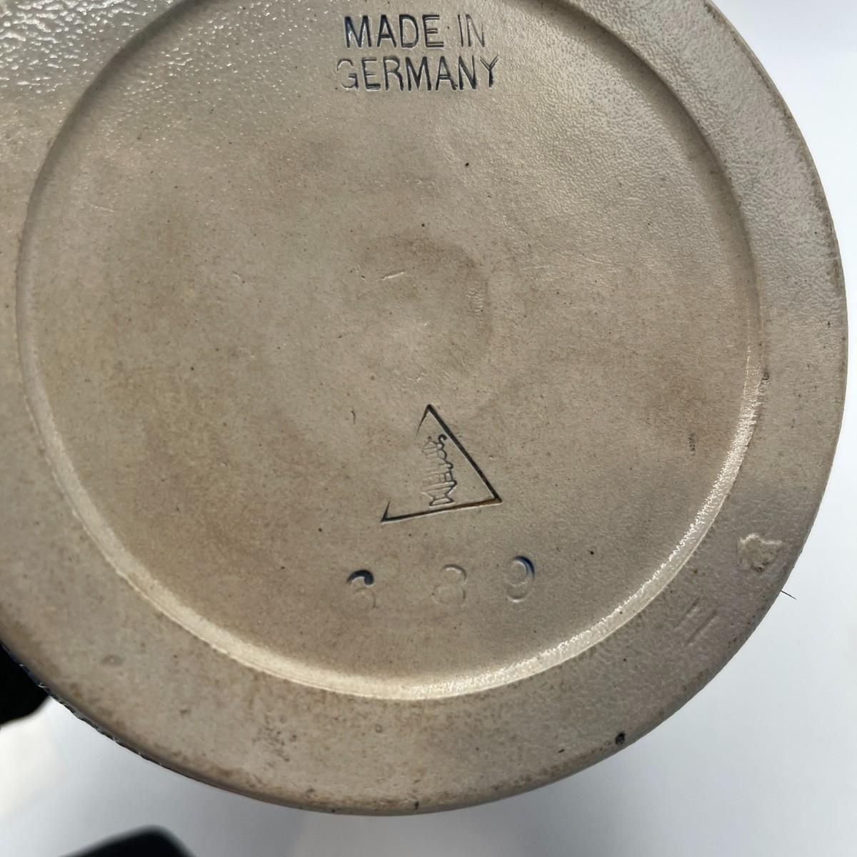 Vintage beer stein made by Gerz, probably 50 years old. This Gerz stein does not come with the traditional lid but is composed of a lovely salt glaze, blue & white, on thick pottery. 9" H x 5" from rim to handle. # 860