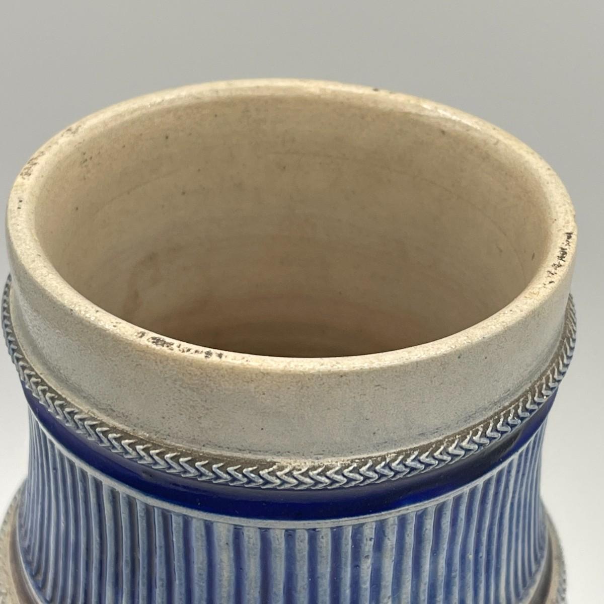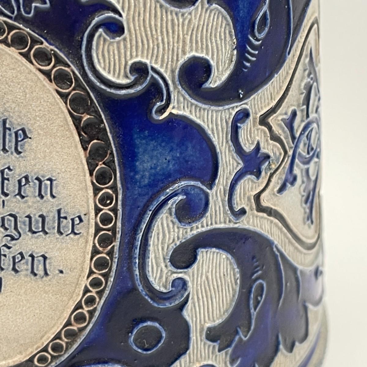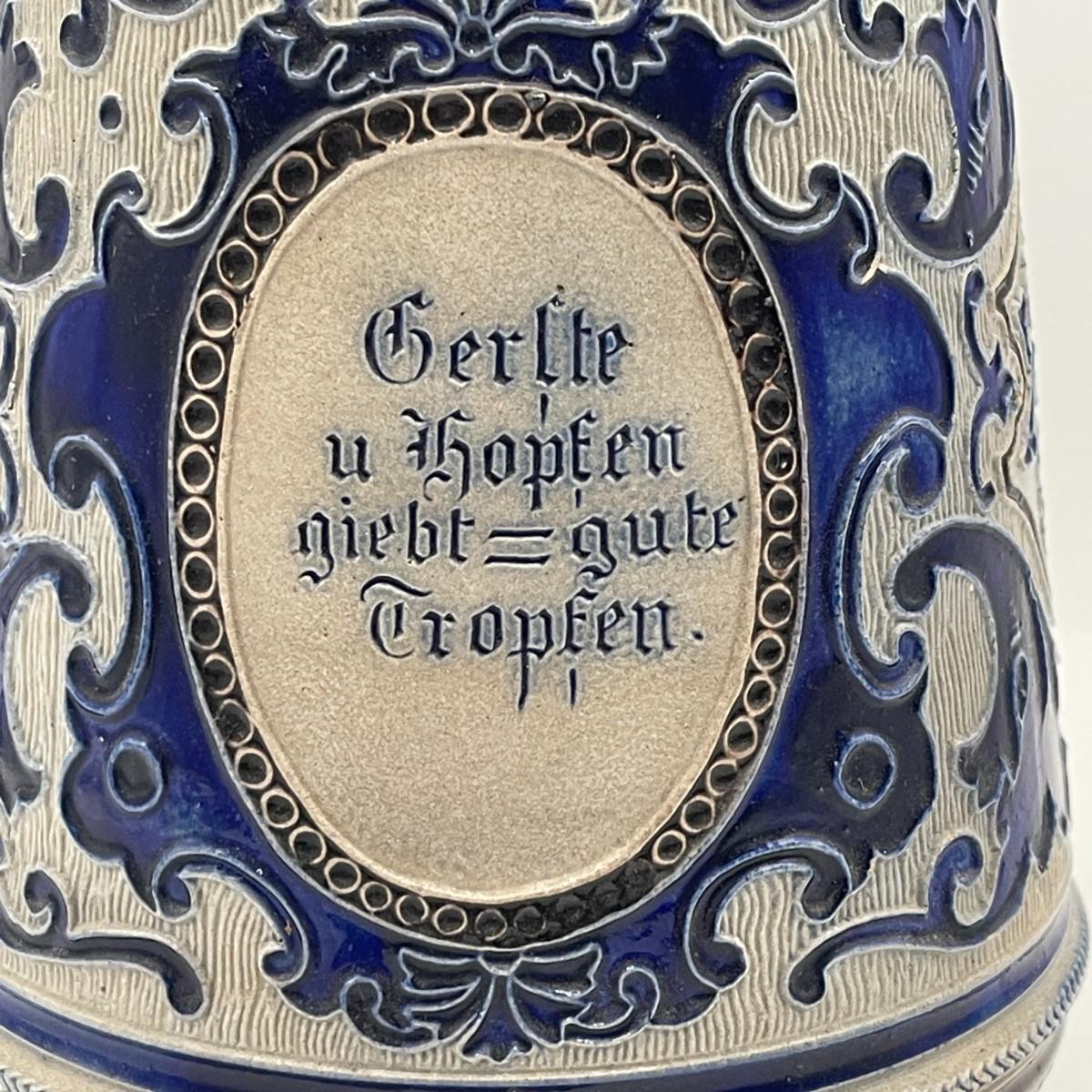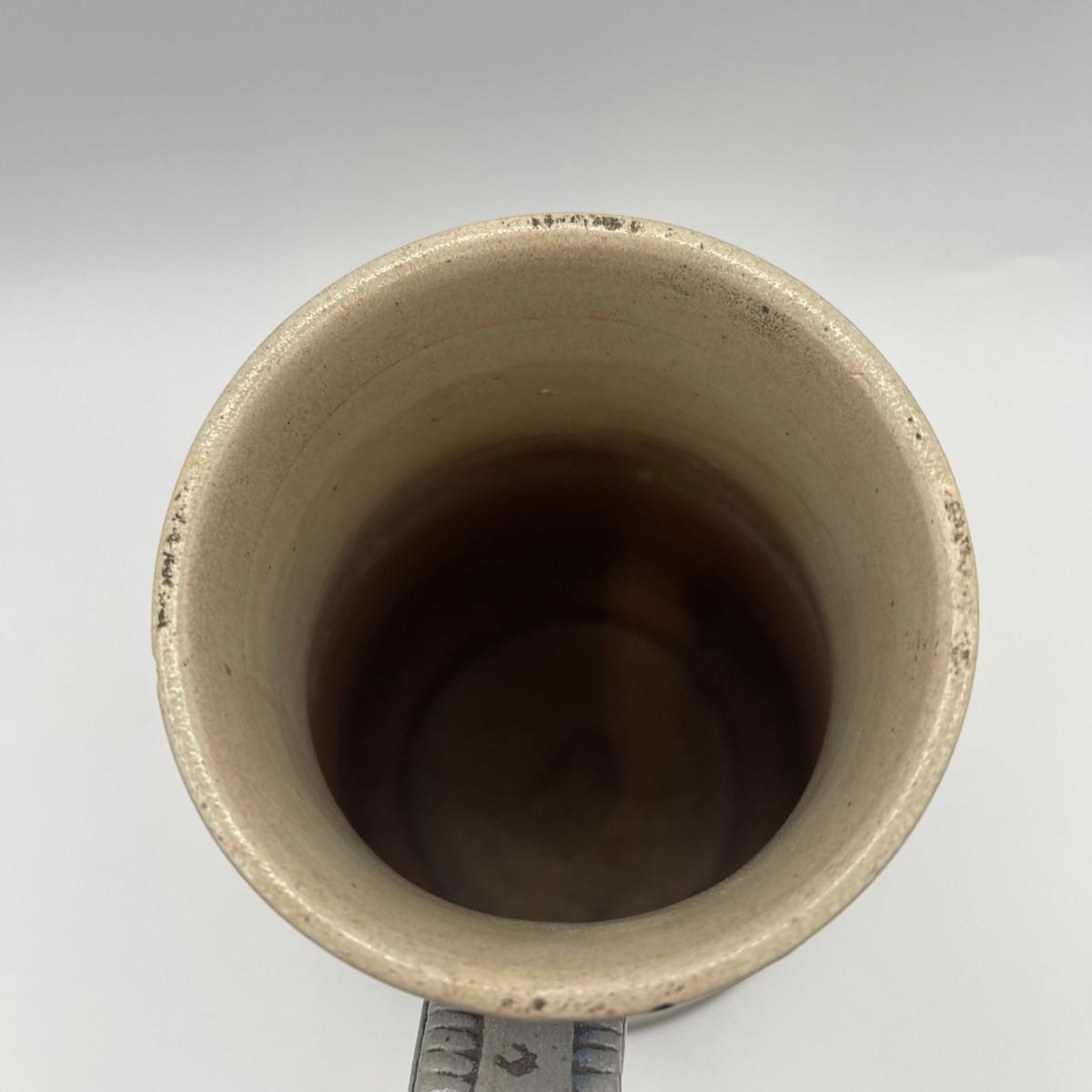 Vintage beer stein made by Gerz, probably 50 years old. This Gerz stein does not come with the traditional lid but is composed of a lovely salt glaze, blue & white, on thick pottery. 9" H x 5" from rim to handle. # 860