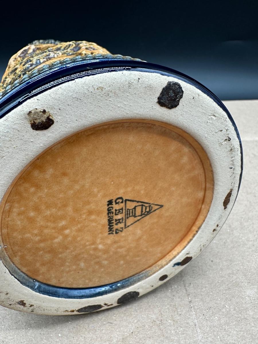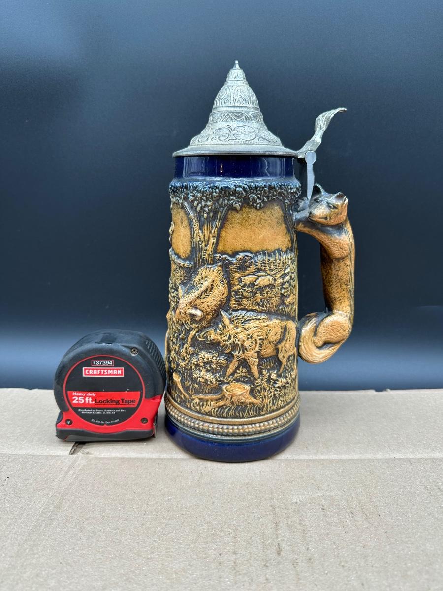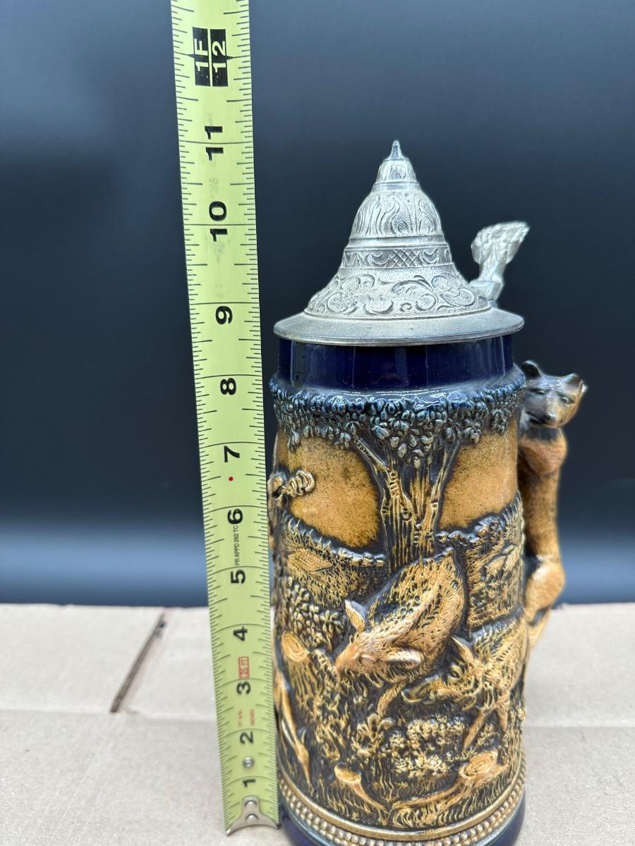 Vintage GERZ W. Germany Lidded Beer Stein – Hunting Scene Relief – Pewter Lid – 12” – Fox Handle