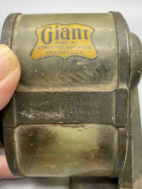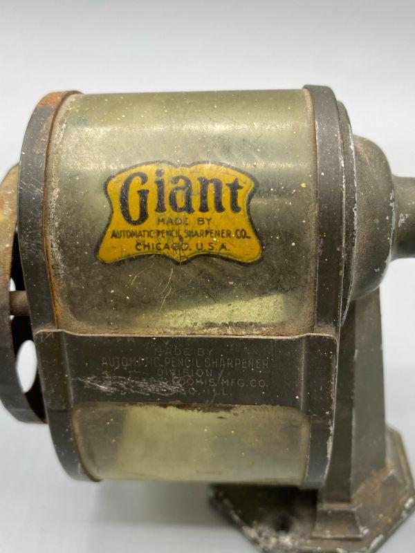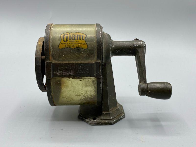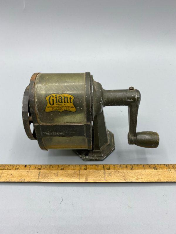 Vintage Automatic Pencil Sharpener Co "Giant" wall mount sharpener. Fits multiple sized pencils. Turns easily. Good vintage condition.