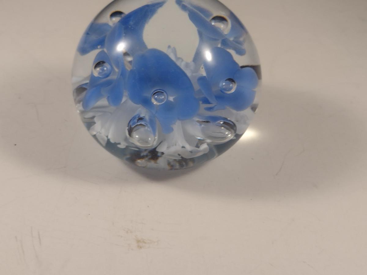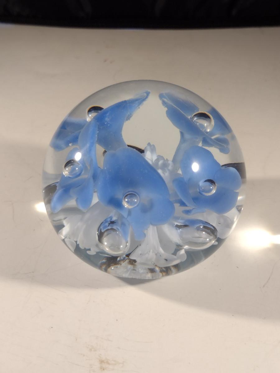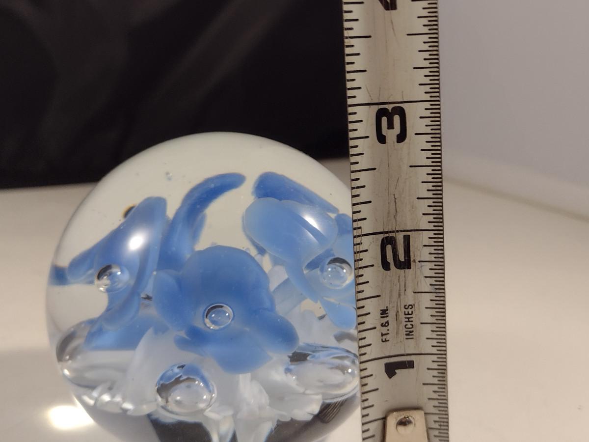 Vintage Gibson 1990 Art Glass Controlled Bubble Blue Floral Paperweight- Approx 2 3/4"