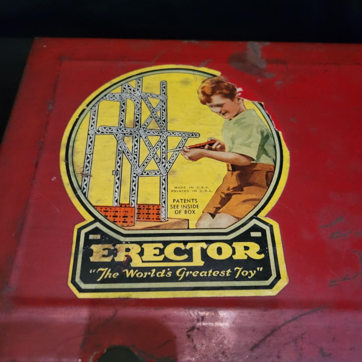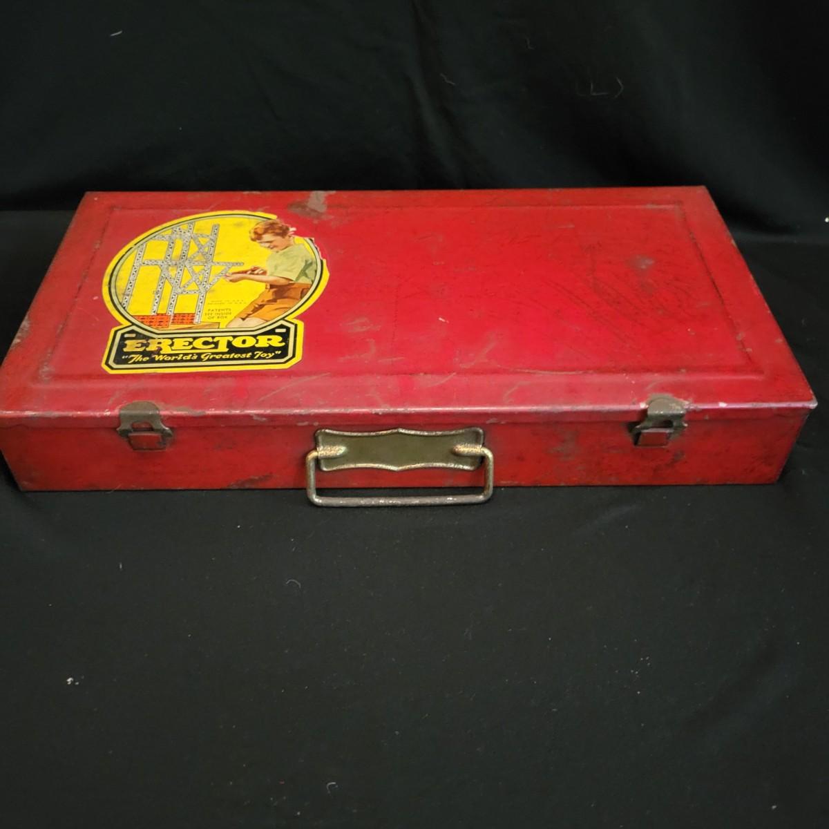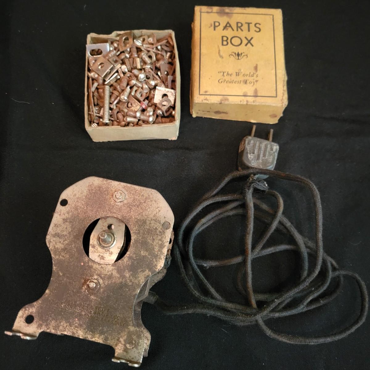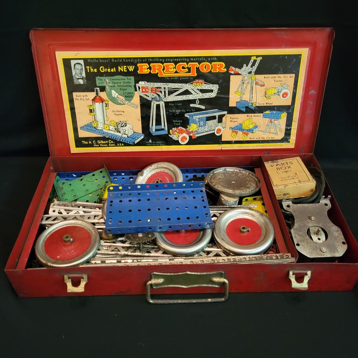 A vintage erector set and box manufactured by the A.C. Gilbert Co. The motor in this set powered on when plugged in. This set seems to be complete, but cannot be confirmed. Measures approximately 16" x 8.5" x 2.5"H. Shipping available. Shipping can be costly. We suggest contacting our preferred local shipping provider, Postage Express, with dimensions and getting an estimate before bidding: (828) 670-5501 or postageexpress@yahoo.com.