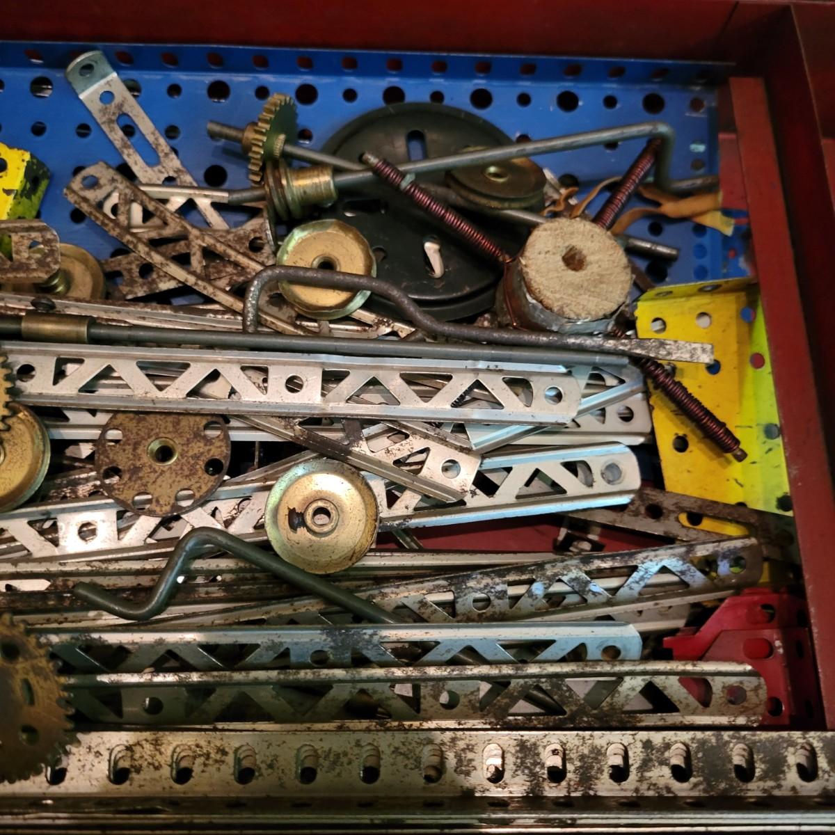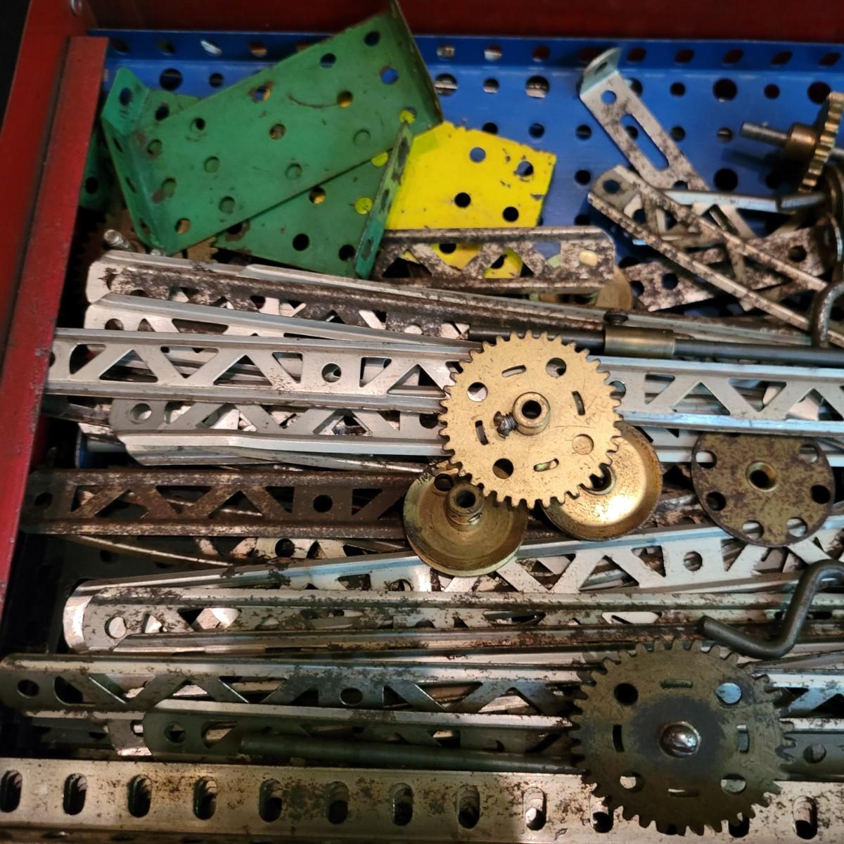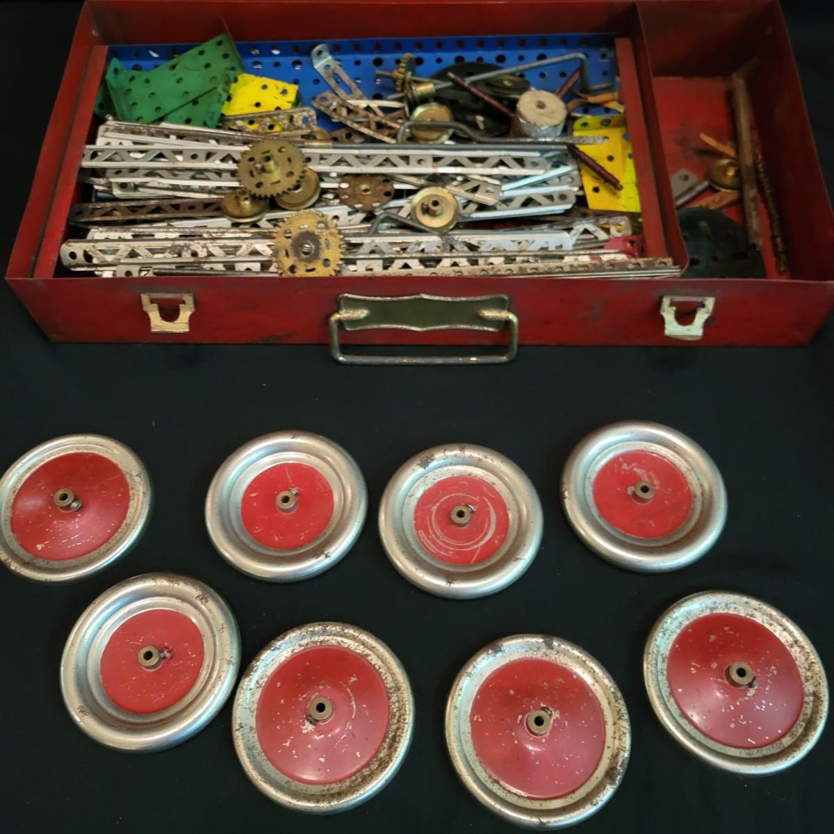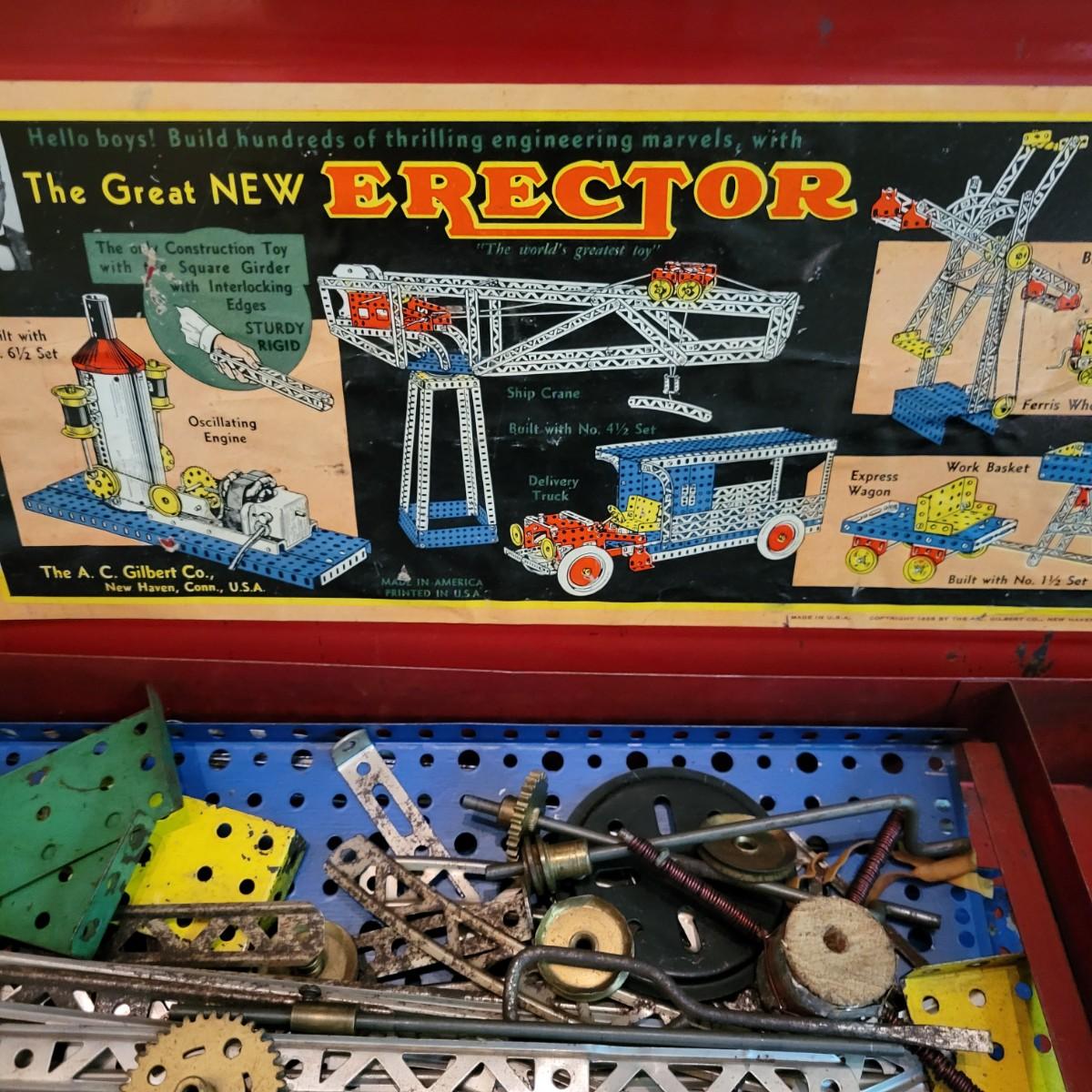 A vintage erector set and box manufactured by the A.C. Gilbert Co. The motor in this set powered on when plugged in. This set seems to be complete, but cannot be confirmed. Measures approximately 16" x 8.5" x 2.5"H. Shipping available. Shipping can be costly. We suggest contacting our preferred local shipping provider, Postage Express, with dimensions and getting an estimate before bidding: (828) 670-5501 or postageexpress@yahoo.com.