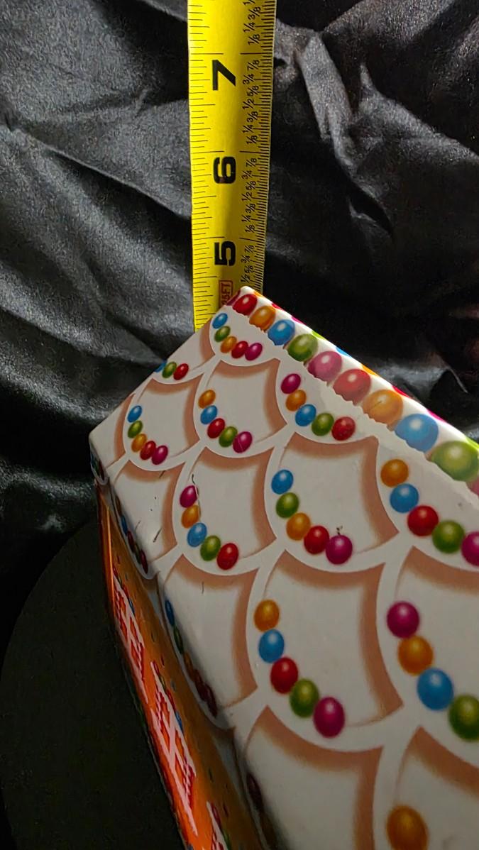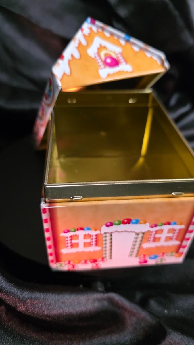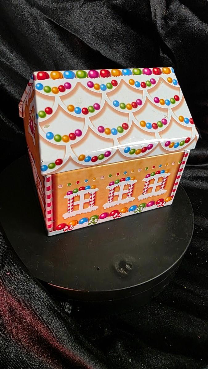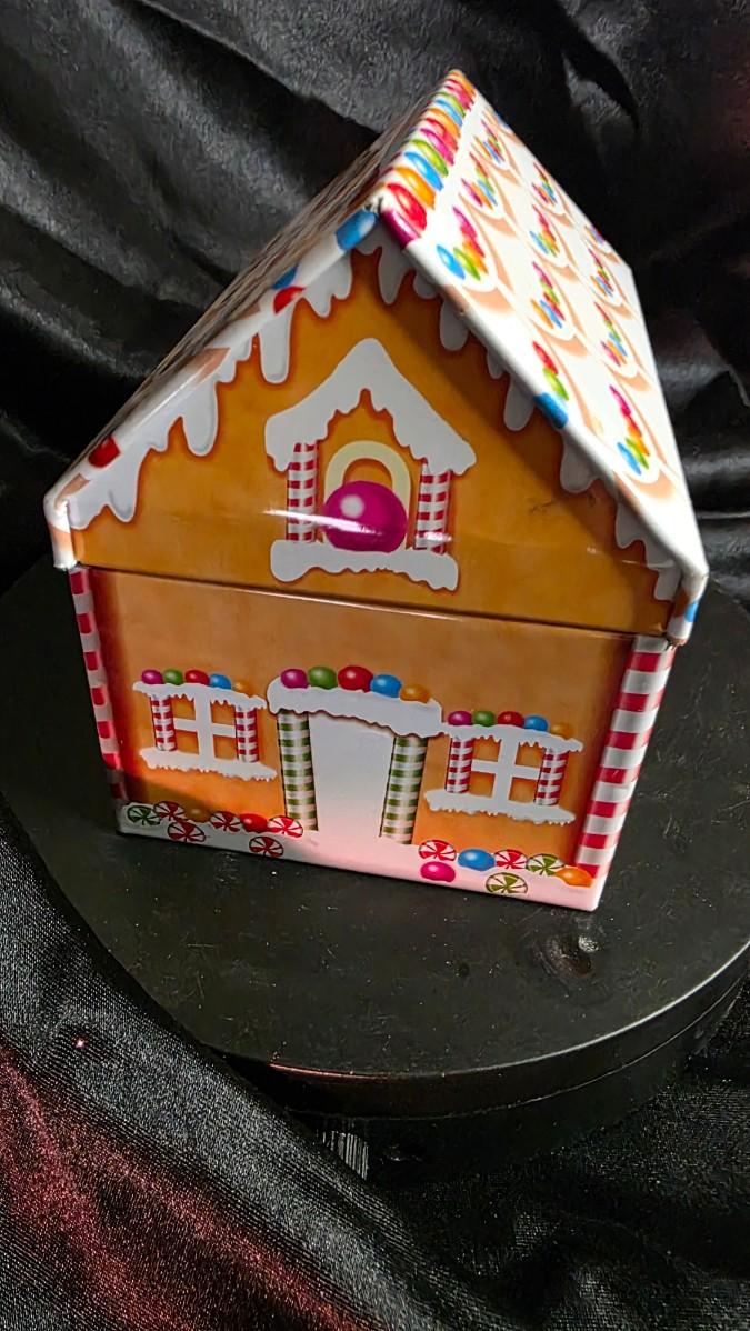 Delightfully whimsical and full of holiday charm, this vintage gingerbread-house tin brings that nostalgic Christmas magic straight into your home. Styled like a cozy candy-covered cottage, every panel showcases vibrant gumdrops, peppermint swirls, scalloped “icing,” and colorful confection-themed details that evoke classic holiday baking traditions. The roof lifts to reveal a bright golden interior—ideal for storing treats, small gifts, keepsakes, craft supplies, or simply displaying as a festive accent piece.