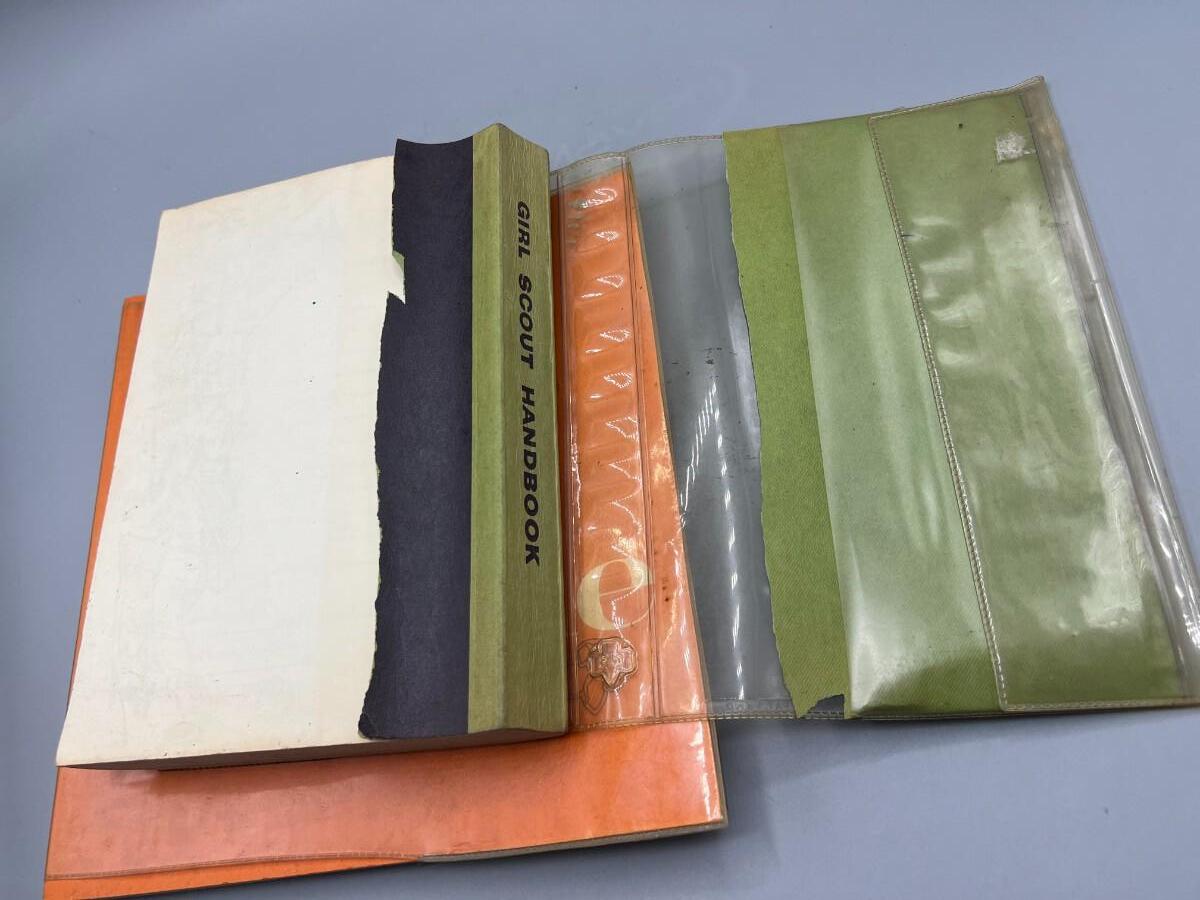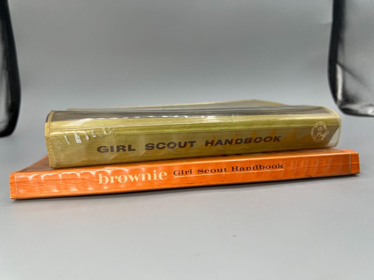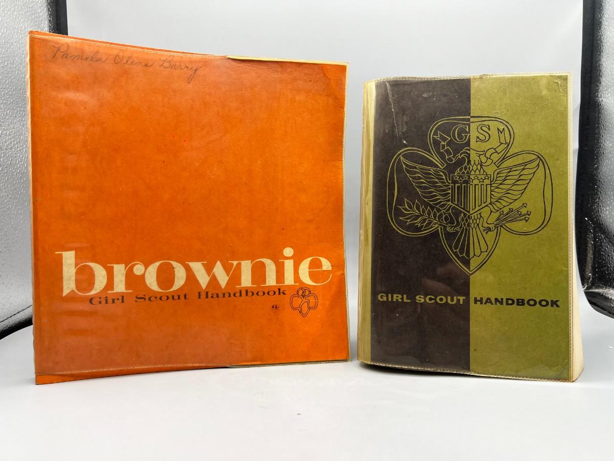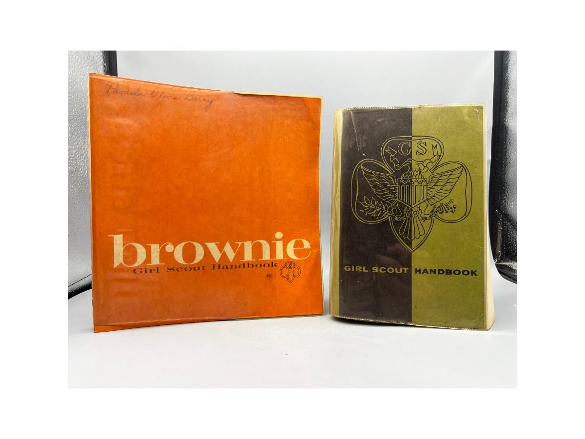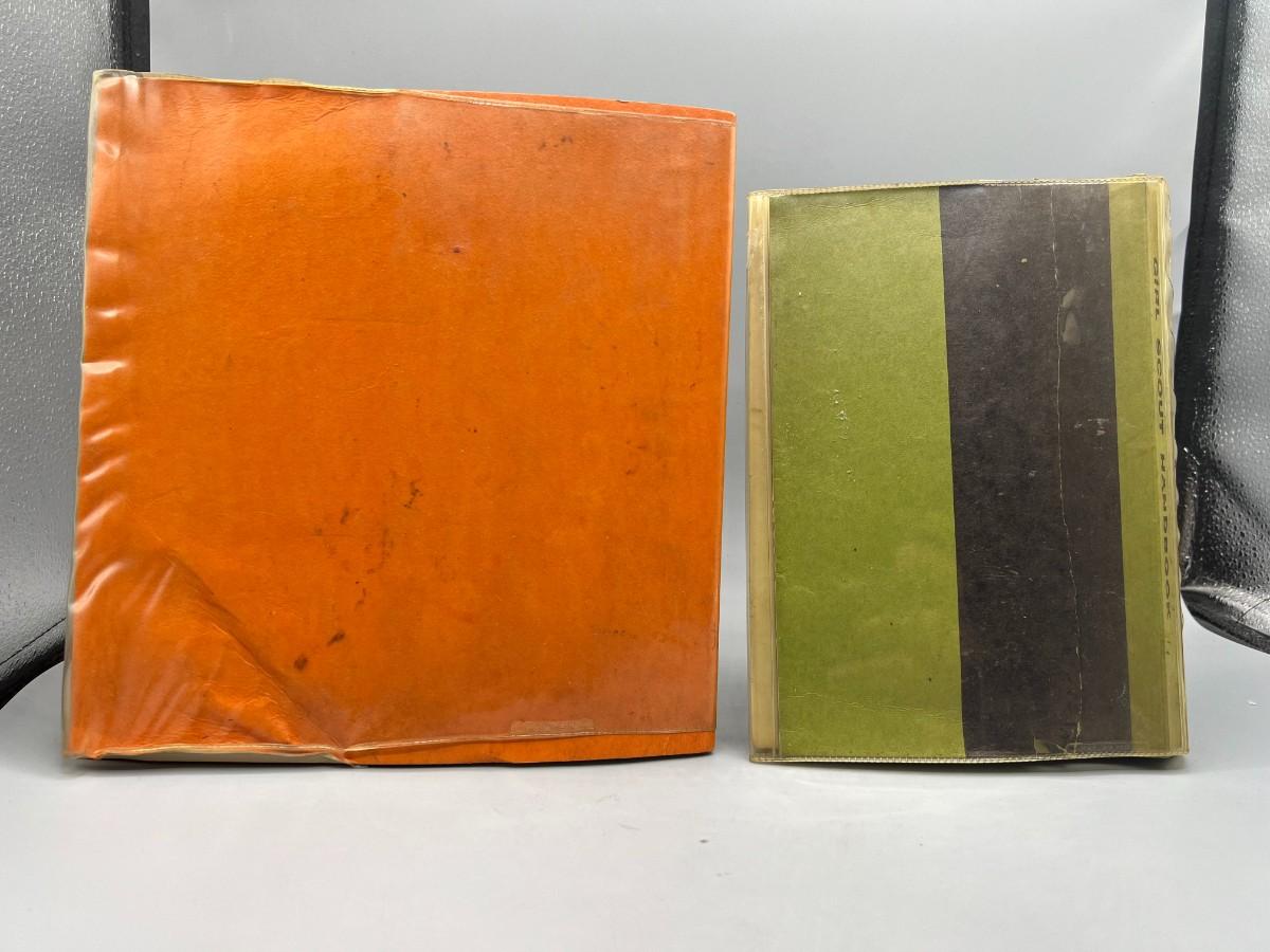 Vintage Girl Scout Brownie & Basic Handbook. The green basic handbook has a torn back cover. Fair vintage conditions.