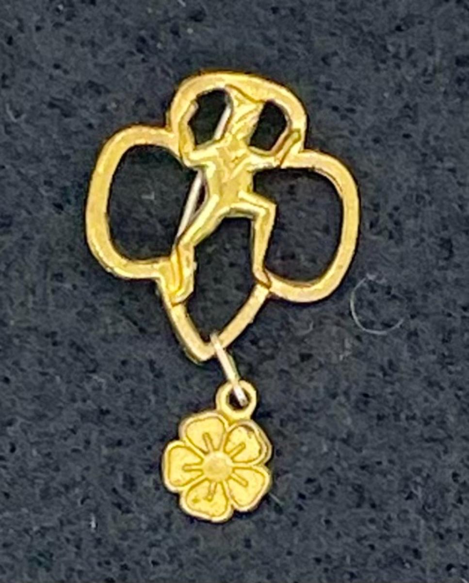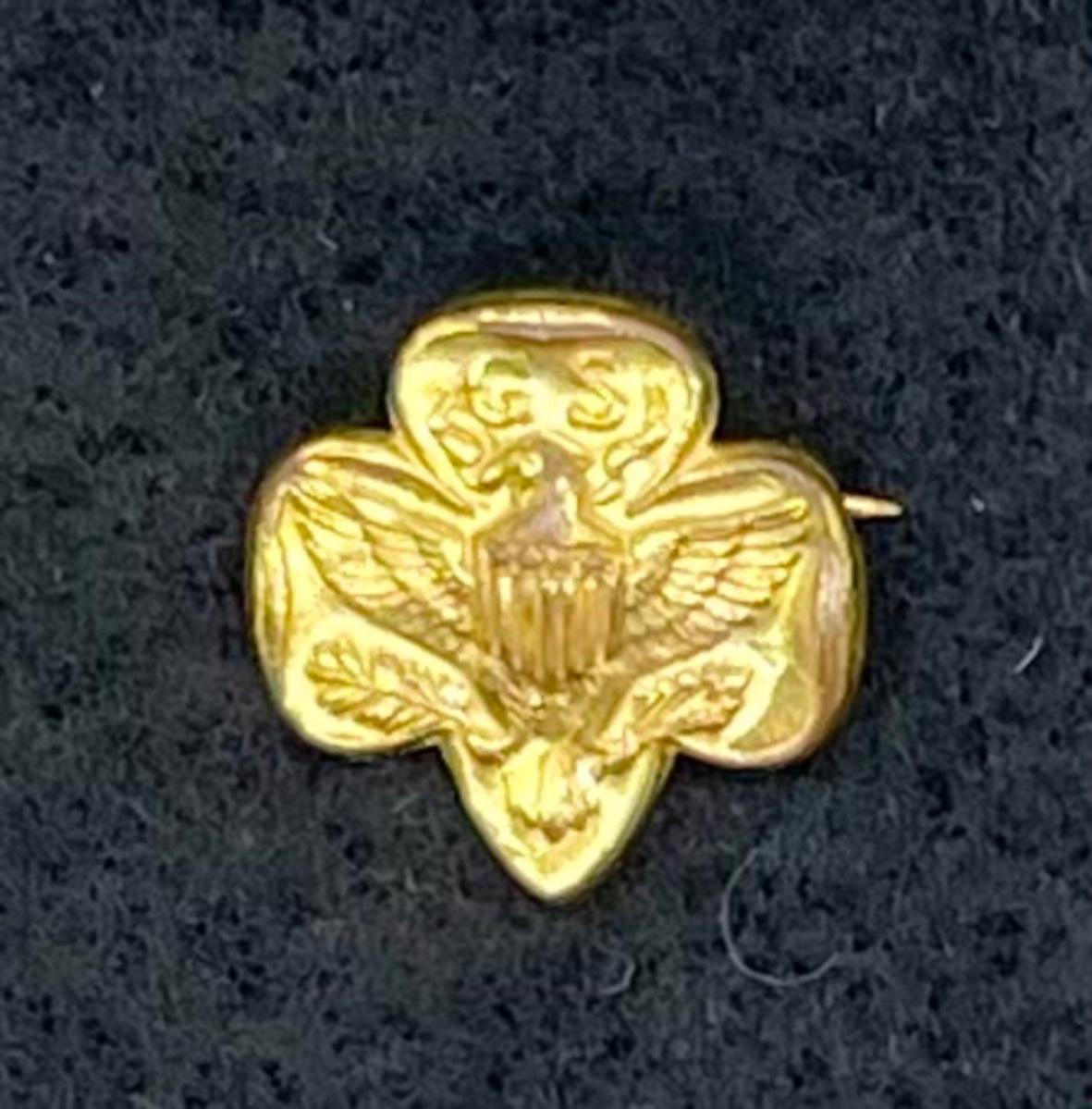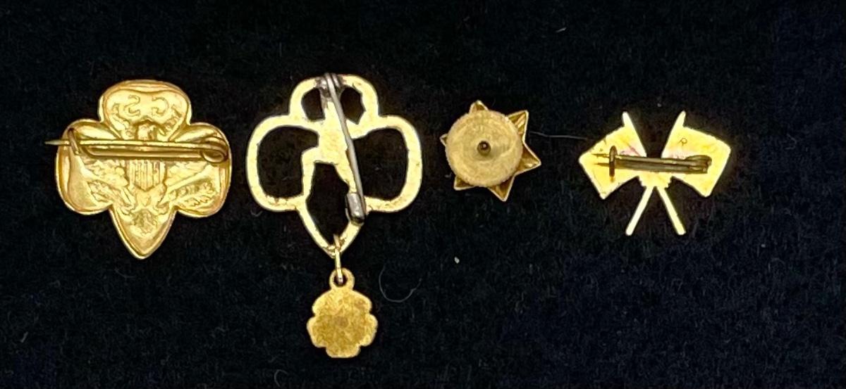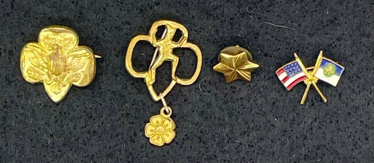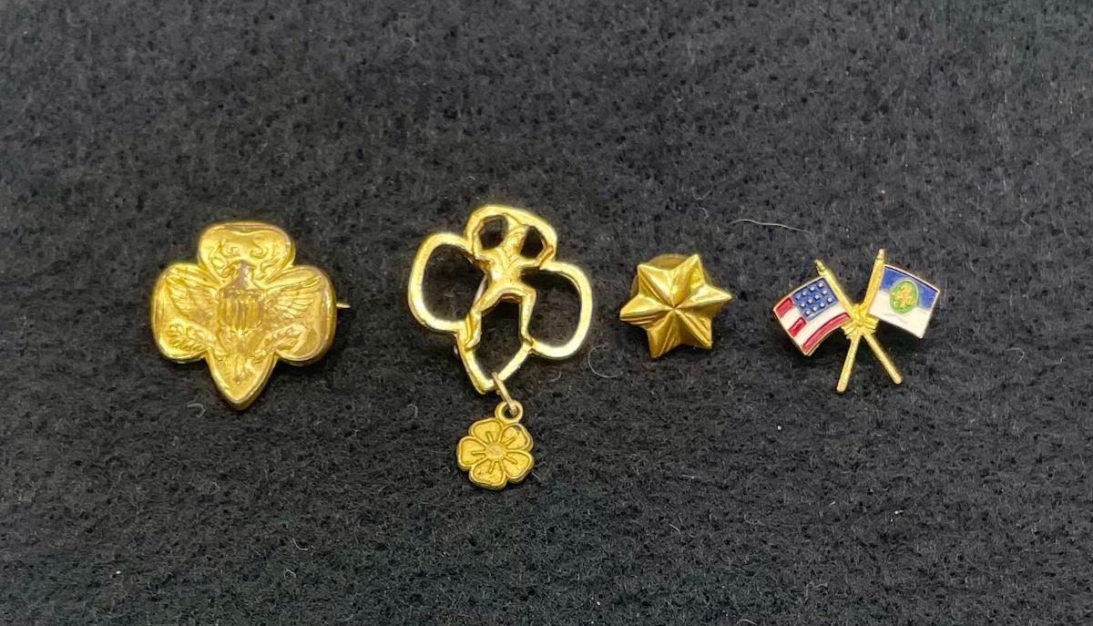 Girl Scout shield pin is steel, from the late in40's-early 1950"s. Brownie pin includes an attached 1-year flower charm. Also includes are a gold membership star screw-back pin and a US Flag - Girl Scout Flag pin. All in great collectible condition.