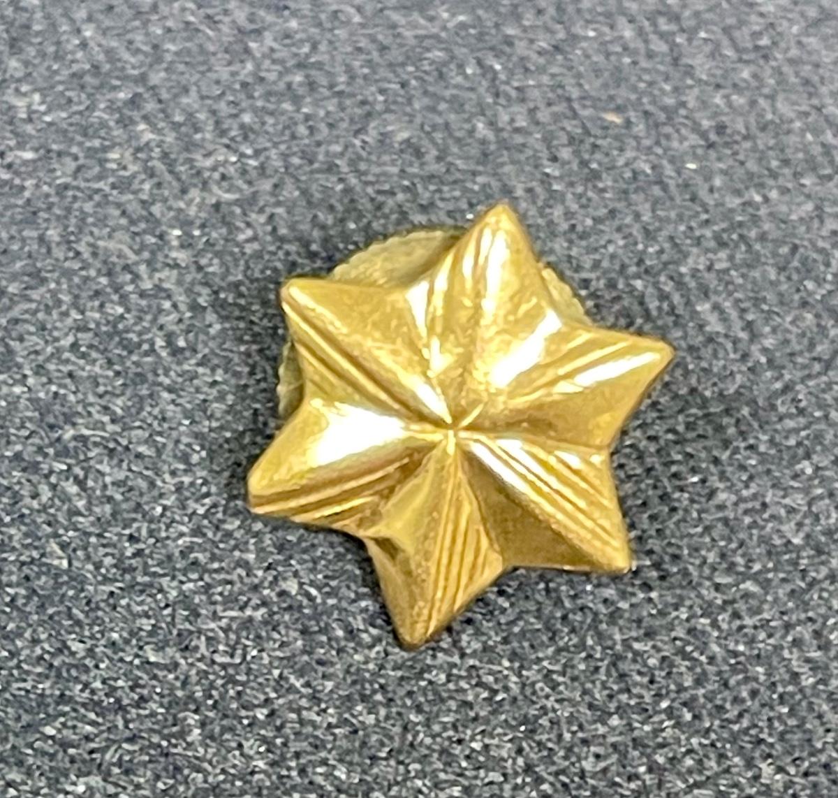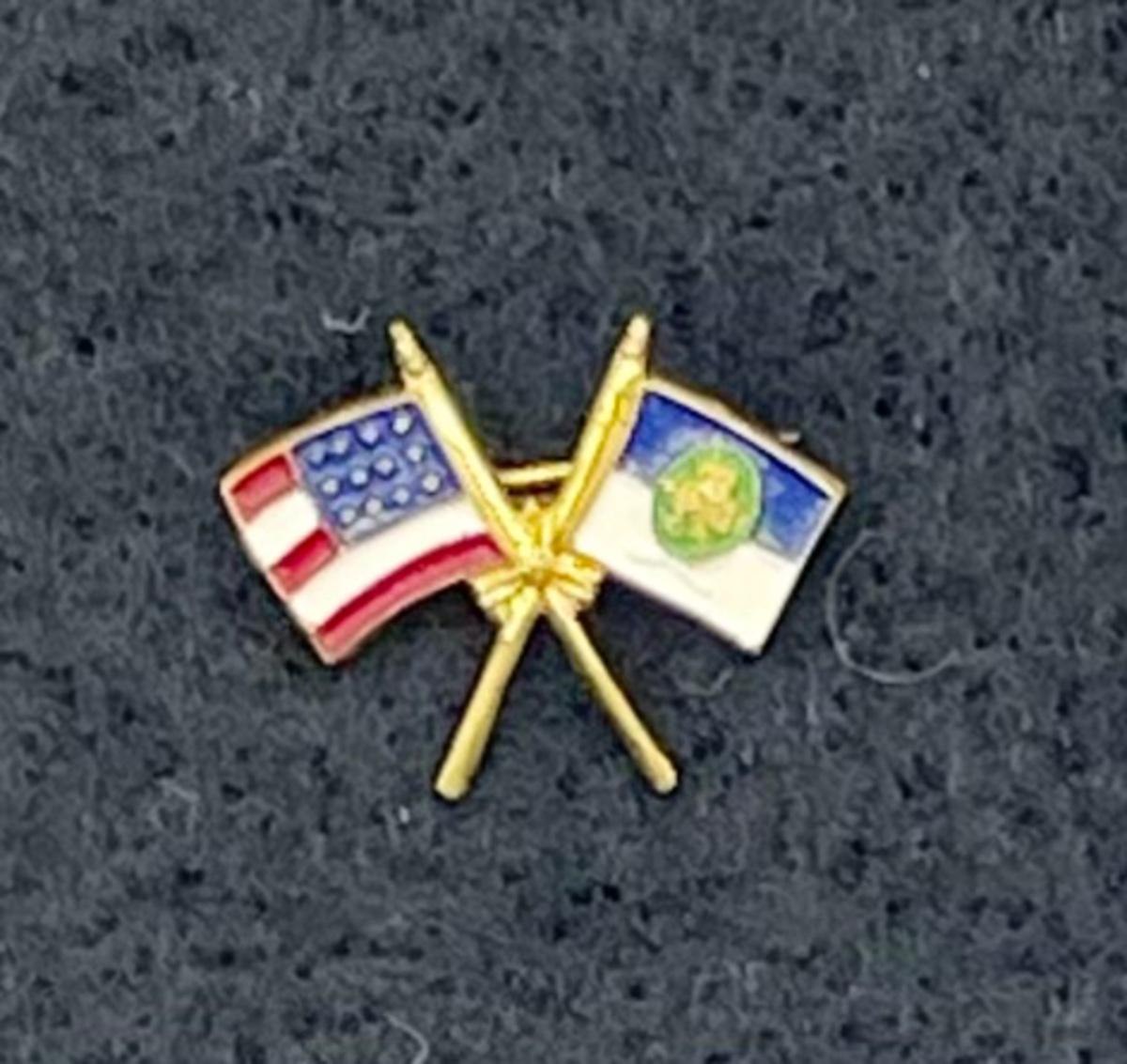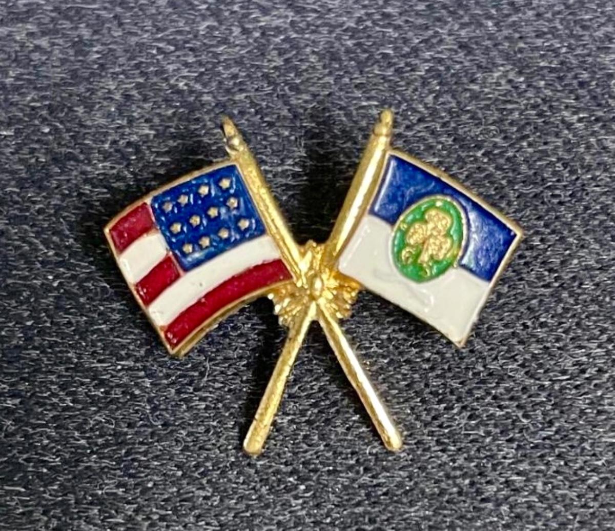 Girl Scout shield pin is steel, from the late in40's-early 1950"s. Brownie pin includes an attached 1-year flower charm. Also includes are a gold membership star screw-back pin and a US Flag - Girl Scout Flag pin. All in great collectible condition.