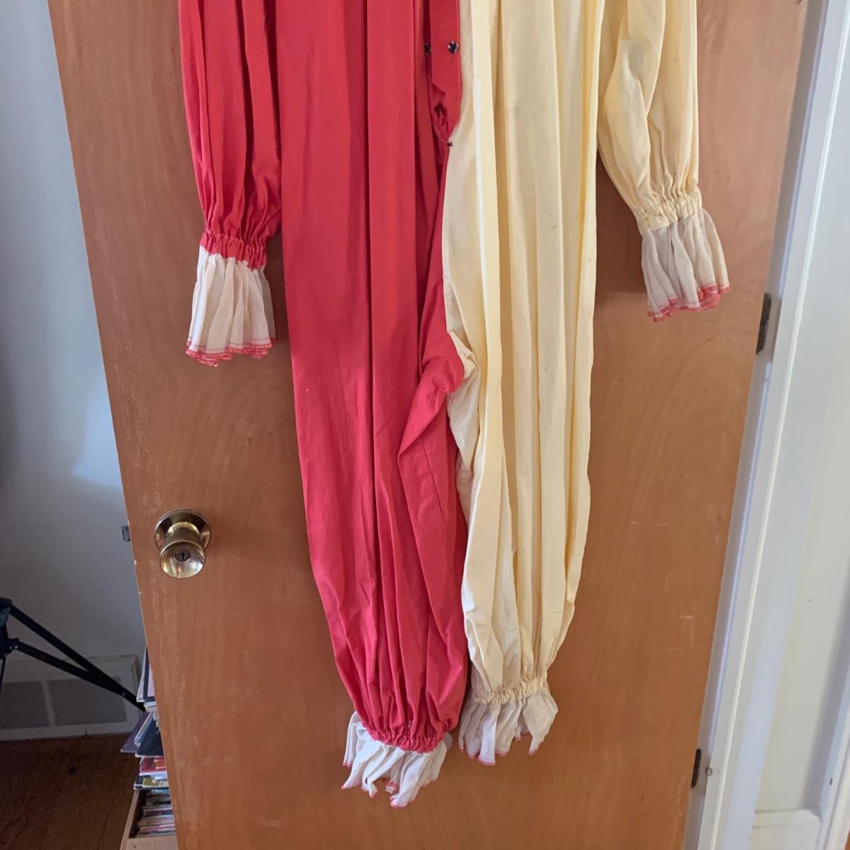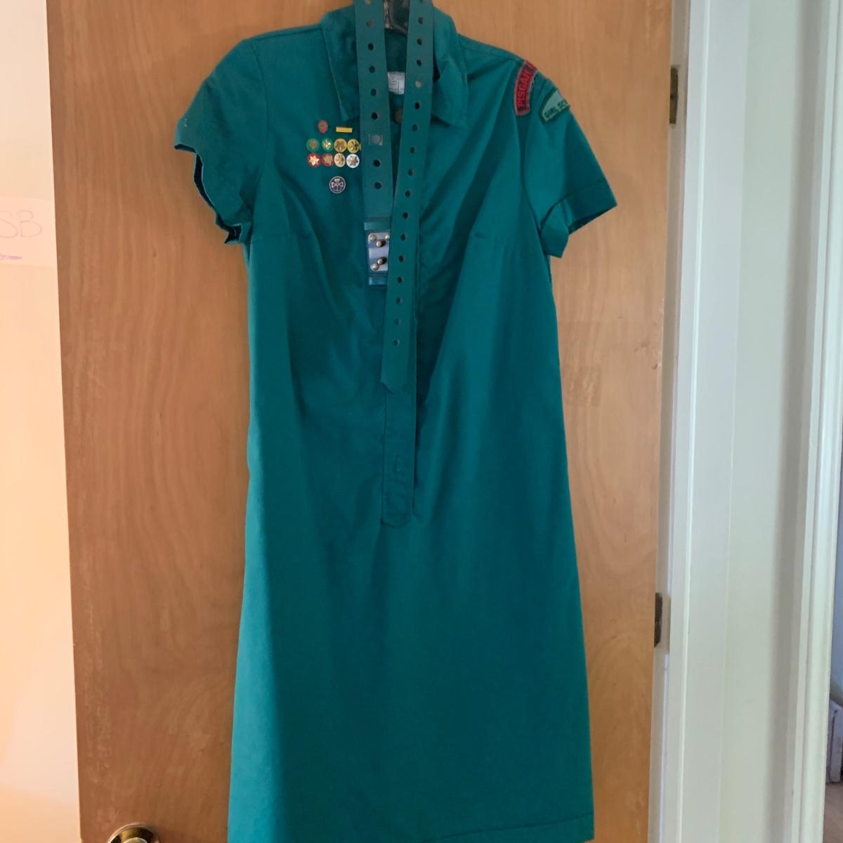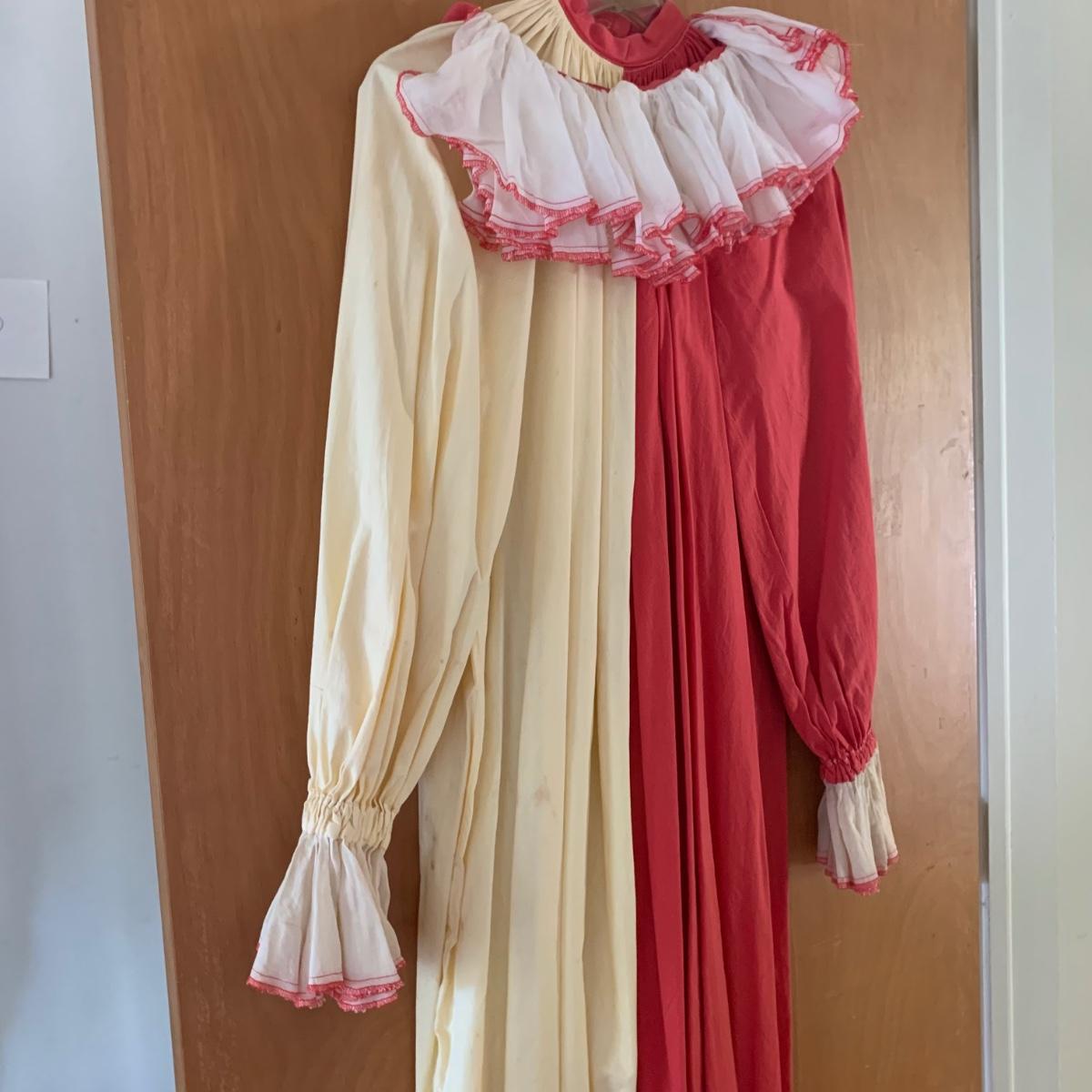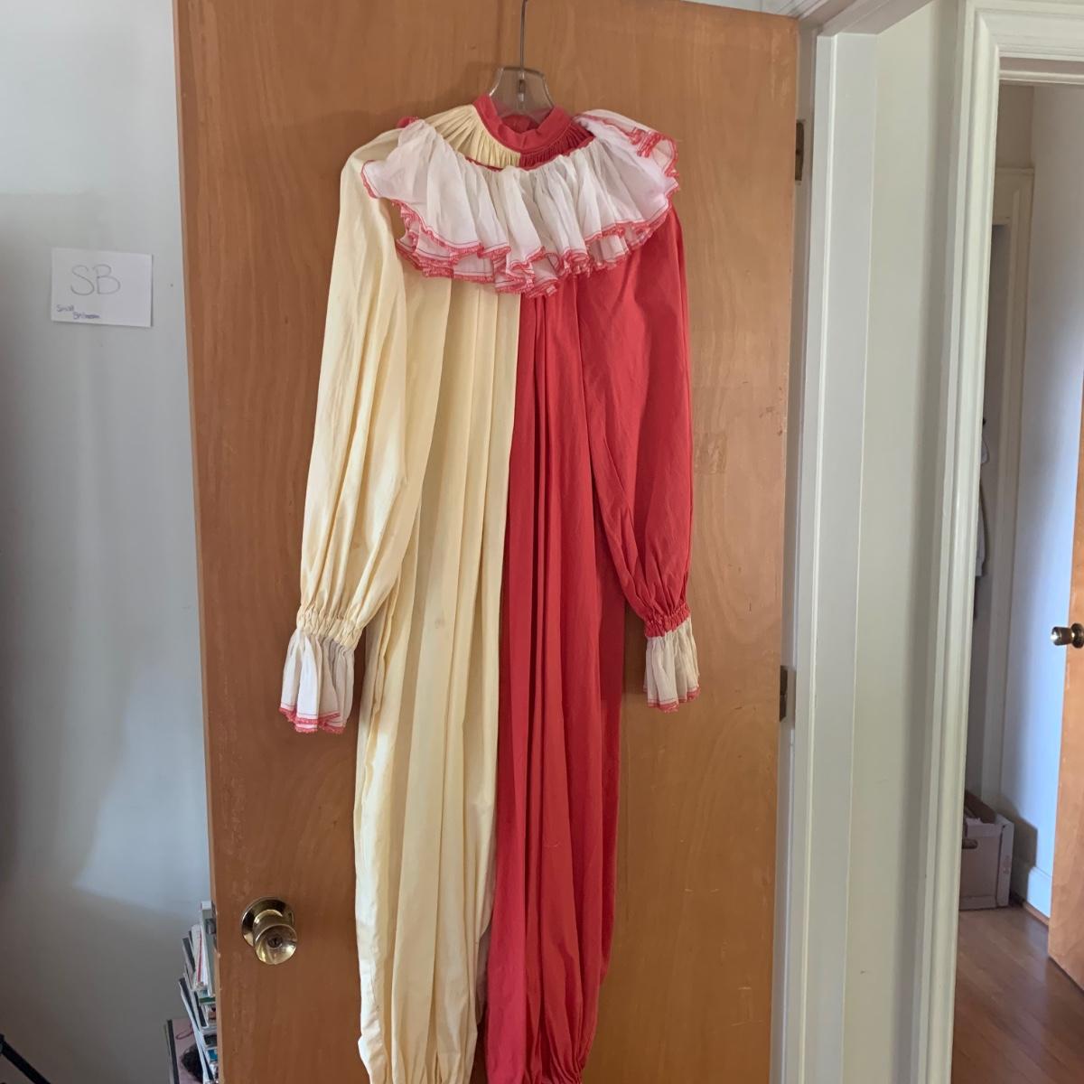 Two vintage outfits: one is a Girl Scout uniform and the other a clown costume. The Girl Scout uniform is a collared shirt sleeved calf length dress made of a polyester cotton blend. It is size 14. It comes with a belt and a felt vest with lots of pins and patches. The clown costume doesn’t have a size listed or a label. It is very roomy and seems that it could fit various adult sizes, possibly from medium to 2X. It has snap closures on the back and comes with a frilly neck decoration. There are some stains on the cream colored part of the fabric. Shipping available.
