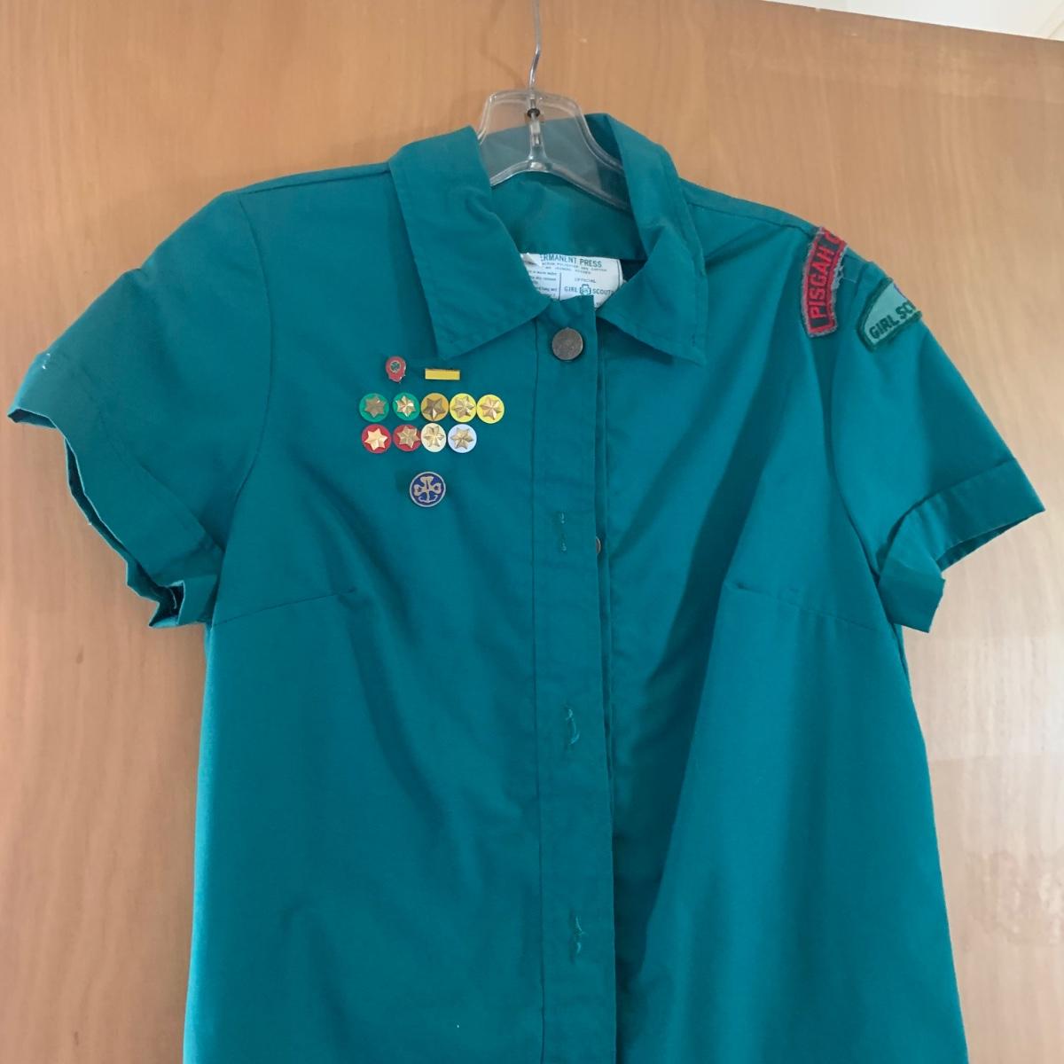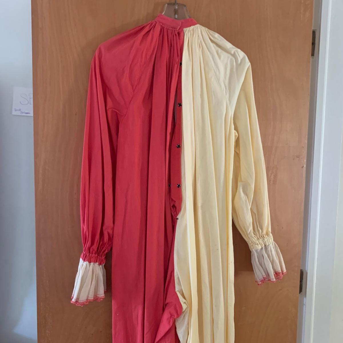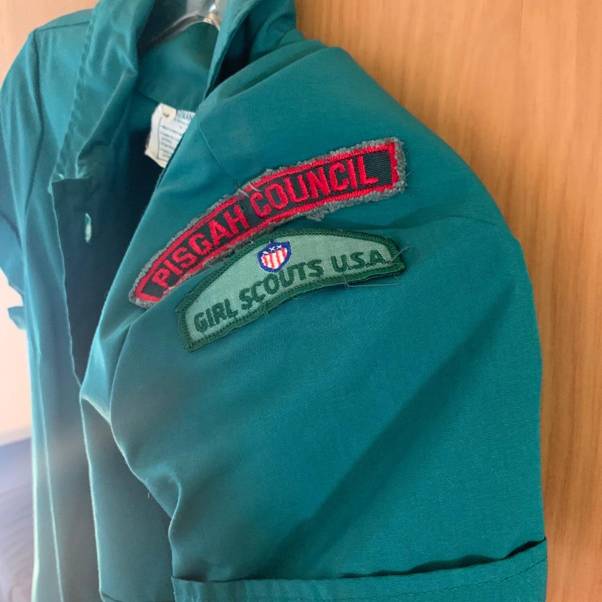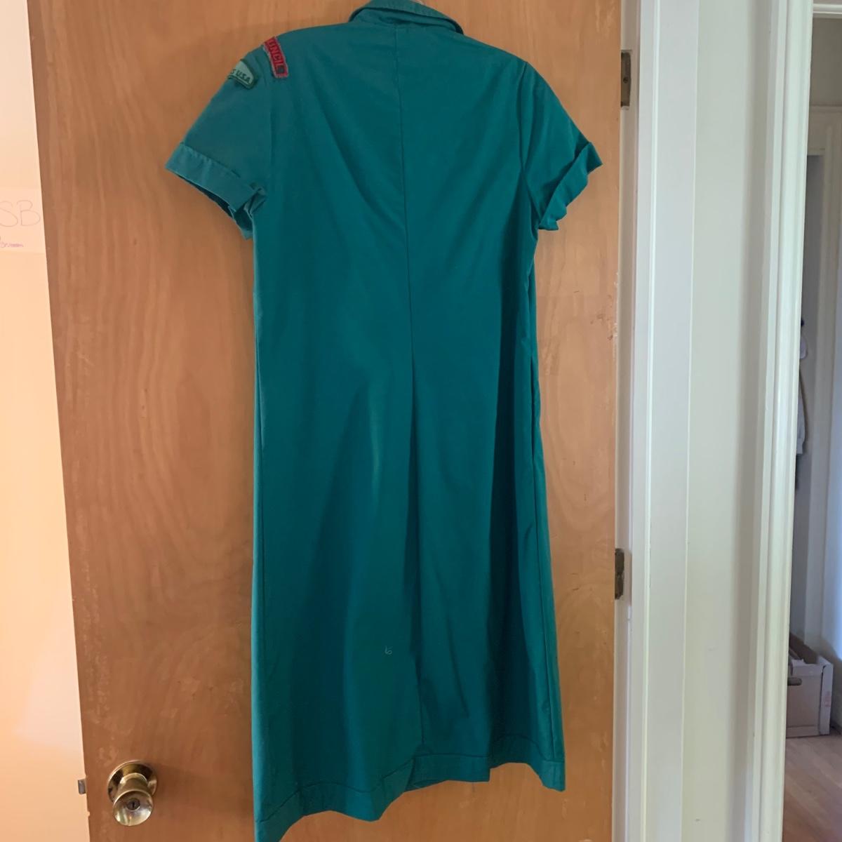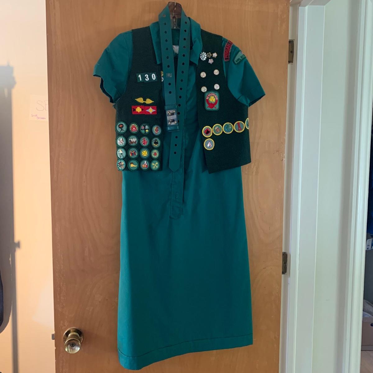 Two vintage outfits: one is a Girl Scout uniform and the other a clown costume. The Girl Scout uniform is a collared shirt sleeved calf length dress made of a polyester cotton blend. It is size 14. It comes with a belt and a felt vest with lots of pins and patches. The clown costume doesn’t have a size listed or a label. It is very roomy and seems that it could fit various adult sizes, possibly from medium to 2X. It has snap closures on the back and comes with a frilly neck decoration. There are some stains on the cream colored part of the fabric. Shipping available.