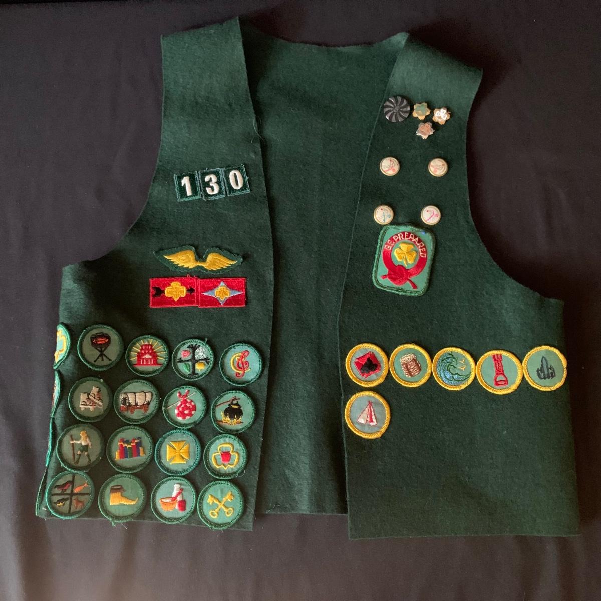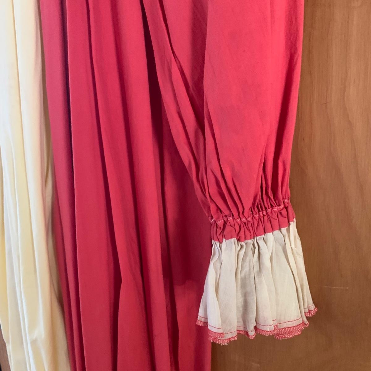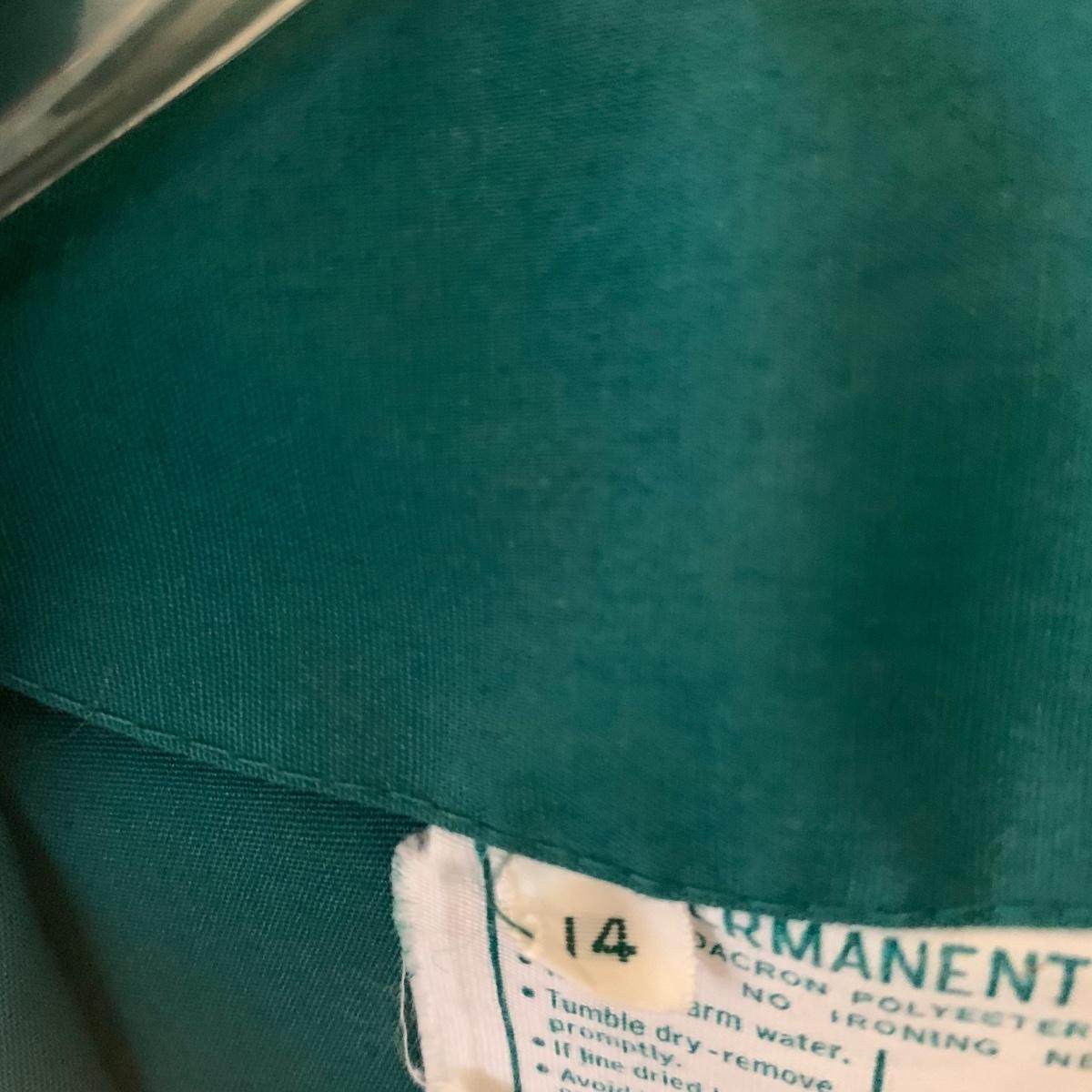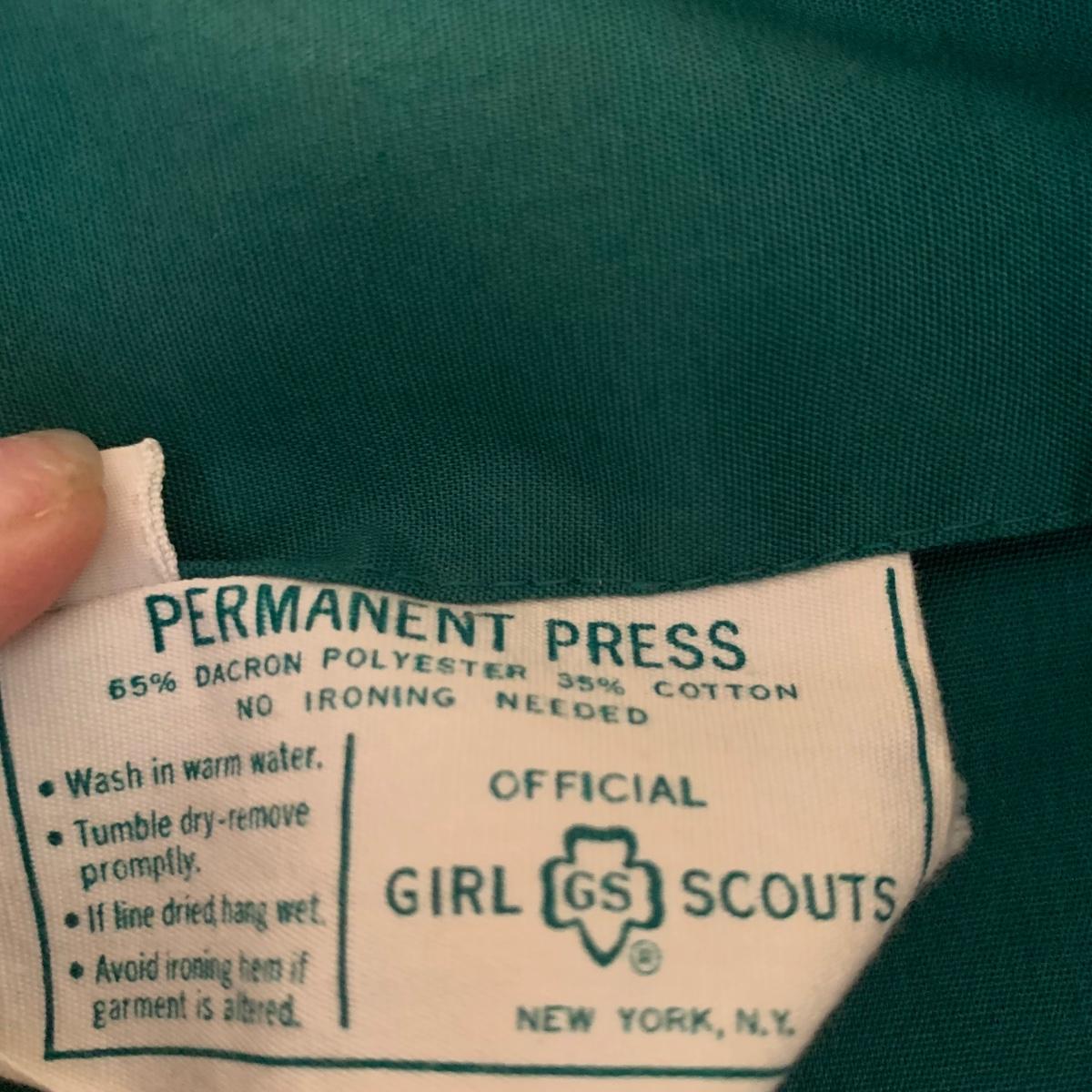 Two vintage outfits: one is a Girl Scout uniform and the other a clown costume. The Girl Scout uniform is a collared shirt sleeved calf length dress made of a polyester cotton blend. It is size 14. It comes with a belt and a felt vest with lots of pins and patches. The clown costume doesn’t have a size listed or a label. It is very roomy and seems that it could fit various adult sizes, possibly from medium to 2X. It has snap closures on the back and comes with a frilly neck decoration. There are some stains on the cream colored part of the fabric. Shipping available.
