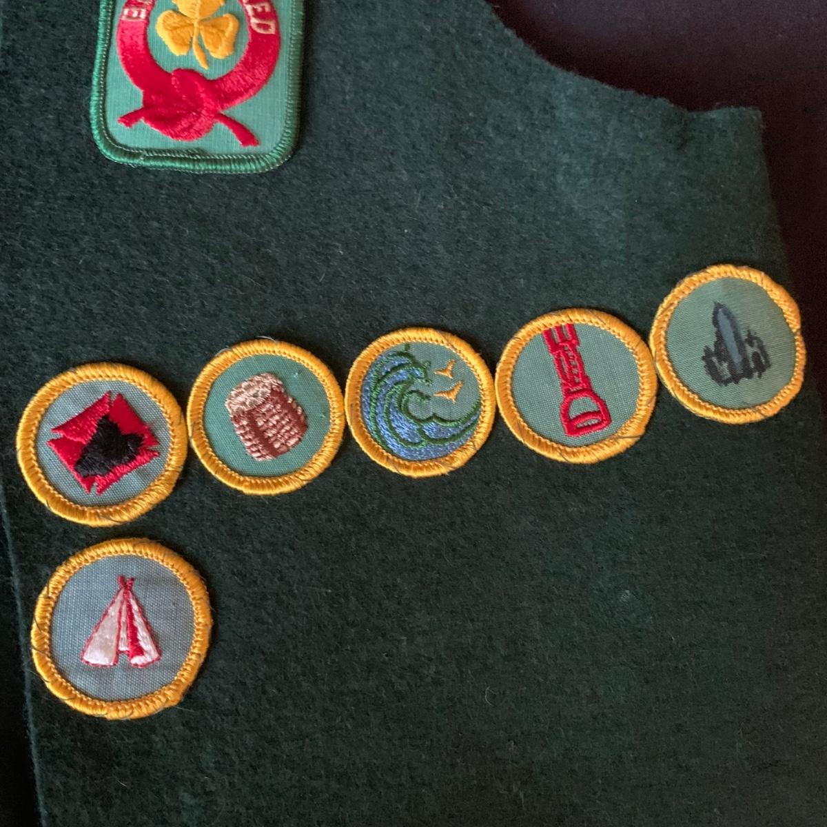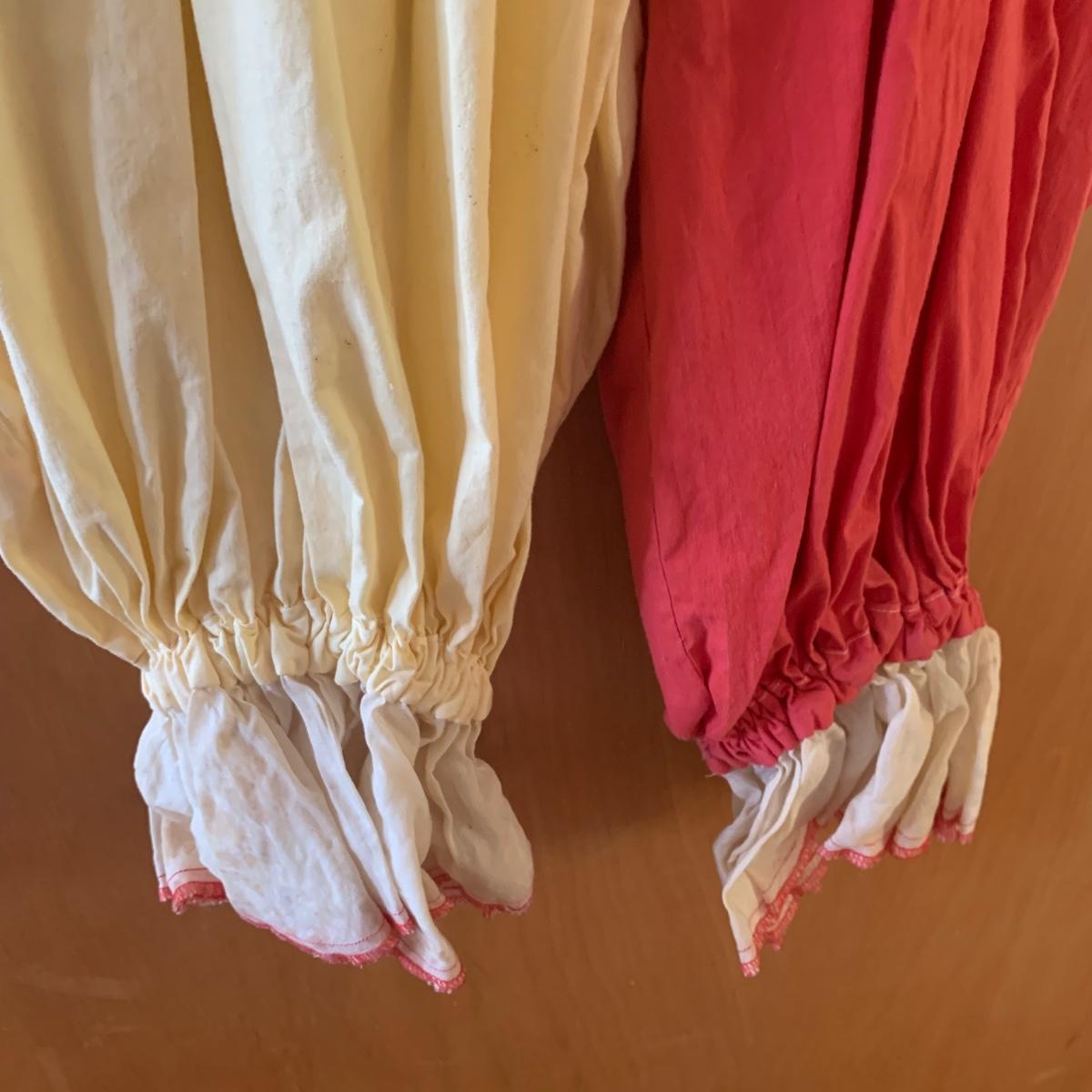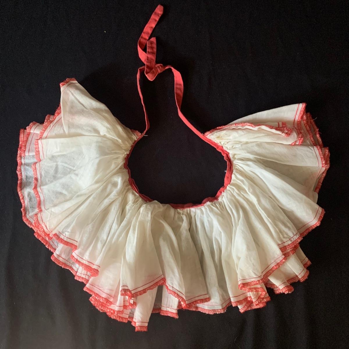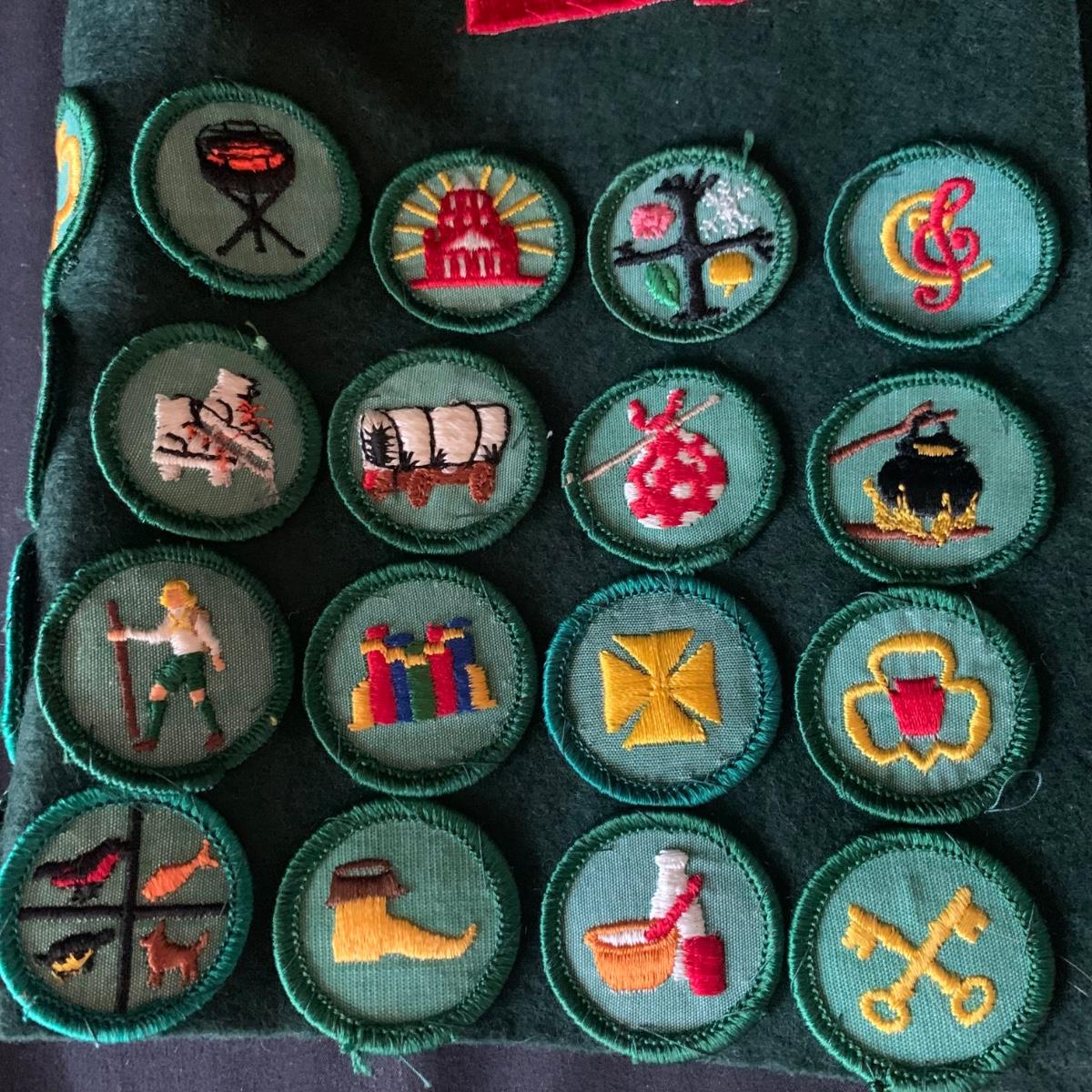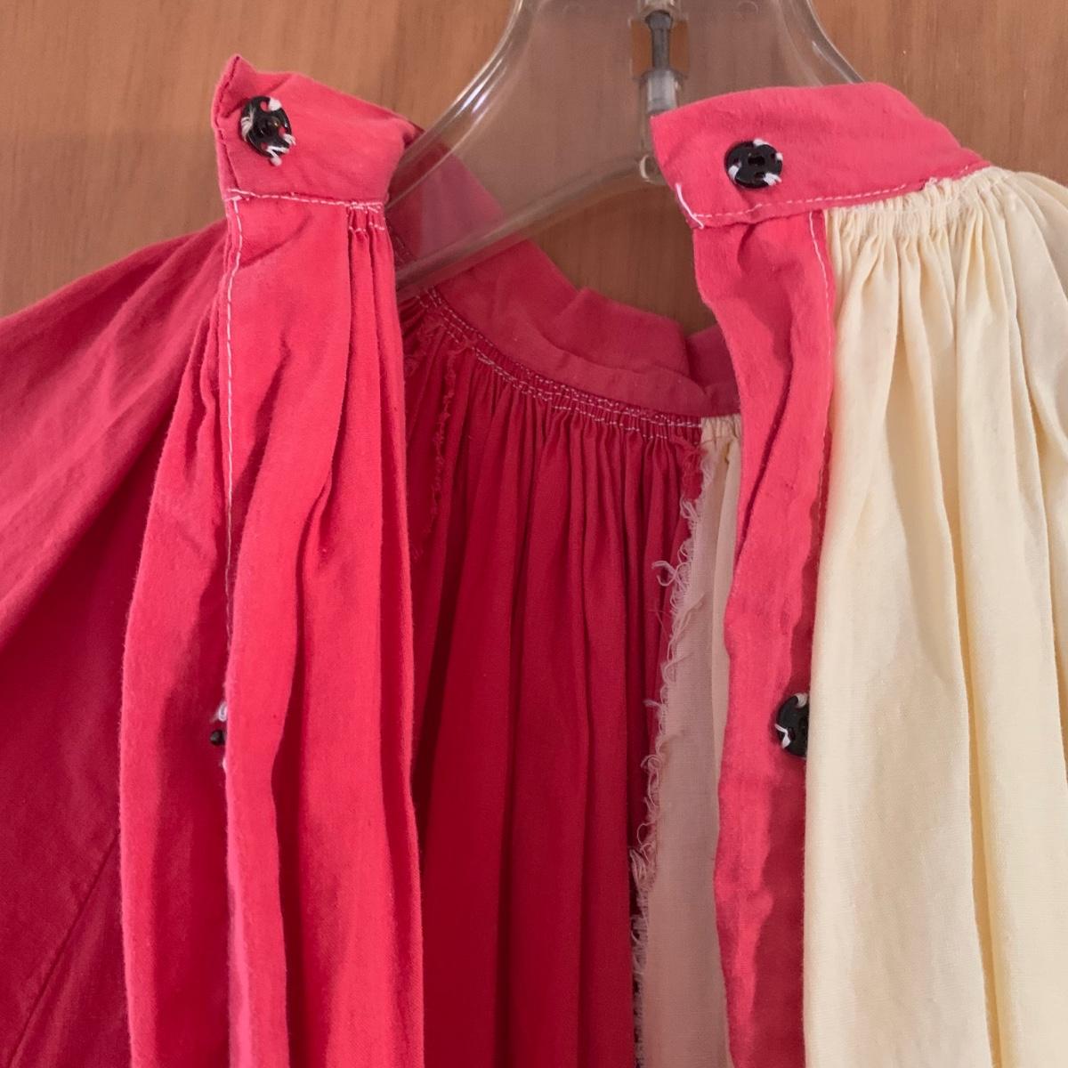 Two vintage outfits: one is a Girl Scout uniform and the other a clown costume. The Girl Scout uniform is a collared shirt sleeved calf length dress made of a polyester cotton blend. It is size 14. It comes with a belt and a felt vest with lots of pins and patches. The clown costume doesn’t have a size listed or a label. It is very roomy and seems that it could fit various adult sizes, possibly from medium to 2X. It has snap closures on the back and comes with a frilly neck decoration. There are some stains on the cream colored part of the fabric. Shipping available.