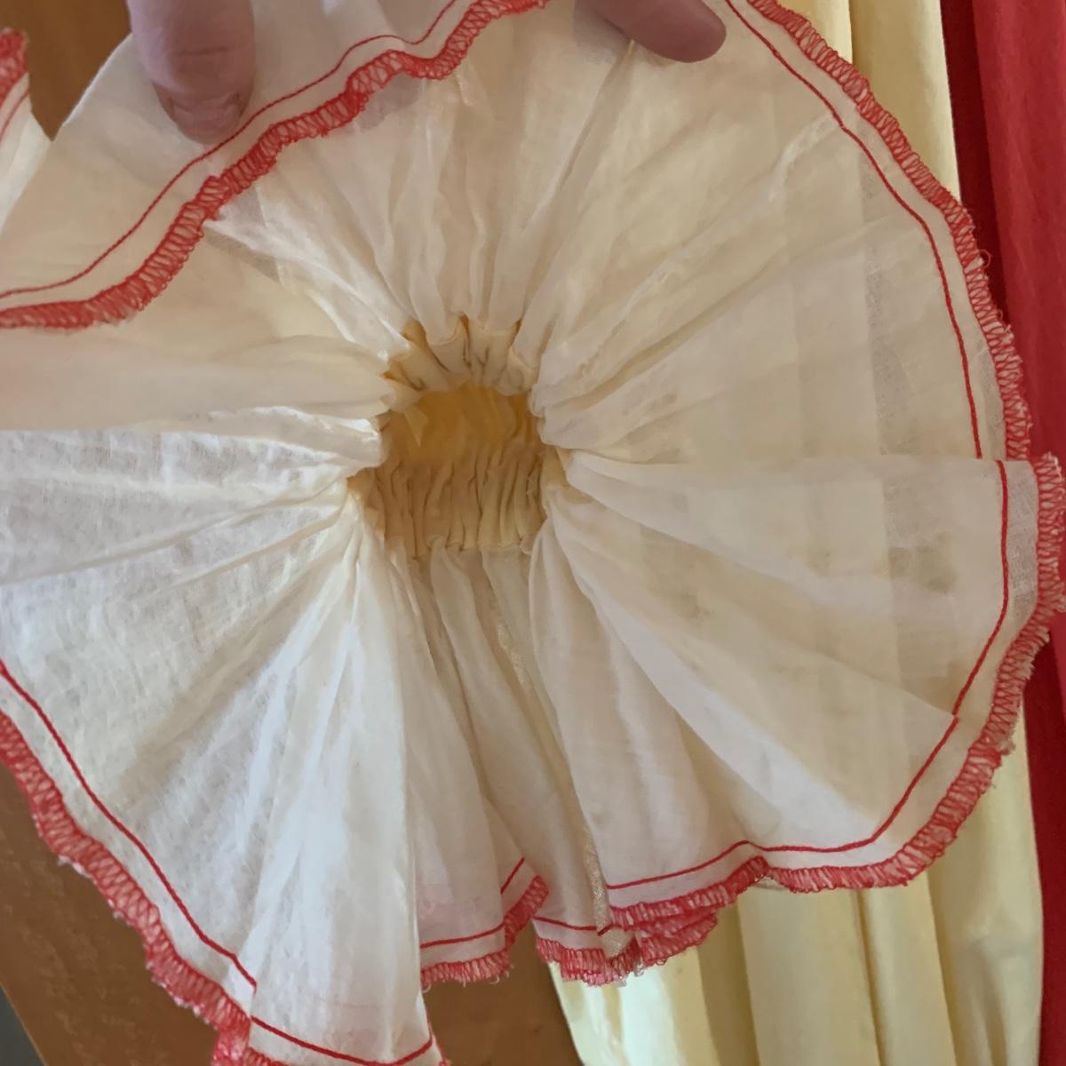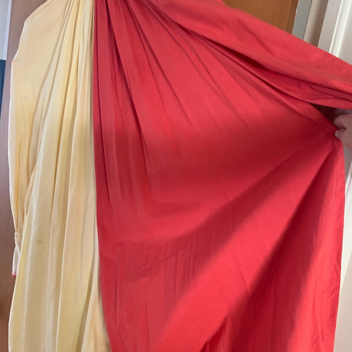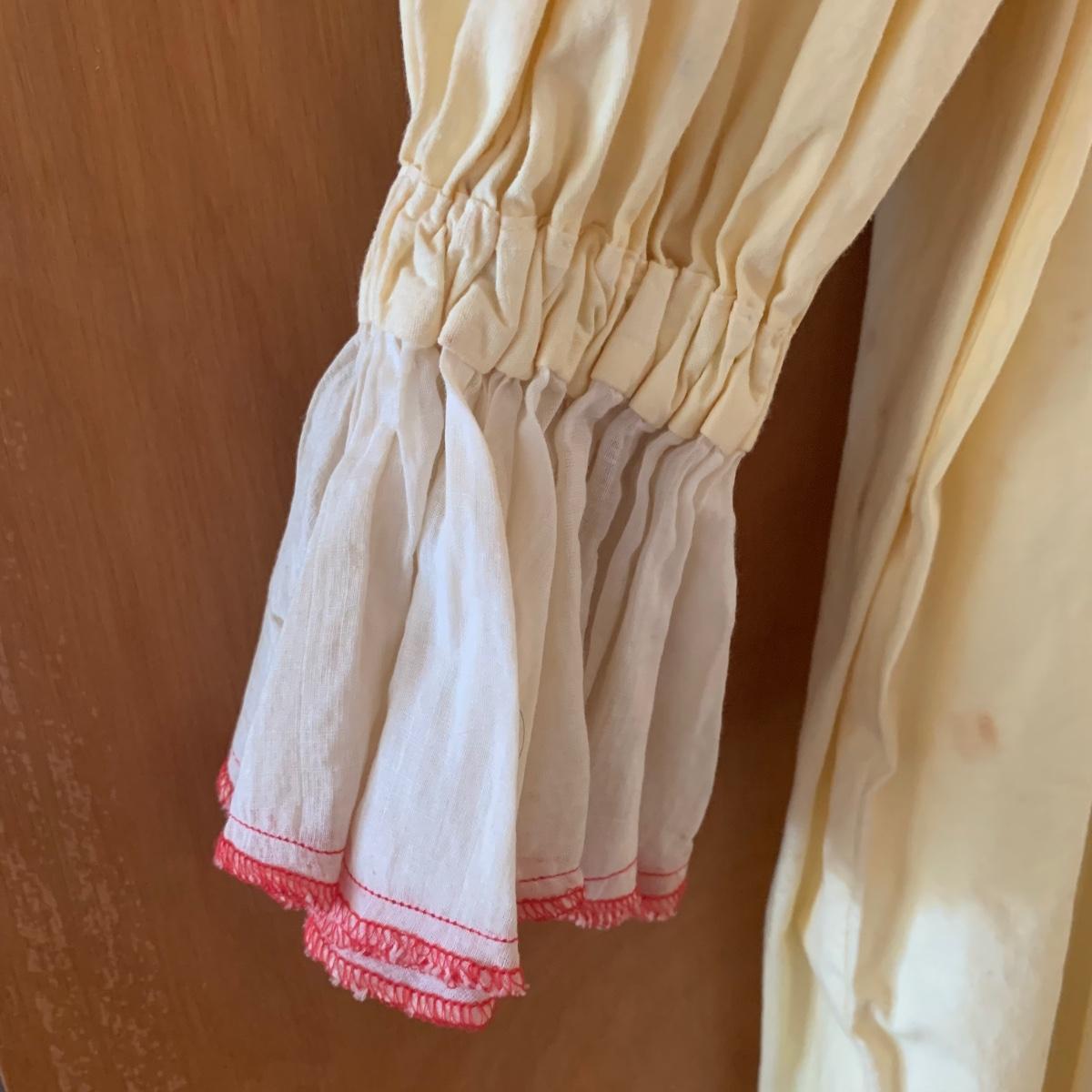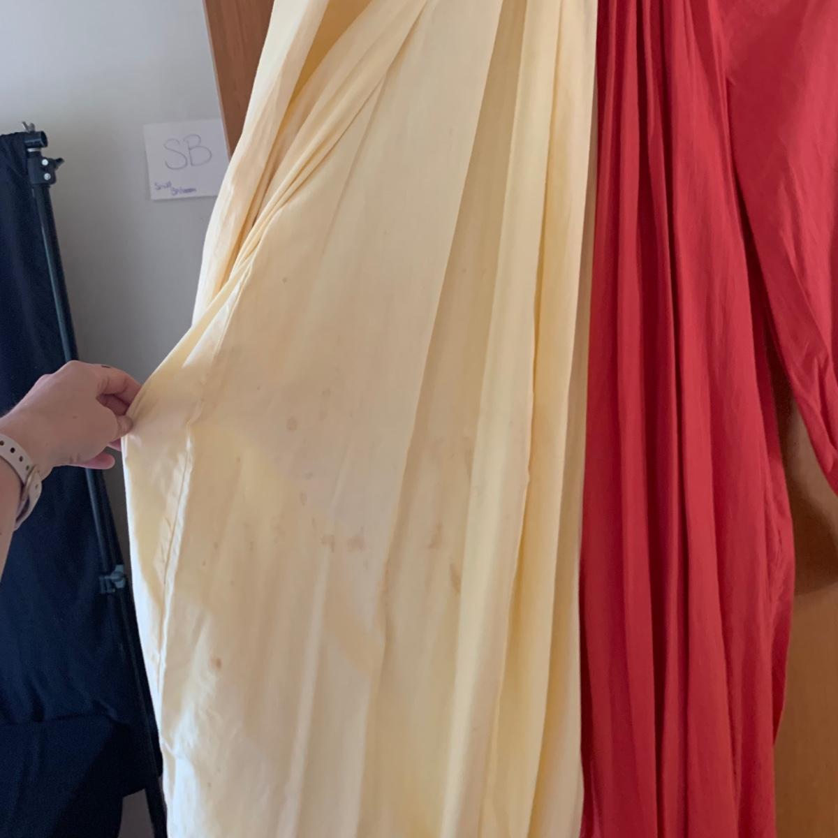 Two vintage outfits: one is a Girl Scout uniform and the other a clown costume. The Girl Scout uniform is a collared shirt sleeved calf length dress made of a polyester cotton blend. It is size 14. It comes with a belt and a felt vest with lots of pins and patches. The clown costume doesn’t have a size listed or a label. It is very roomy and seems that it could fit various adult sizes, possibly from medium to 2X. It has snap closures on the back and comes with a frilly neck decoration. There are some stains on the cream colored part of the fabric. Shipping available.