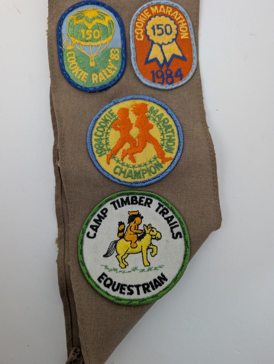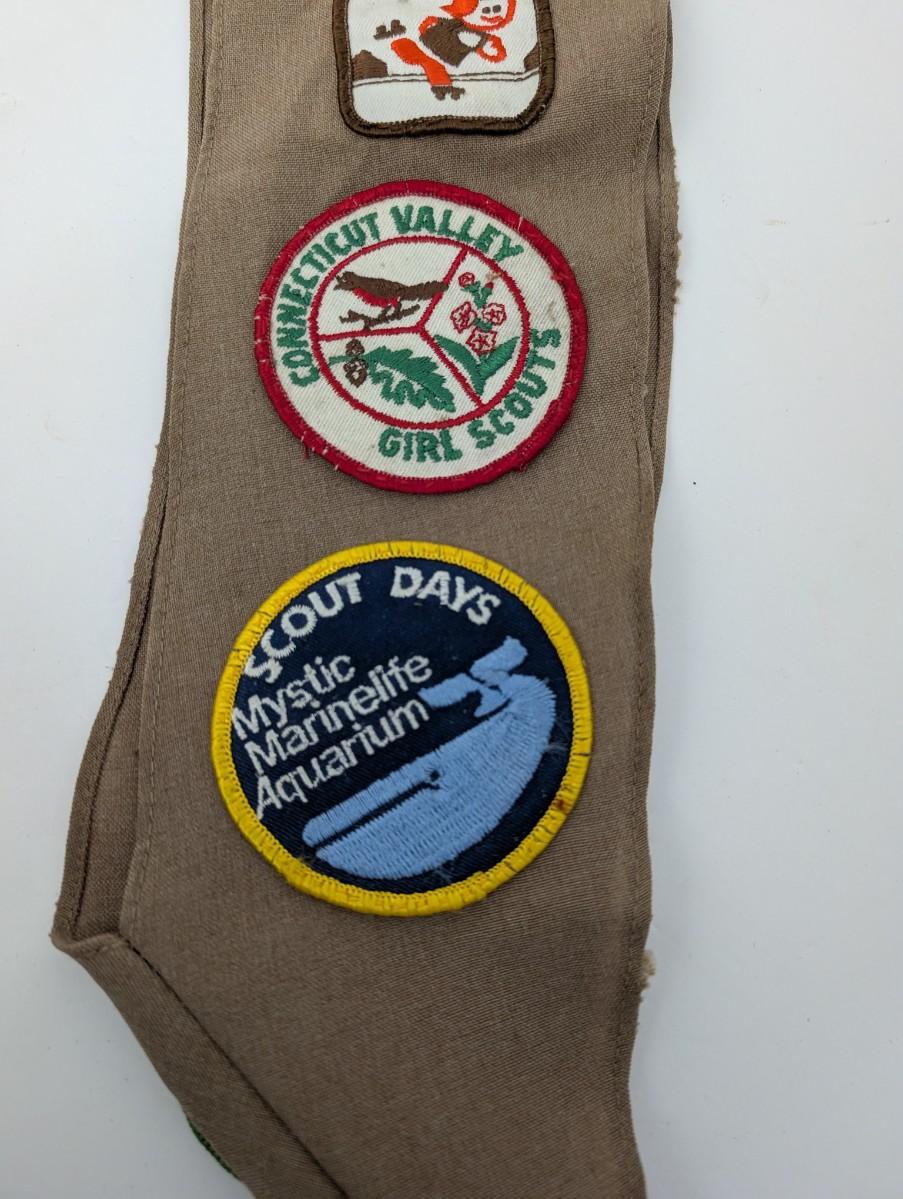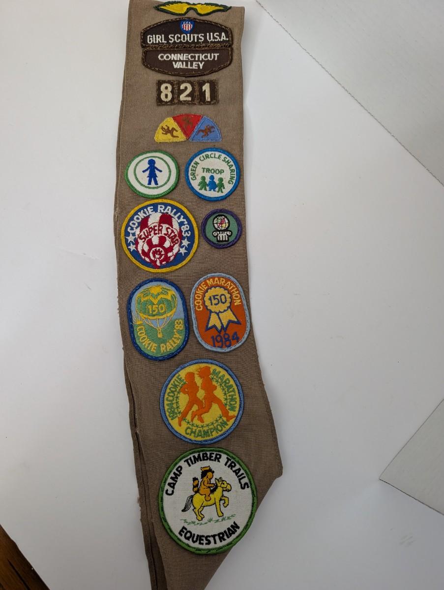 Tags: Girl Scouts, vintage sash, Connecticut Valley, Troop 821, 1980s scouting, embroidered badges, Camp Timber Trails, Mystic Aquarium, collectible patches, Girl Scout memorabilia, retro uniform