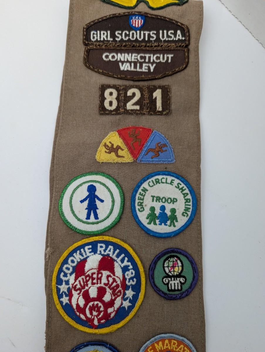 Tags: Girl Scouts, vintage sash, Connecticut Valley, Troop 821, 1980s scouting, embroidered badges, Camp Timber Trails, Mystic Aquarium, collectible patches, Girl Scout memorabilia, retro uniform