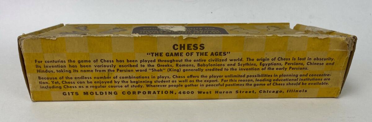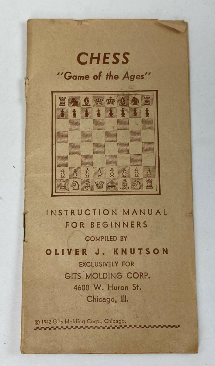 With the original box here is a small #500 set of mottled Ivory and Black plastic Chessmen from Gits Molding of Chicago circa 1942...The King stands 2 1/8" tall...in the Staunton pattern...Endorsed by the United States Chess Association...Some wear to the original box which includes Instruction Manual for Beginners...Pieces not weighted or felted