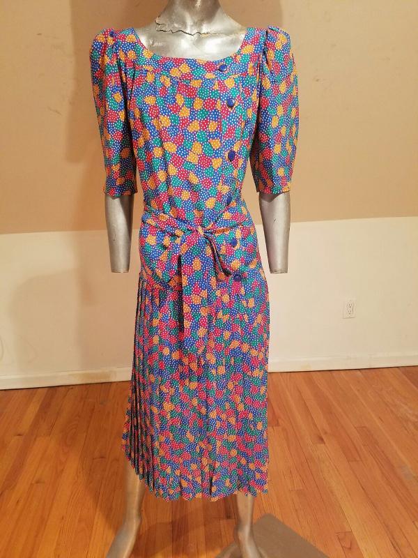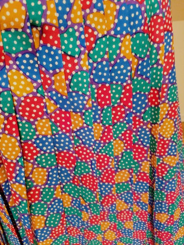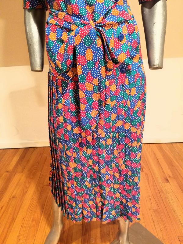 Colorful design, low waist with pleated skirt and sash belt.