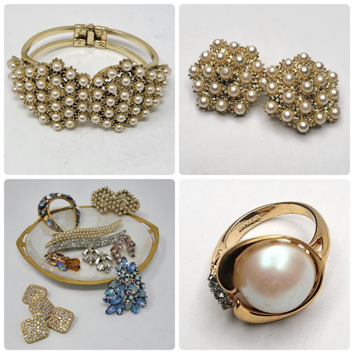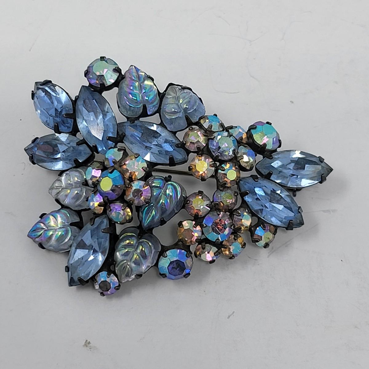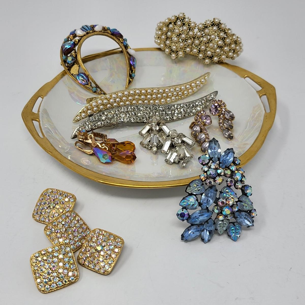 Four pairs clip earrings 1" to 1.5". Two blue/aurora rhinestone brooches 2" to 2.5", one is marked Florenza (missing 1 faux pearl). Two 4" hair clips, clear rhinestone, faux pearl. Gorgeous clamp style bracelet that matches one of the pairs of earrings. Faux pearl & gold plated ring size 5. Set of four sparkly aurora borealis buttons.