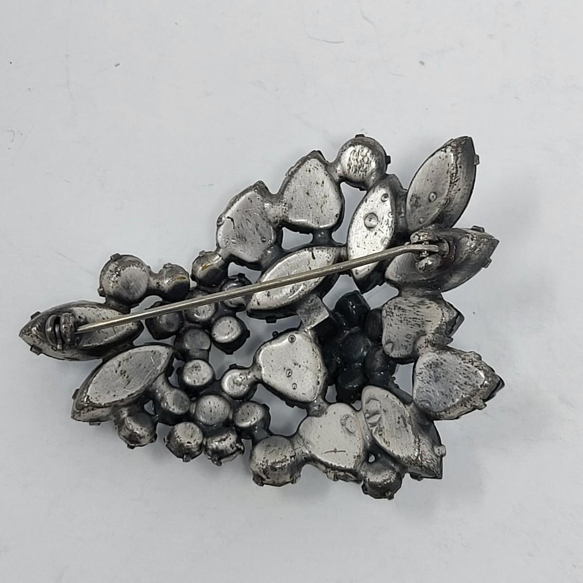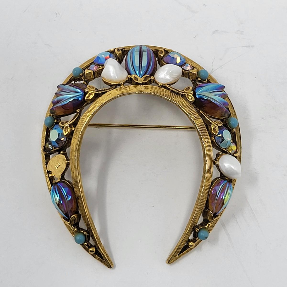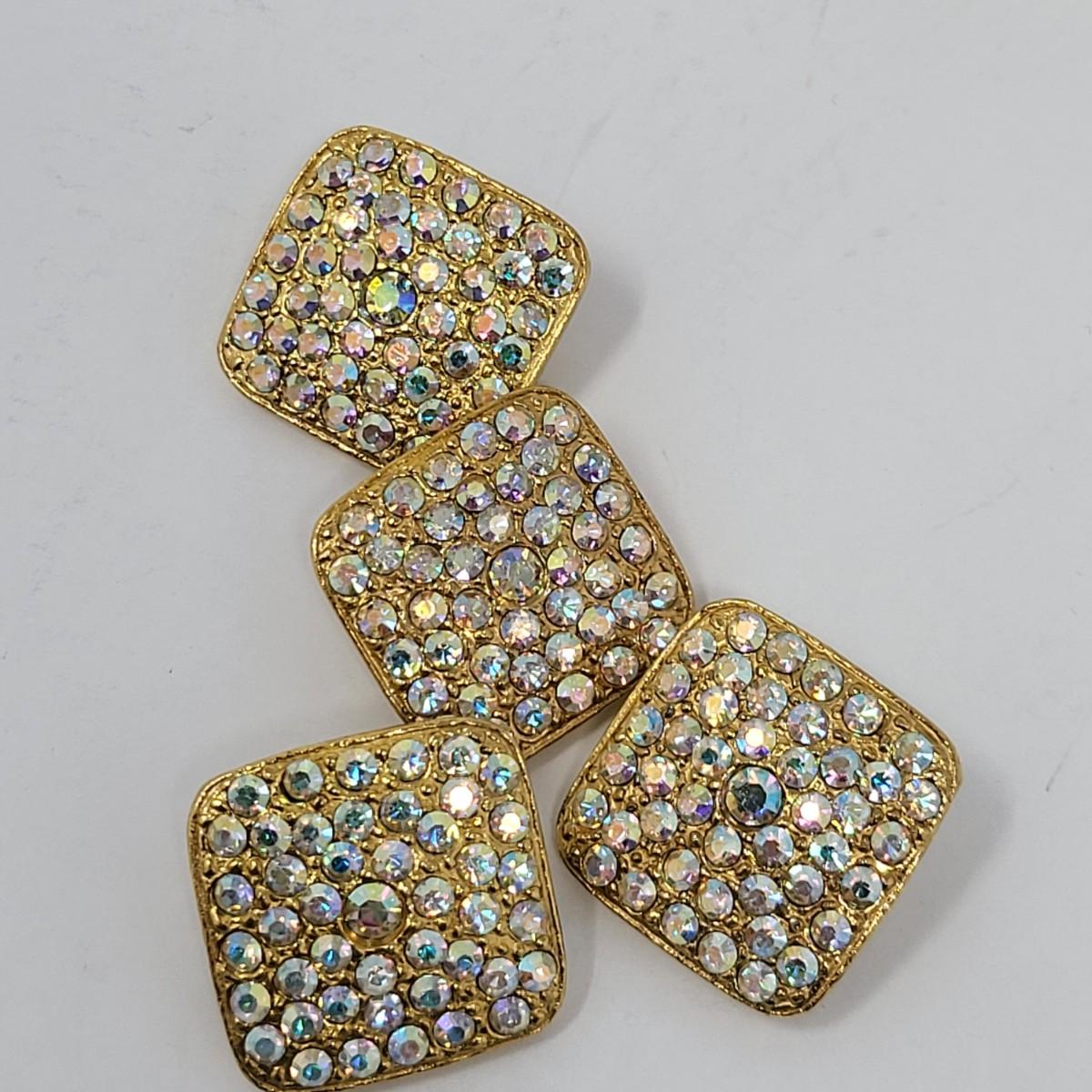 Four pairs clip earrings 1" to 1.5". Two blue/aurora rhinestone brooches 2" to 2.5", one is marked Florenza (missing 1 faux pearl). Two 4" hair clips, clear rhinestone, faux pearl. Gorgeous clamp style bracelet that matches one of the pairs of earrings. Faux pearl & gold plated ring size 5. Set of four sparkly aurora borealis buttons.