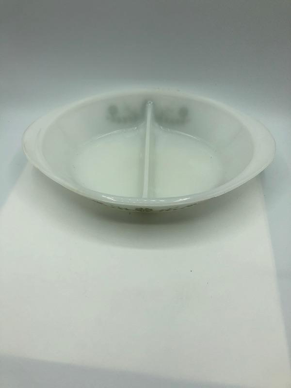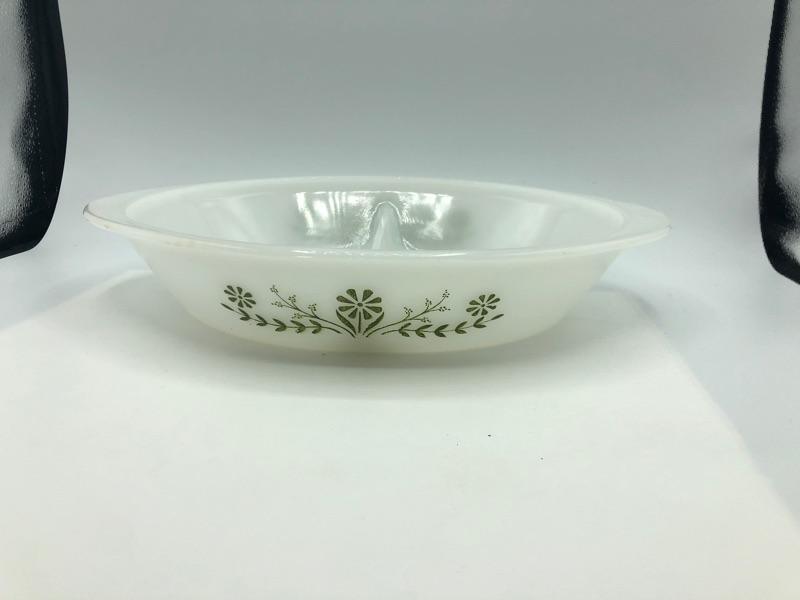 Vintage Glasbake Divided Casserole Dish. Green daisy flower pattern. Good condition. No lid.