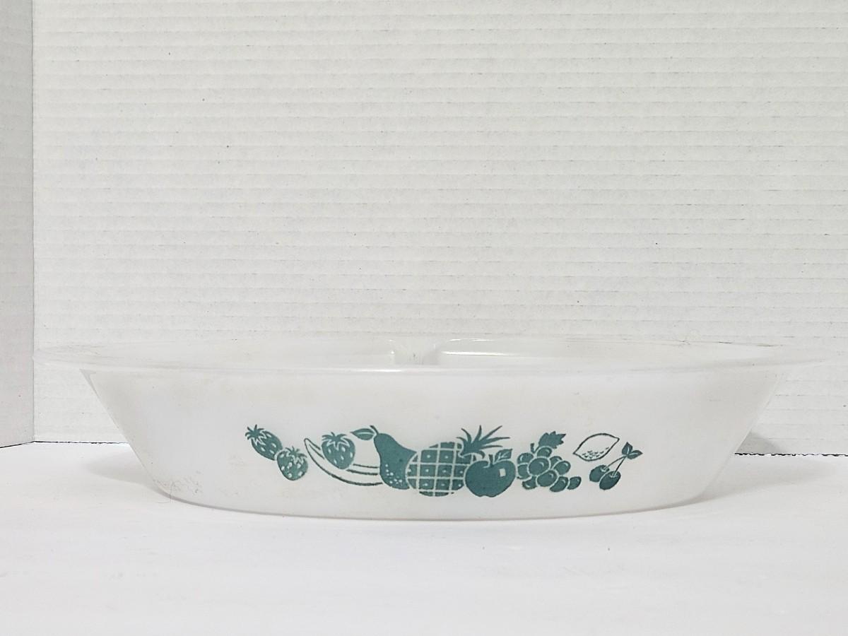 This is a charming vintage Glasbake oval divided serving dish, perfect for keeping different foods separated during oven-to-table service. The dish is made of white milk glass and features a lovely aqua or turquoise blue graphic of various fruits, including a pineapple, grapes, and strawberries. It was produced in the USA by the Jeannette Glass Co. and is known for its durable, retro style, adding a touch of mid-century charm to any kitchen or collection.