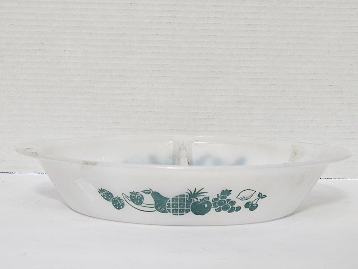 This is a charming vintage Glasbake oval divided serving dish, perfect for keeping different foods separated during oven-to-table service. The dish is made of white milk glass and features a lovely aqua or turquoise blue graphic of various fruits, including a pineapple, grapes, and strawberries. It was produced in the USA by the Jeannette Glass Co. and is known for its durable, retro style, adding a touch of mid-century charm to any kitchen or collection.