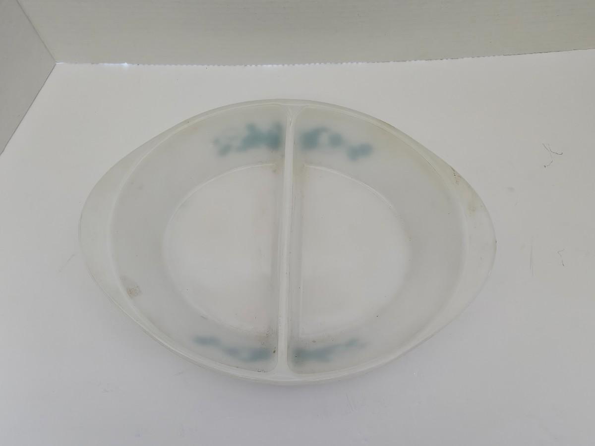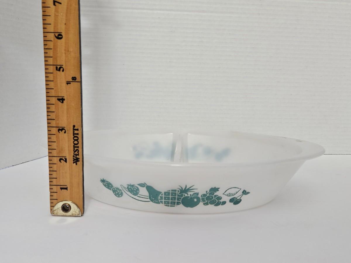Vintage Glasbake J-2352 Divided Serving Dish Milk Glass "Fruit Medley" Teal Made in USA