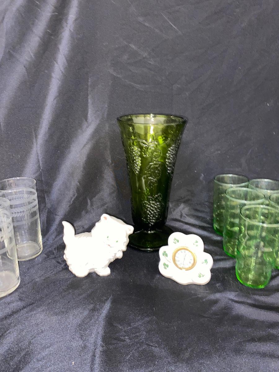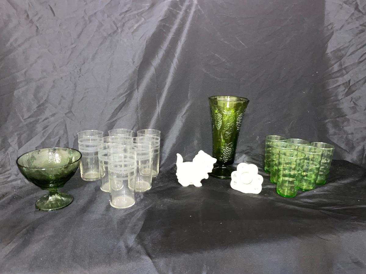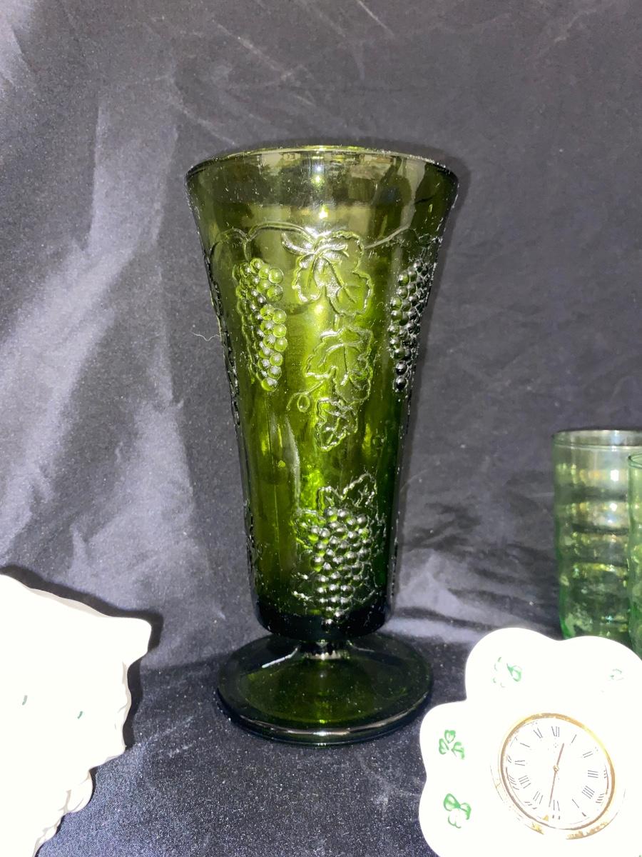 INDIANA GREEN GRAPE VASE, RETRO DRINKING GLASSES AND MORE