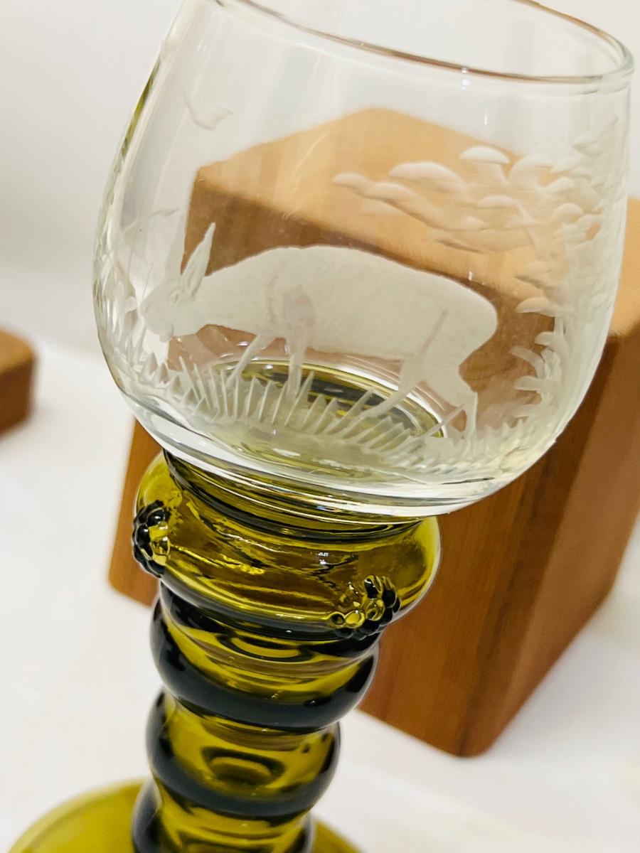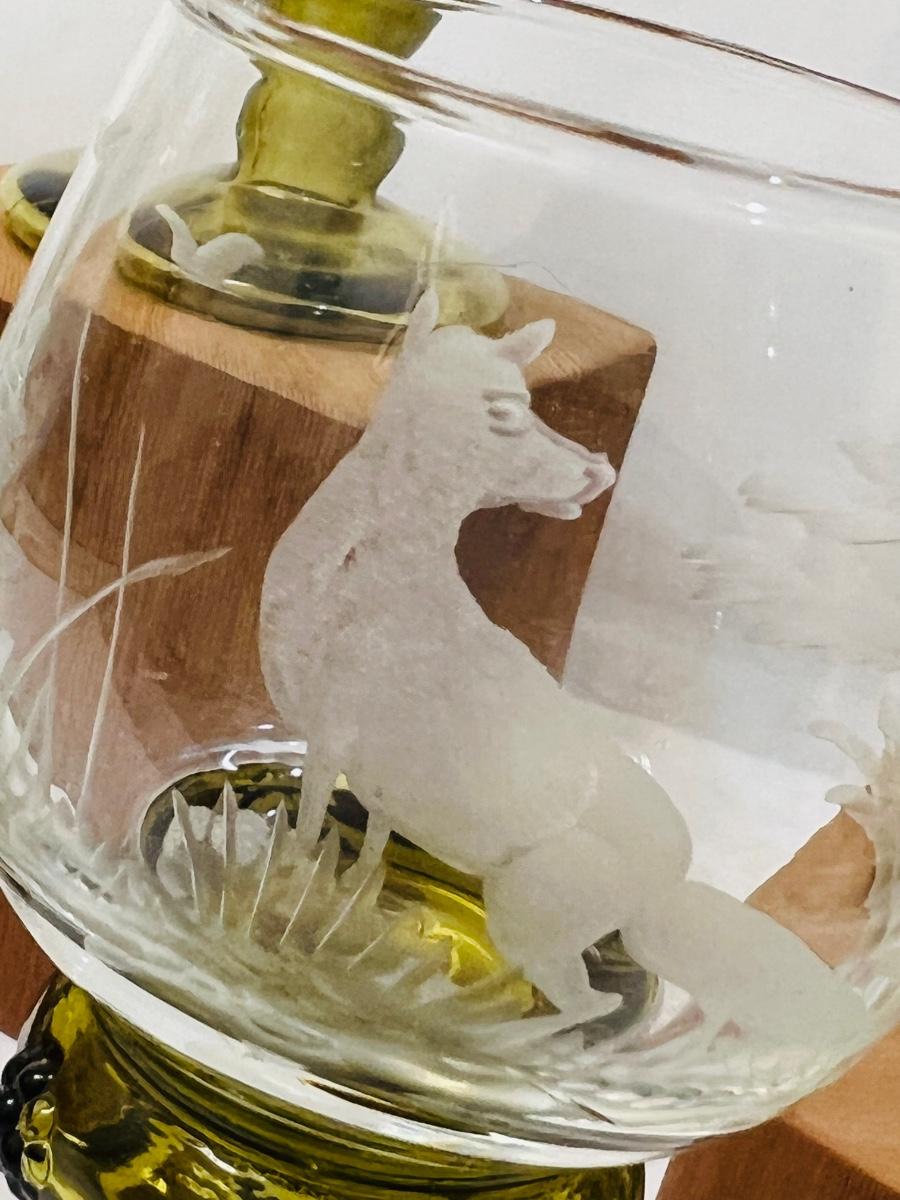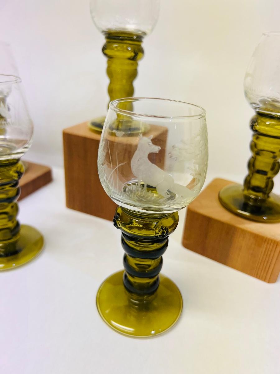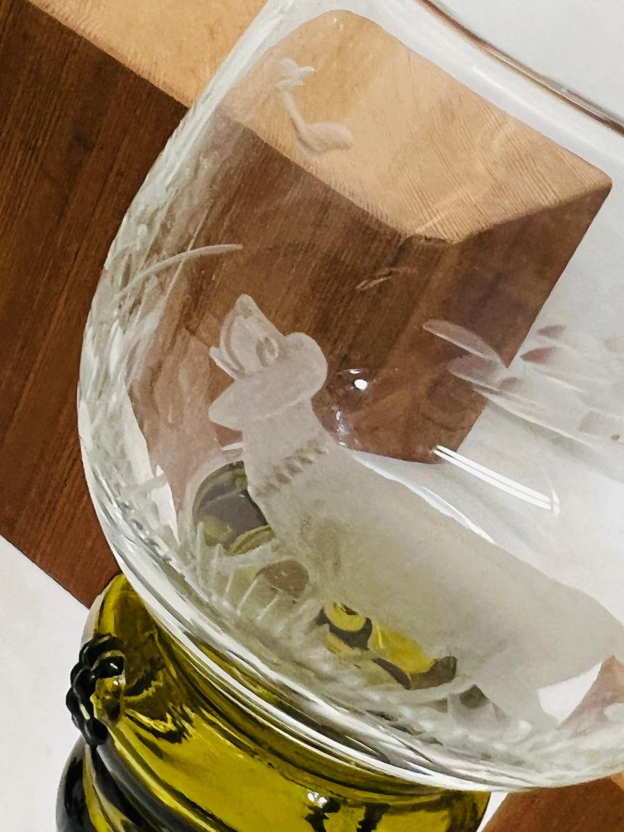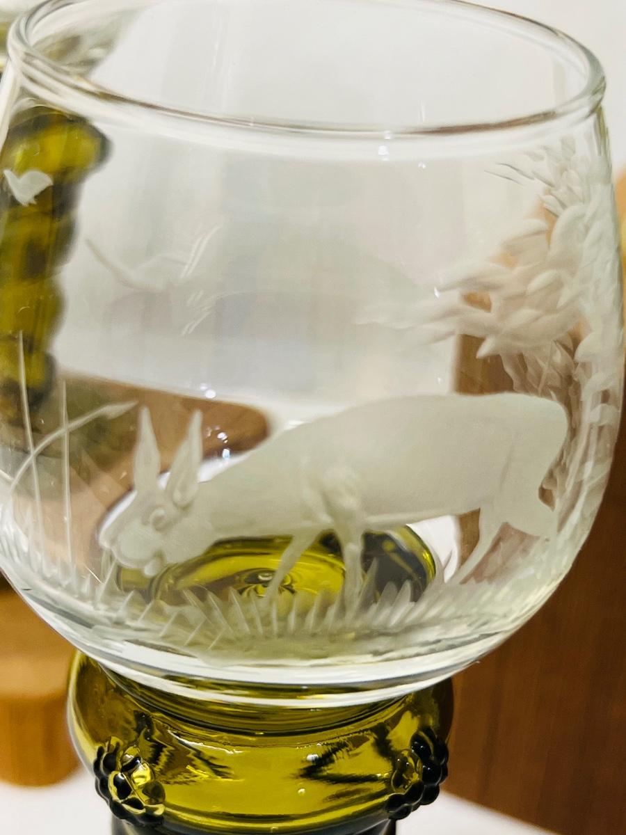 Vintage glasses with etched animals, green base - great condition. One glass has a very tiny chip on the bottom, cannot see without flipping glass