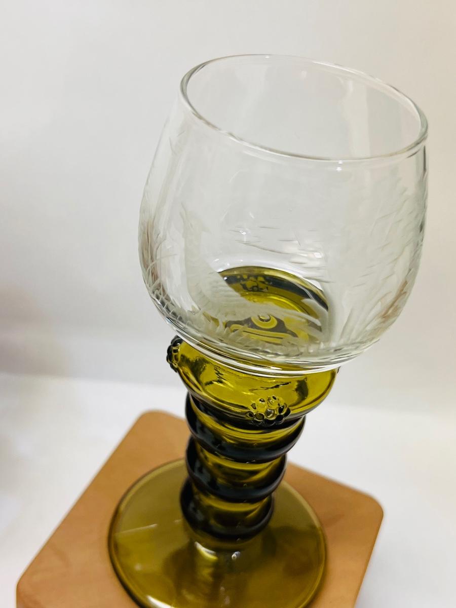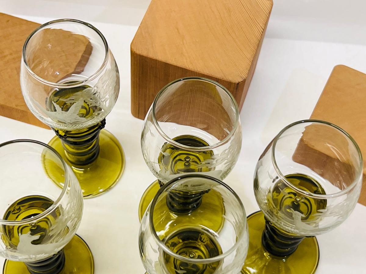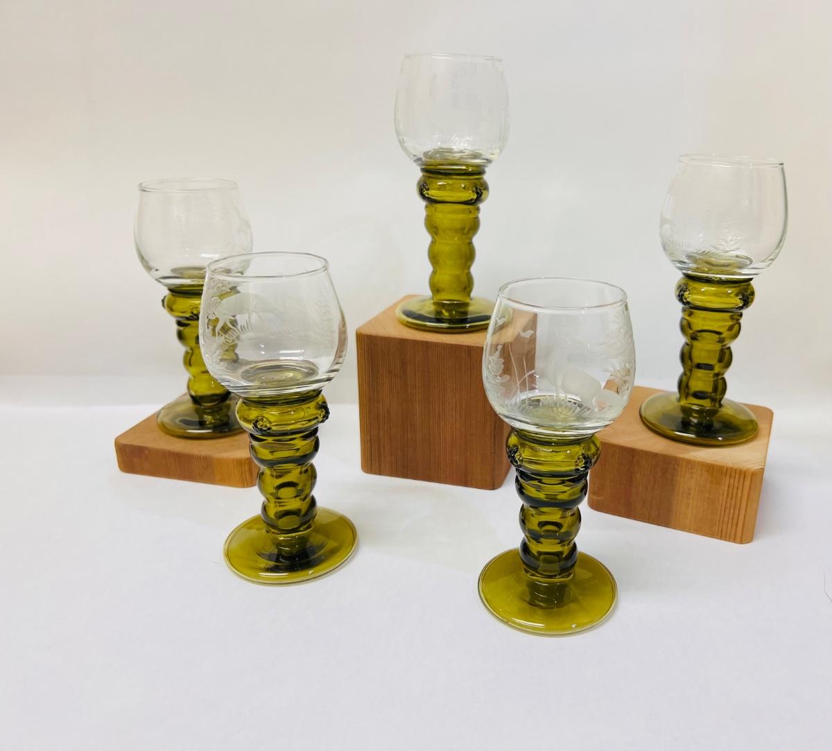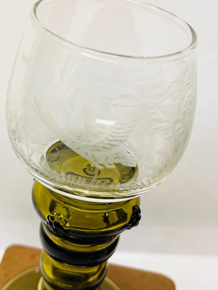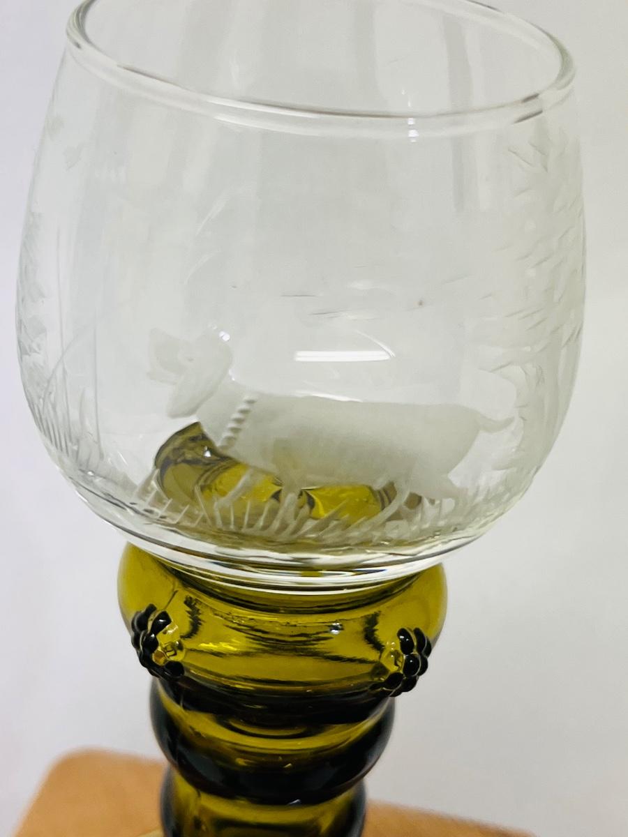 Vintage glasses with etched animals, green base - great condition. One glass has a very tiny chip on the bottom, cannot see without flipping glass