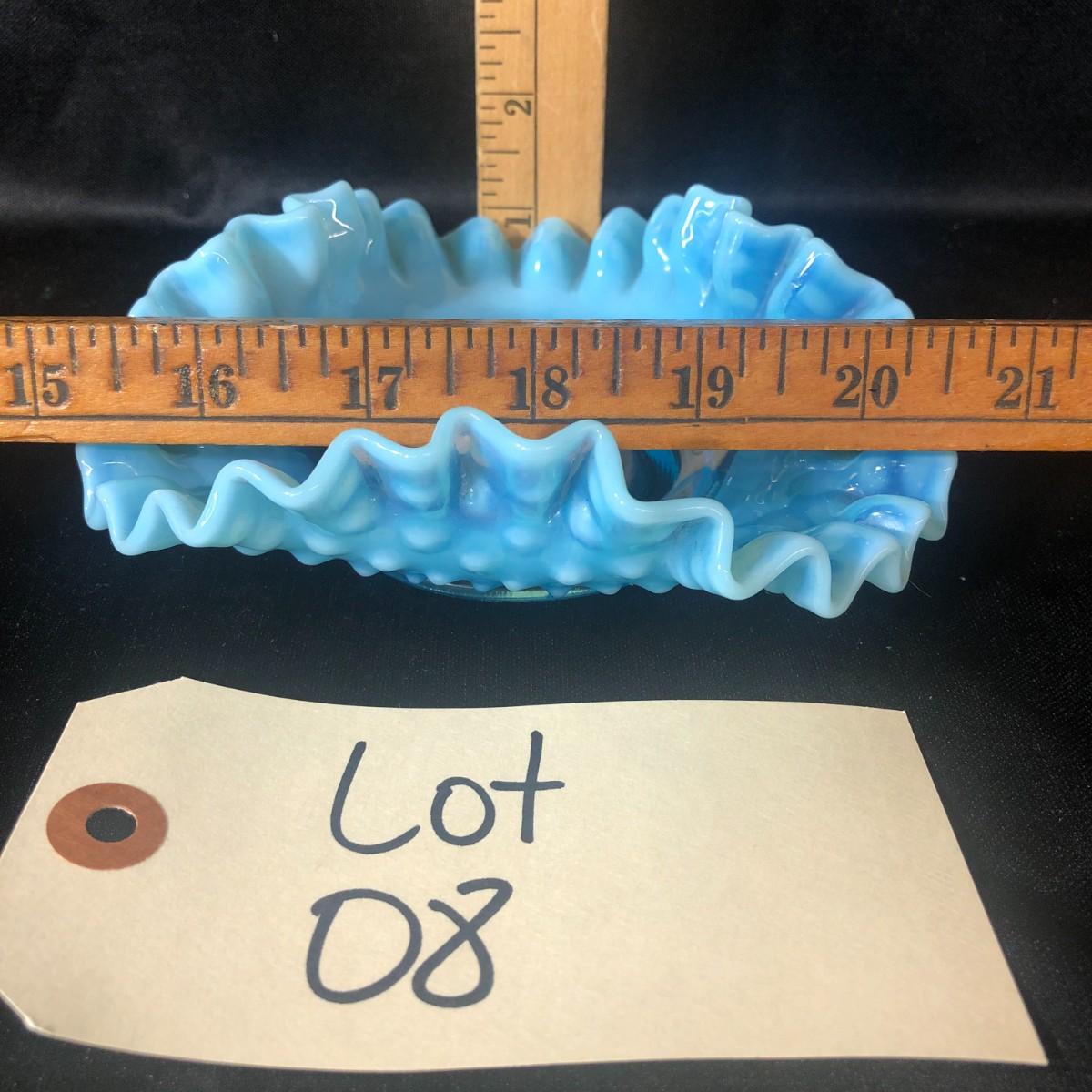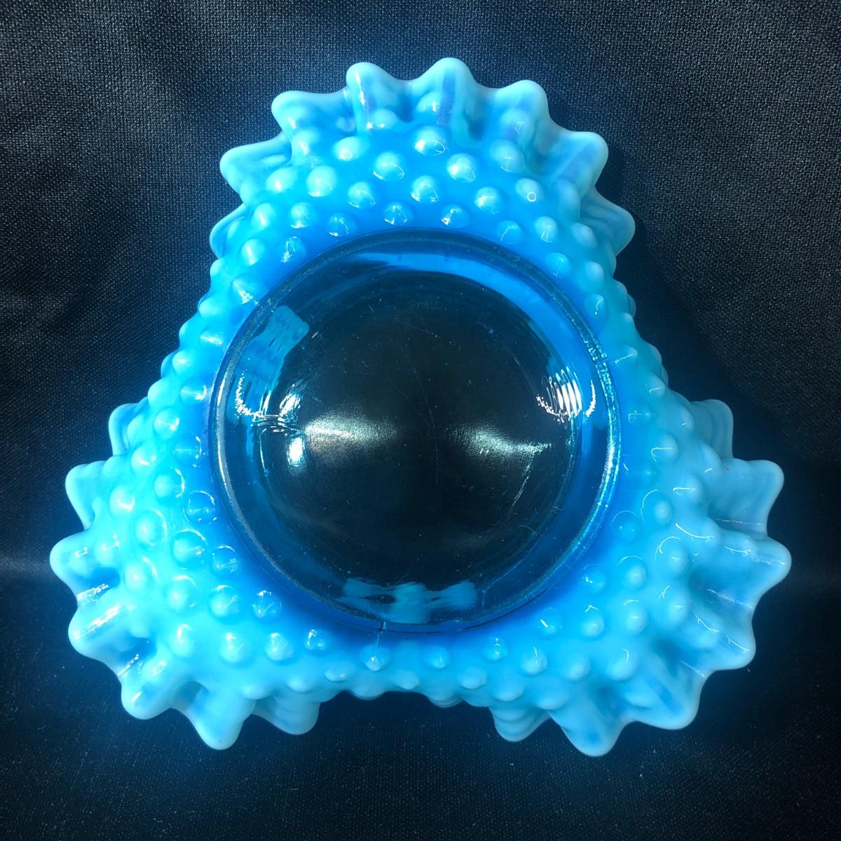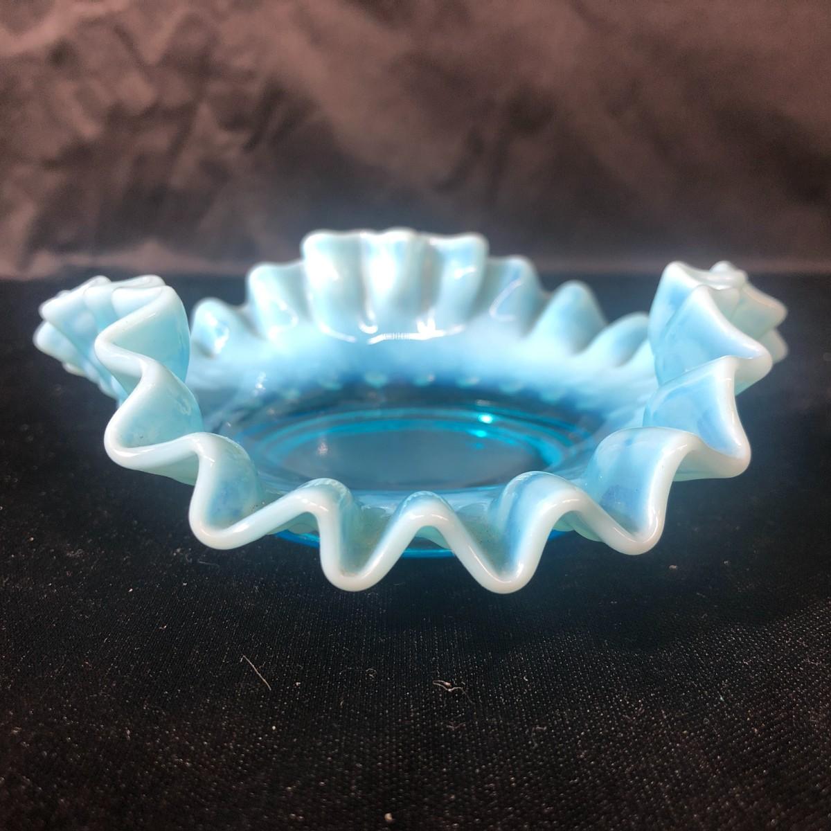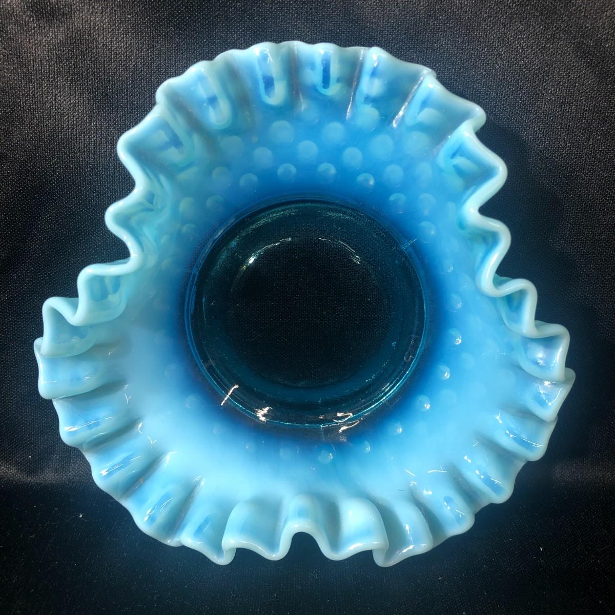 Older Fenton Blue Opalescent Glass Hobnail Bon Bon Double Ruffle