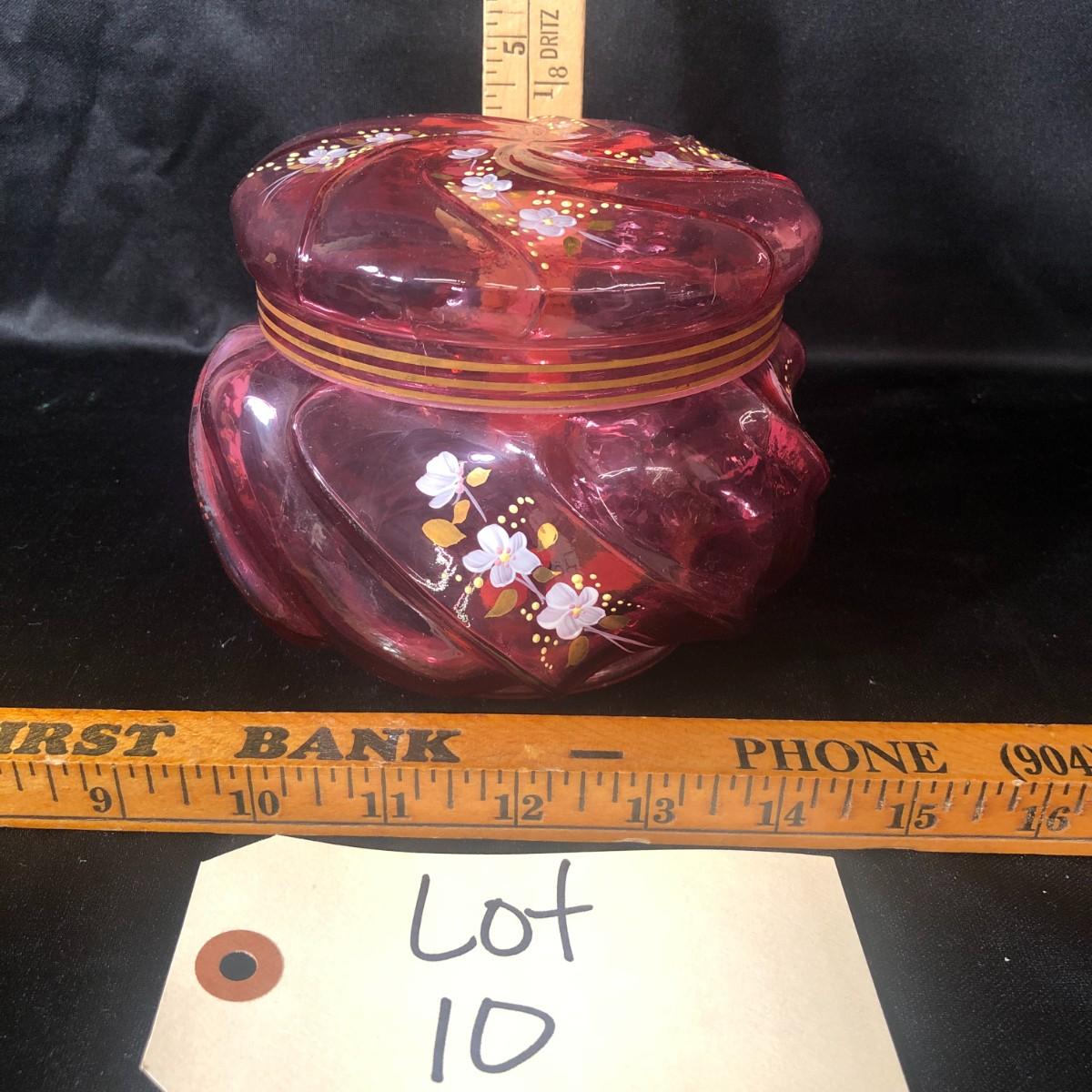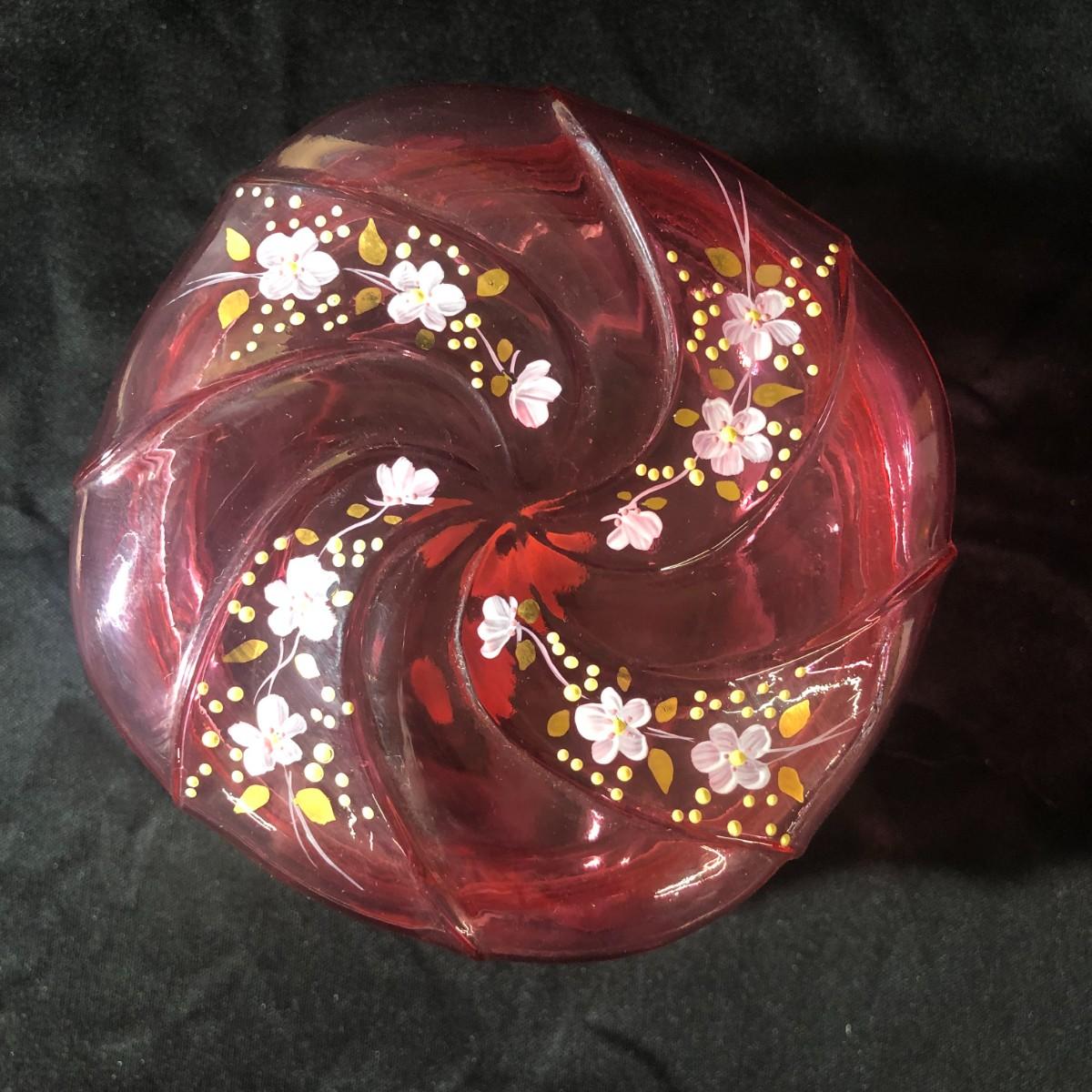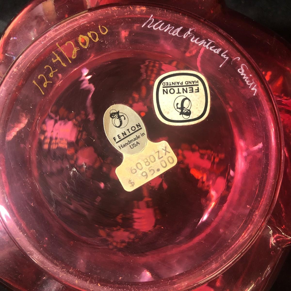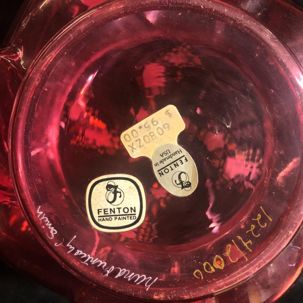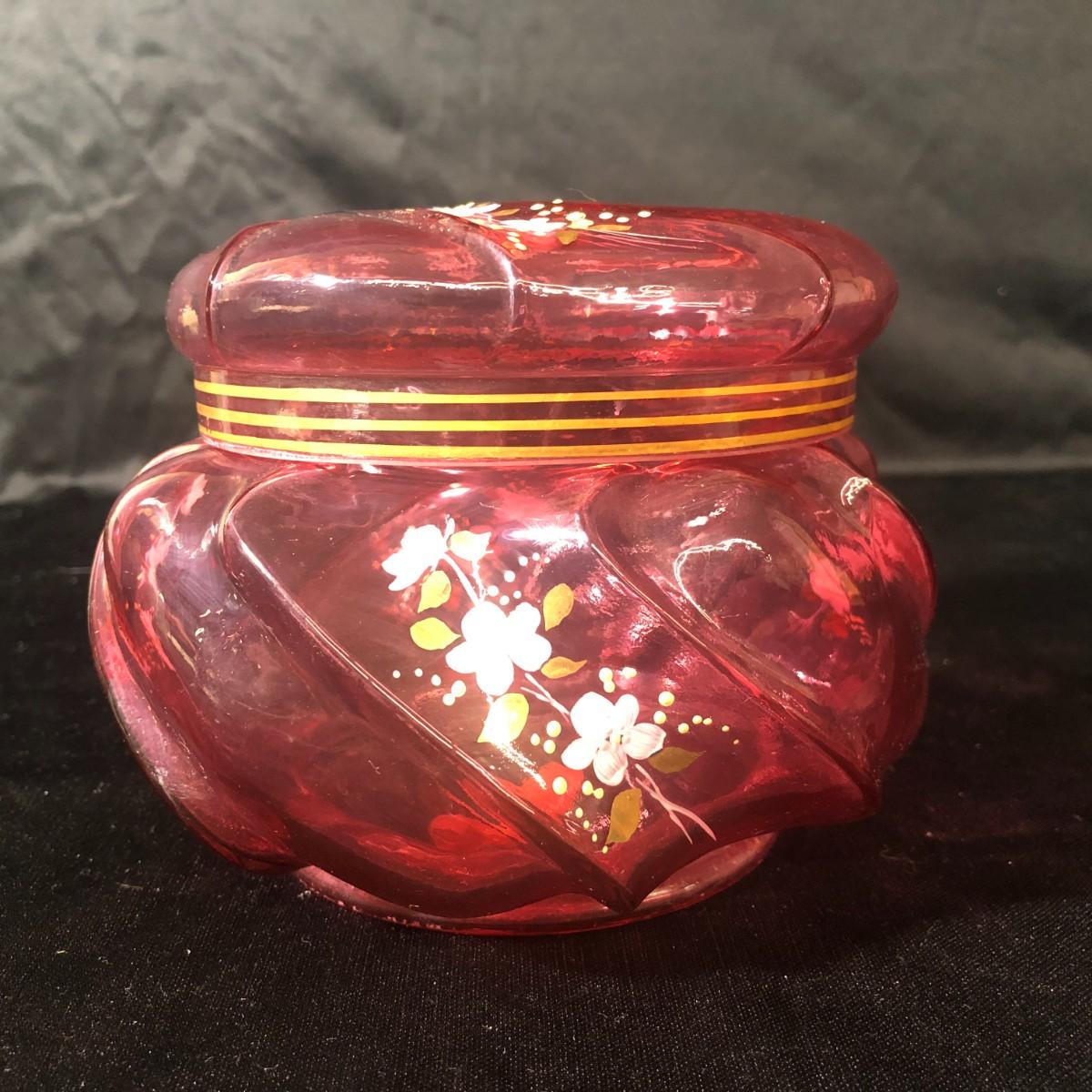 Fenton Hand Painted Cranberry Glass Helmschmid Swirl Dresser Jar Signed and Numbered C. Smith 1224/2000