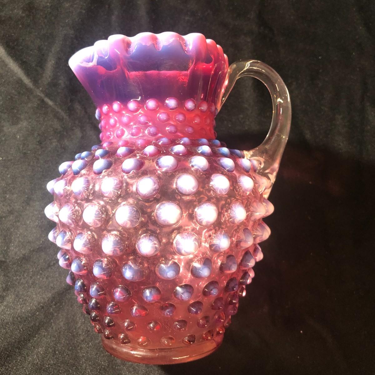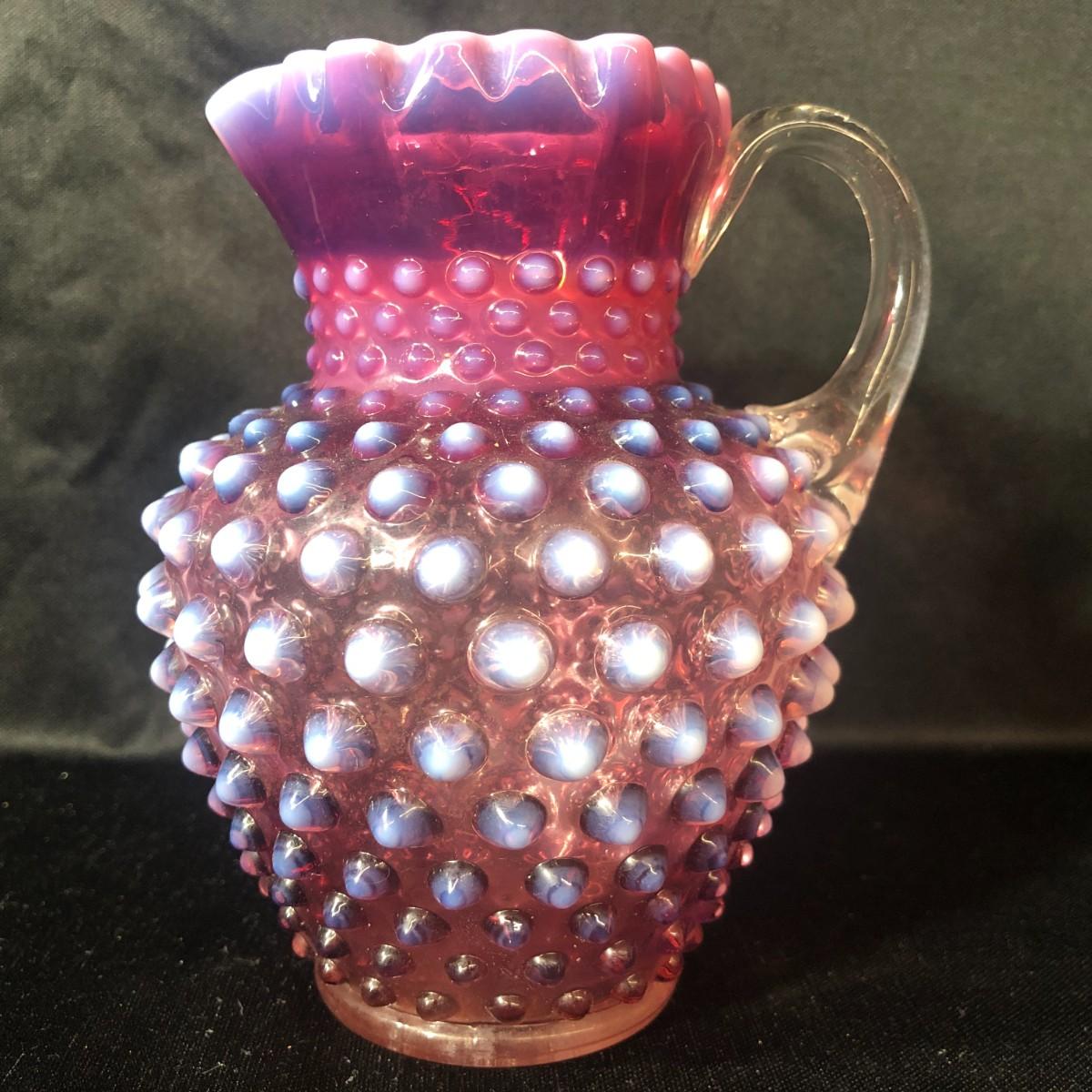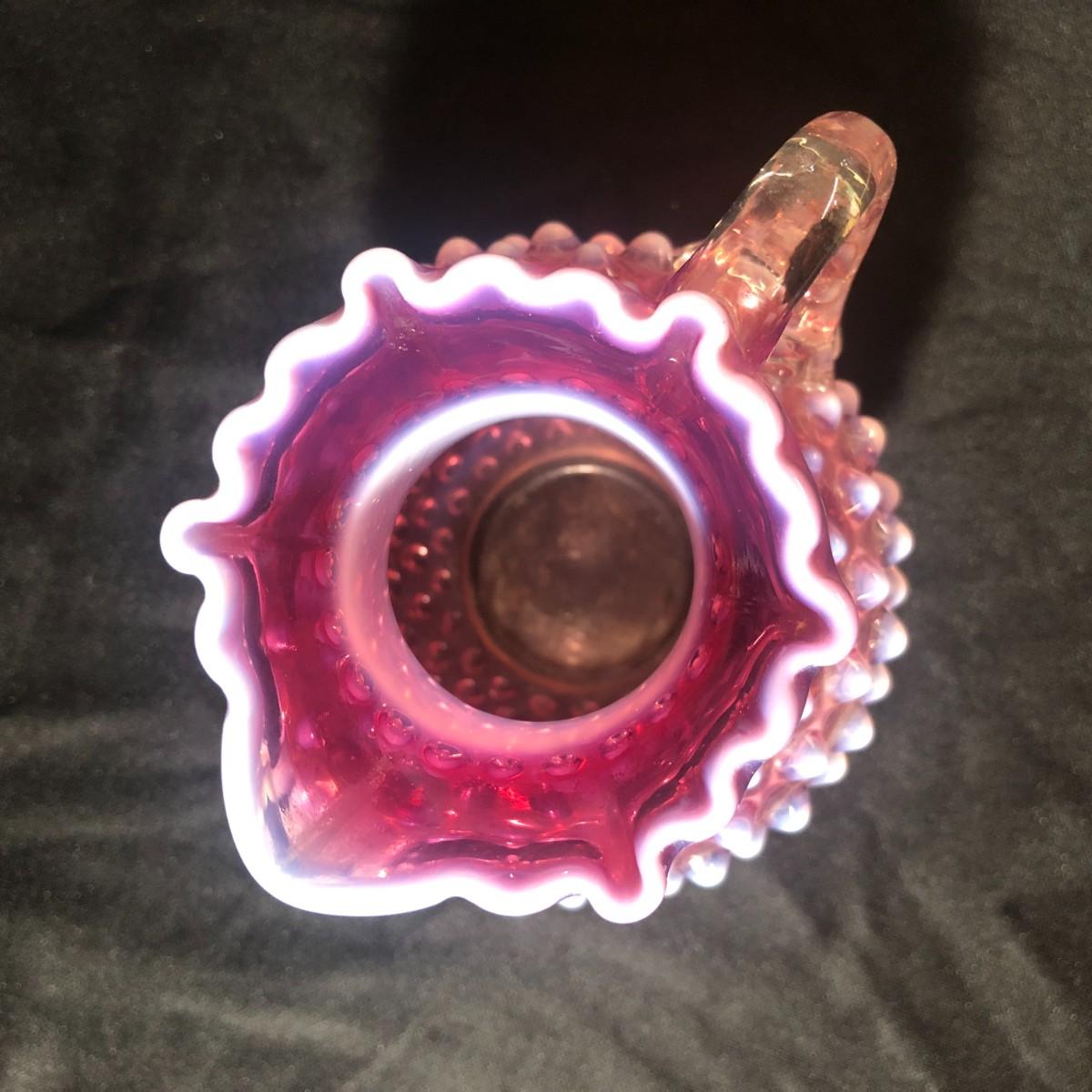 Fenton Hobnail Cranberry Opalescent Crimped Rim Syrup Pitcher