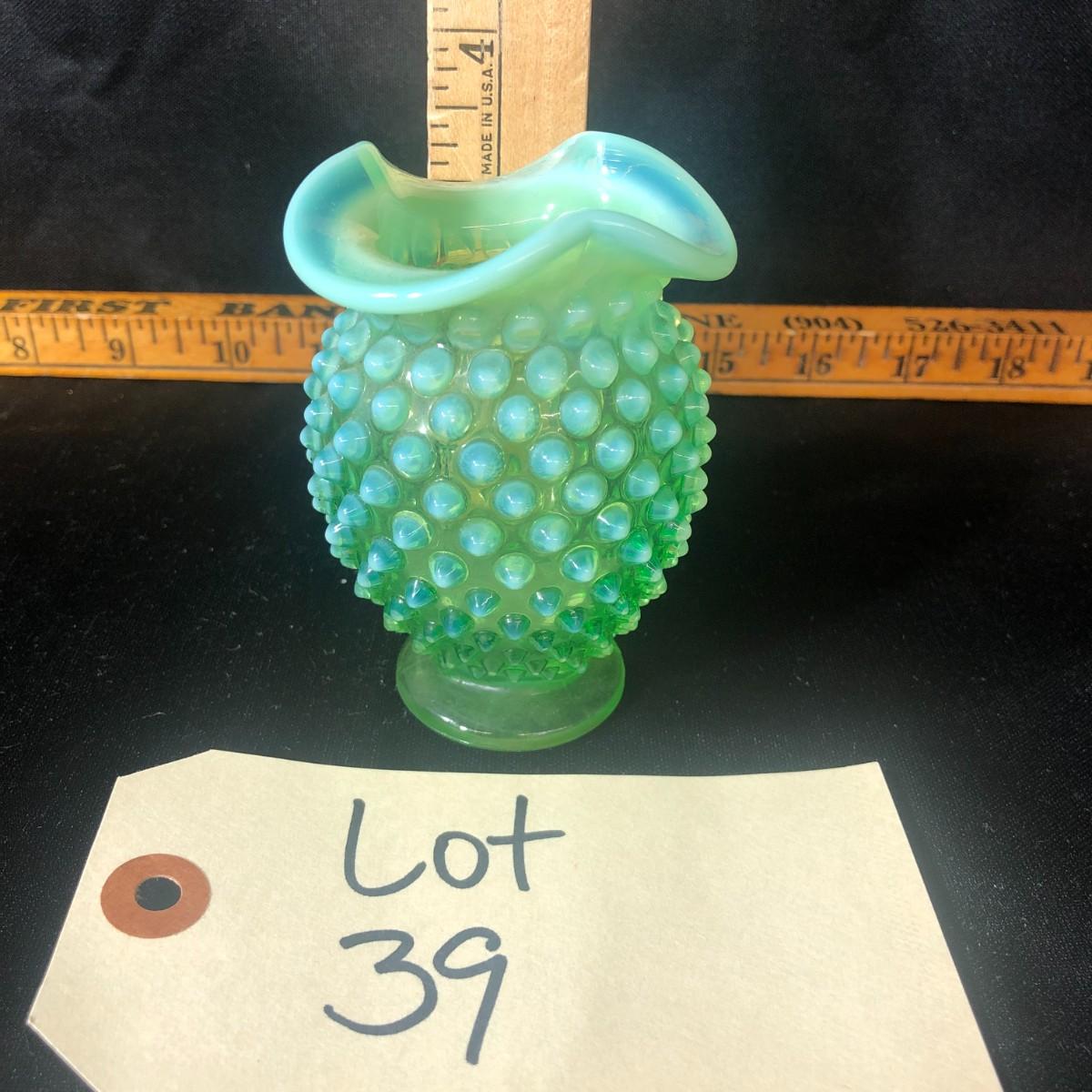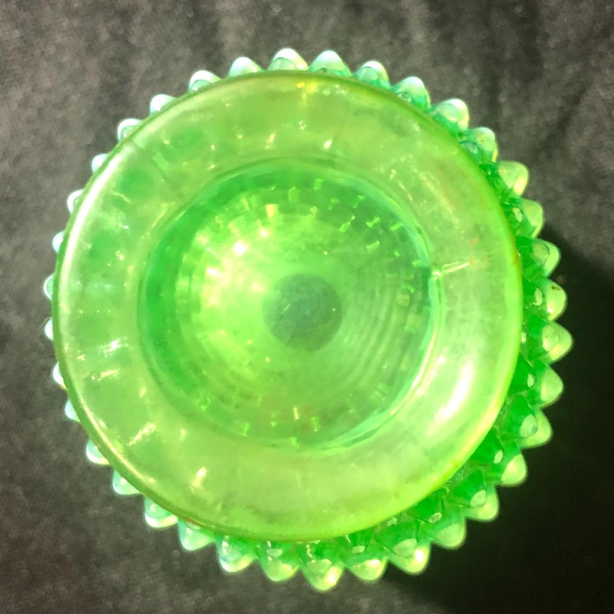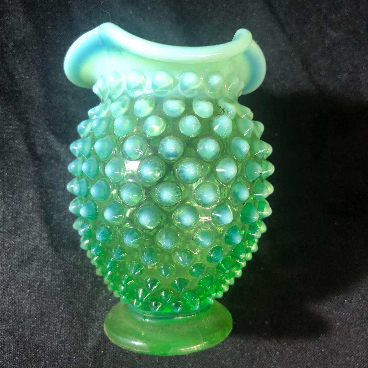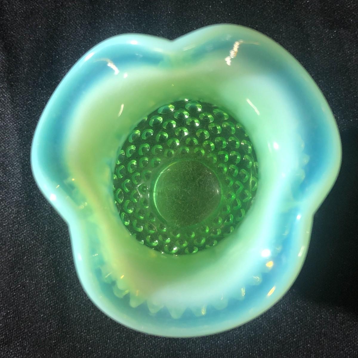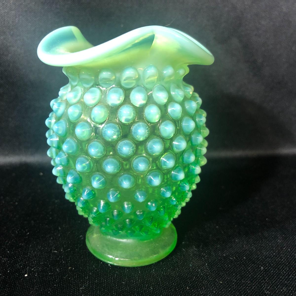 Fenton Green Opalescent Hobnail Crimped Top Miniature Vase